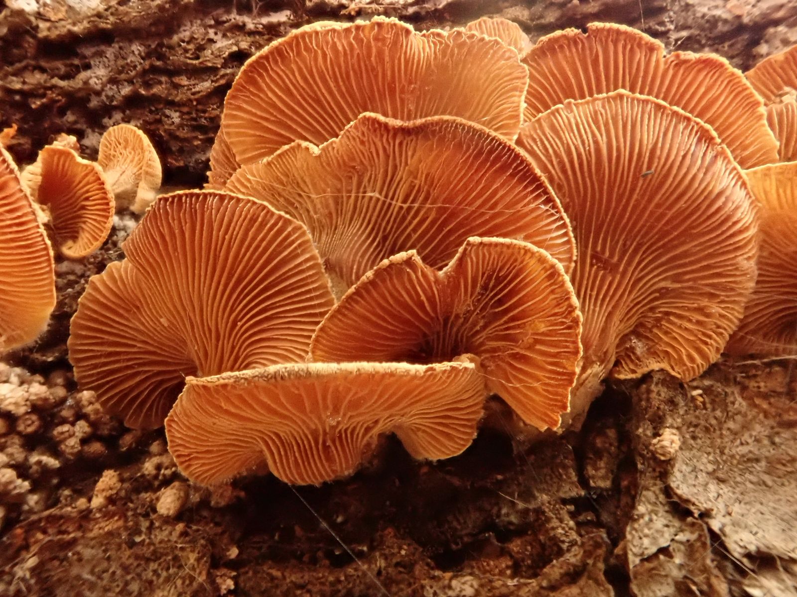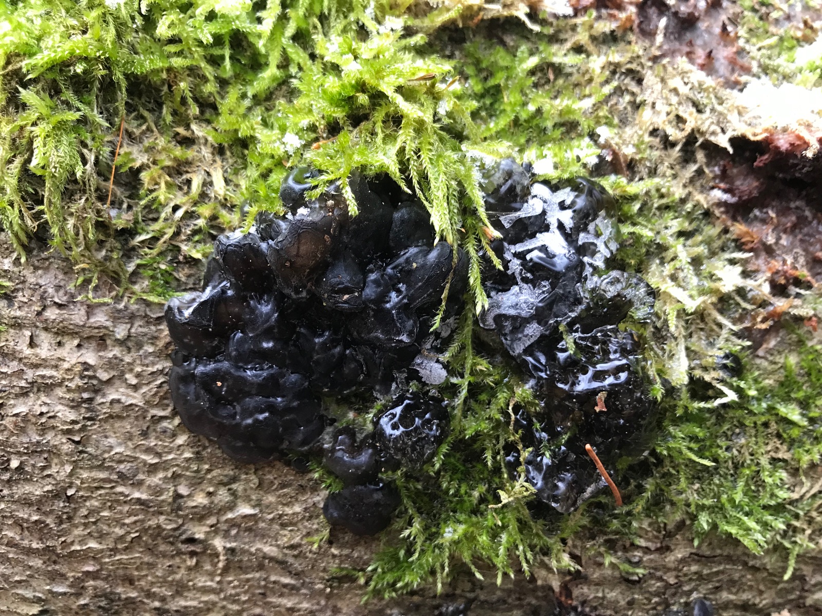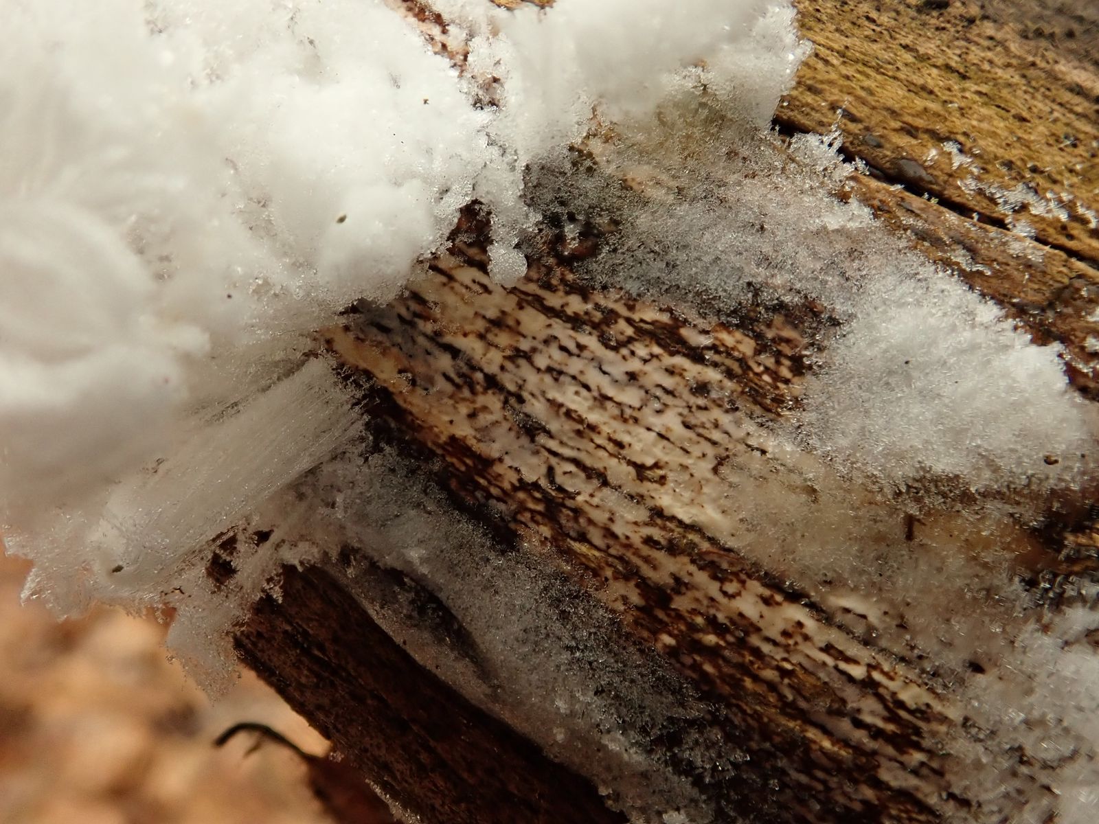Bei einem haben wir das Eis beiseite geschoben, damit man den eigentlichen Pilz - Exidiopsis effusa (Rosagetönte Wachskruste) sehen kann. Der ist aber leider nur ganz schwach rosa, eher weißlich.