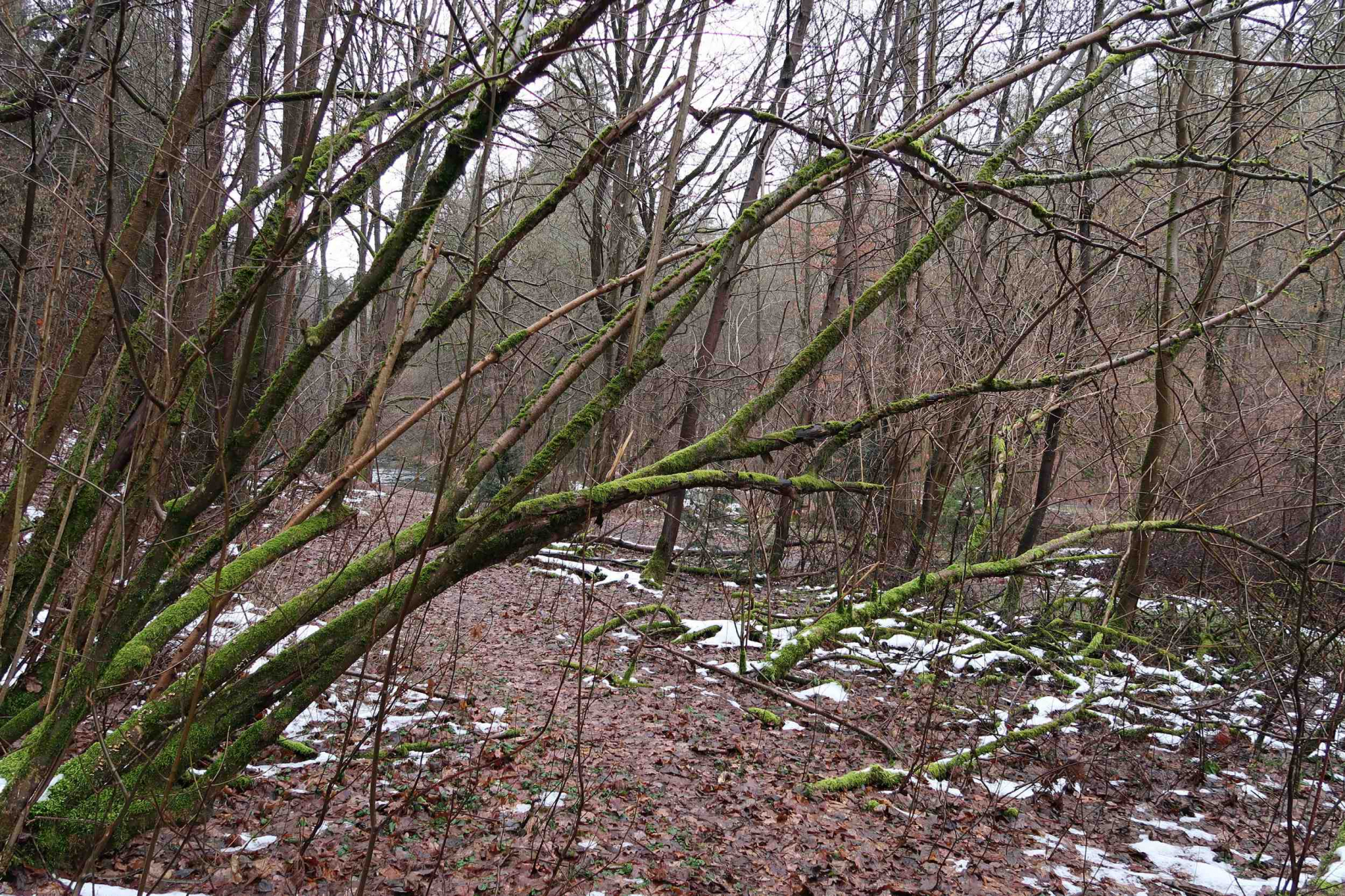 Auf dem Rückweg kam ich durch eine Art Gestrüpp. Hier wachsen angeflogene Pappeln, Hasel und Holunder. Teilweise komplett abgestorben und dick bemoost.