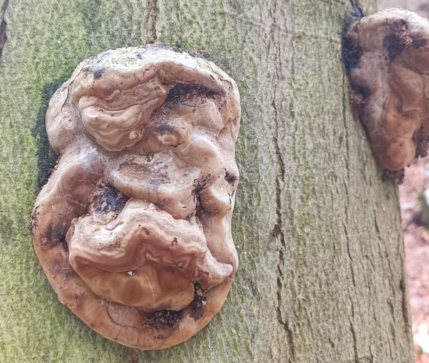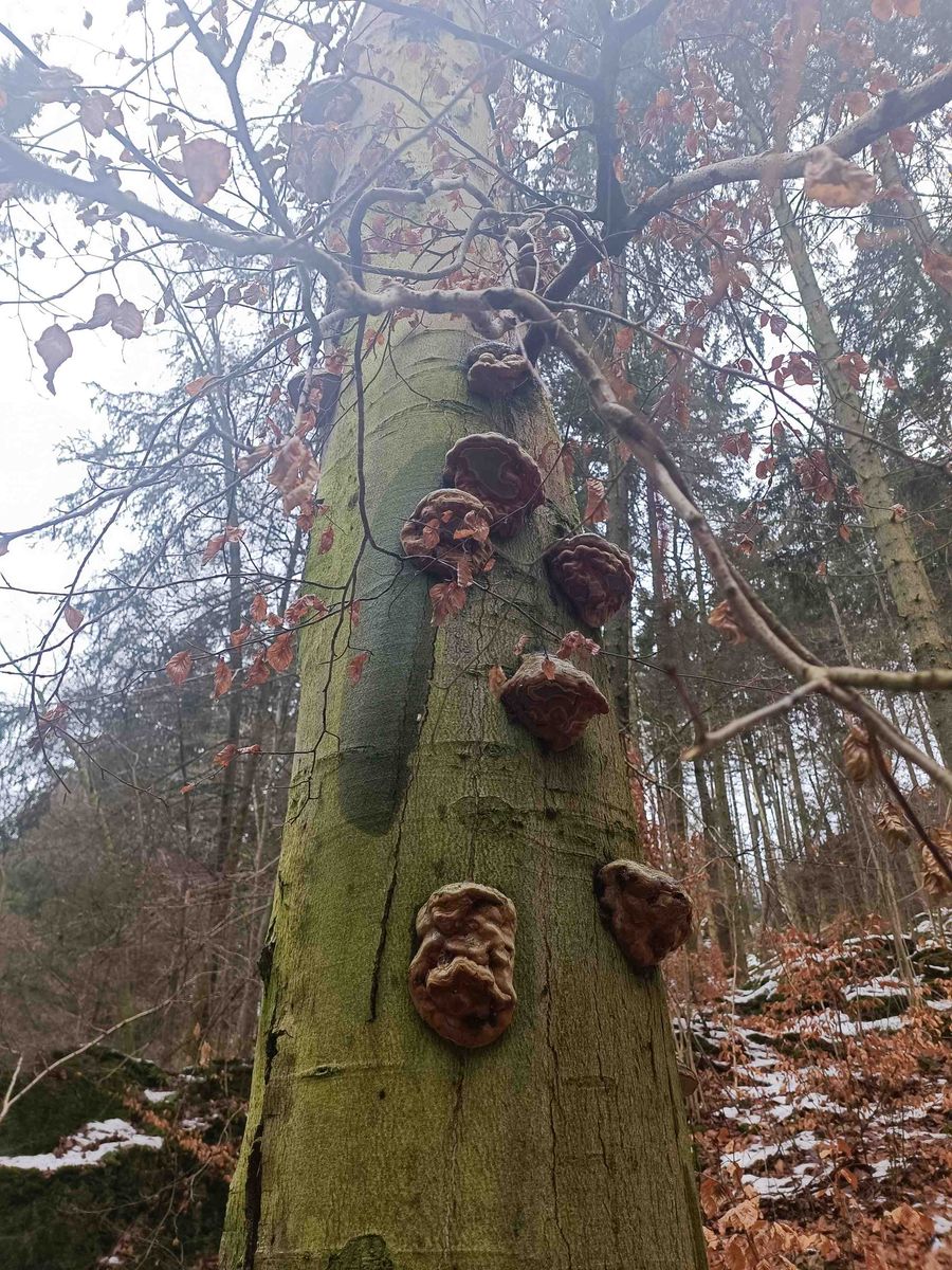 An anderer Stelle fand ich an einer Buche Fomes fomentarius, den Zunderschwamm. An sich nichts Besonderes. Allerdings fiel mir auf, dass an allen Fruchtkörpern Deformierungen vorhanden sind. Unten am Stamm haben alle Pilze Deformierungen, weiter oben am Stamm sind sie normal ausgebildet. So in der Art und Weise ist mir das noch nie aufgefallen. Oder habe ich Denkfehler?