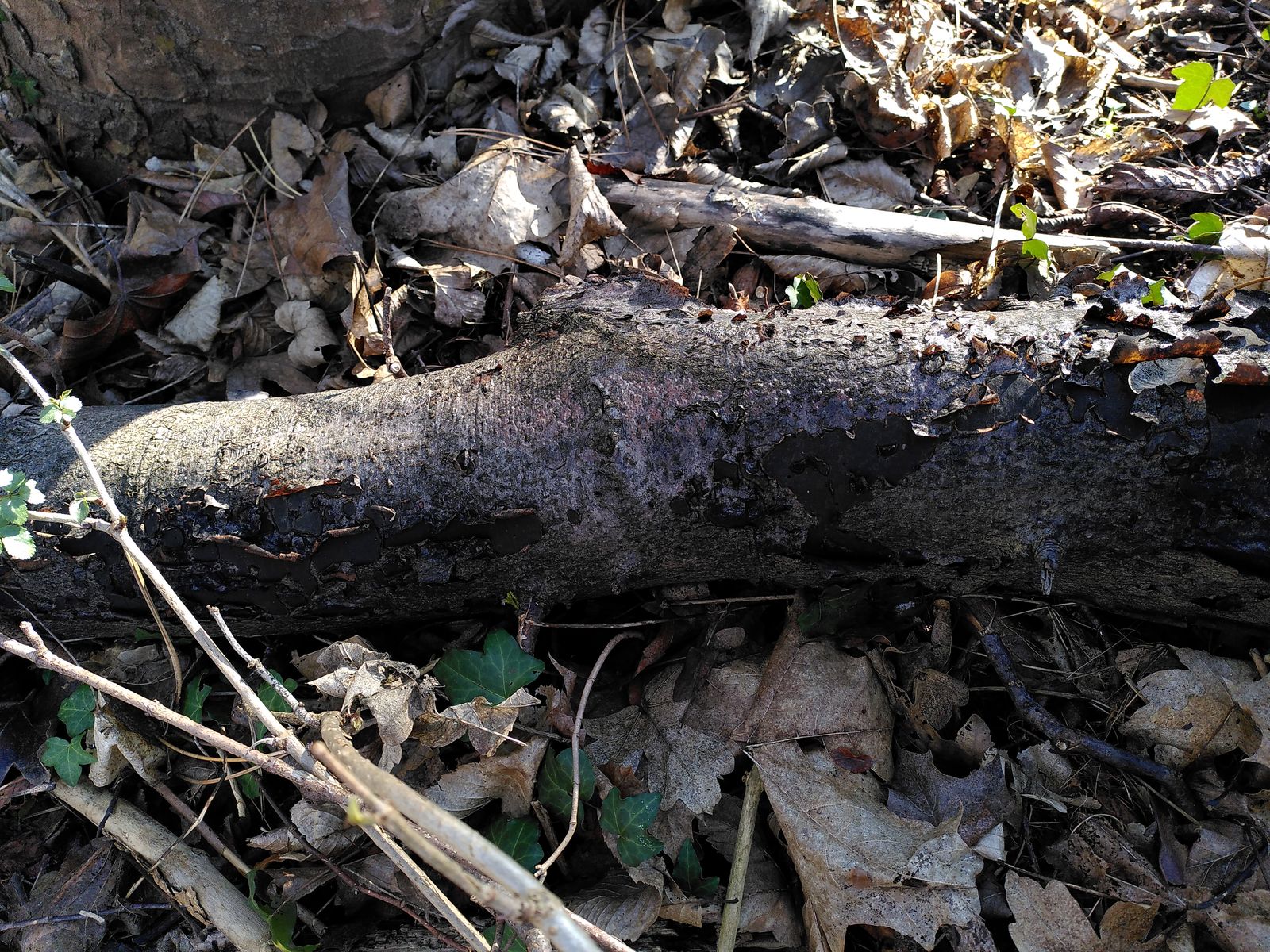 ich habe diesen flächigen, schwarzen, punktierten Fruchtkörper im Auwald an Holz wachsend gefunden. Beim Substrat bin ich mir ziemlich sicher, dass es sich um eine Rotbuche handelt. Die Punkte habe ich als Perithecien gedeutet. Deshalb habe ich bei den Pyrenomyceten geschaut und mit Diatrype stigma eine flächig auf Buche vorkommende Art gefunden. Kann ich den Fund makroskopisch so ansprechen oder gibt es Zweifel? Mir fehlen speziell die in der Literatur beschrieben, typischen Risse im Stroma.