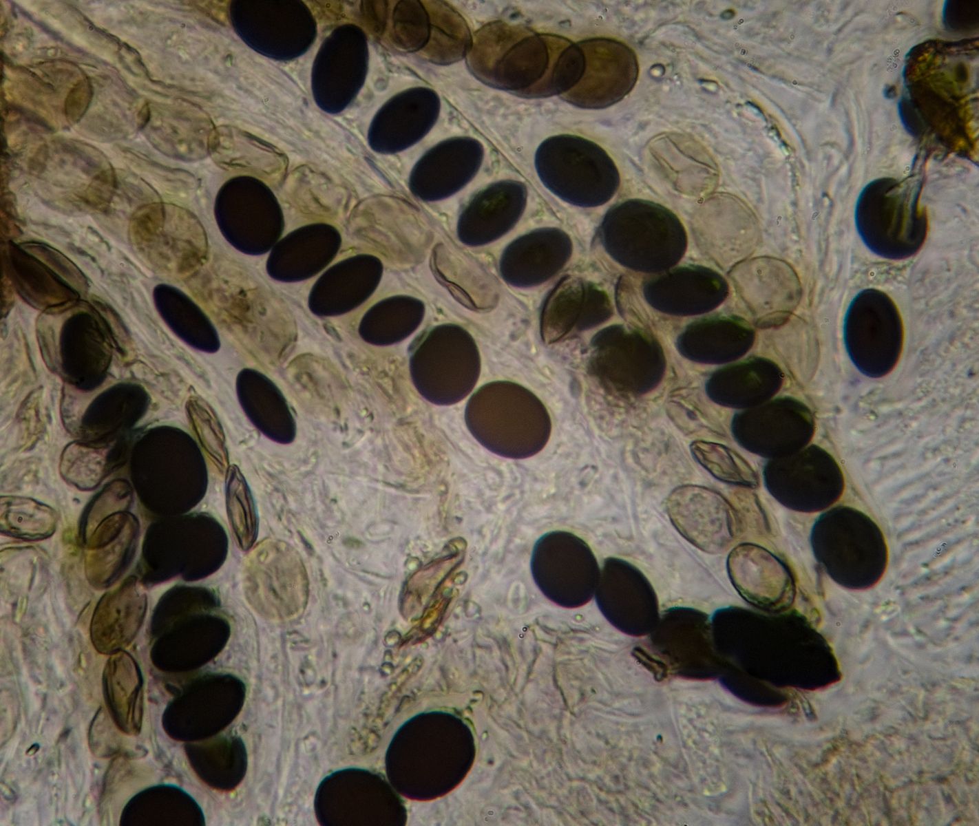Die Sporen sind Diskus-förmig und haben einen Keimspalt auf der Flachen Seite, Ihre Maße betragen 16,3 - 18,4 x 13-15,7 x 8,5-10 µm