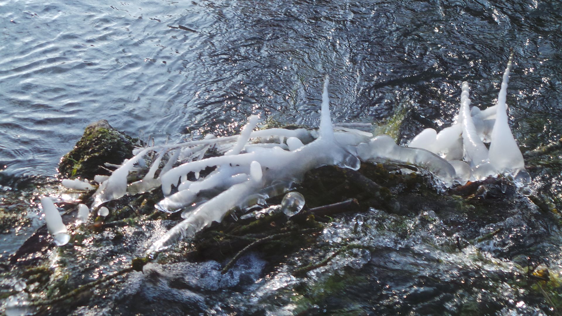 Schöne Bacheiskunst, Radelfungus! So war’s hier heute auch, aber ich hatte das Handy vergessen. Die Zapfen sind diesmal auch hier milchig. Den Anfang machte der nasse Schnee, deshalb sind sie vermutlich nicht klar.