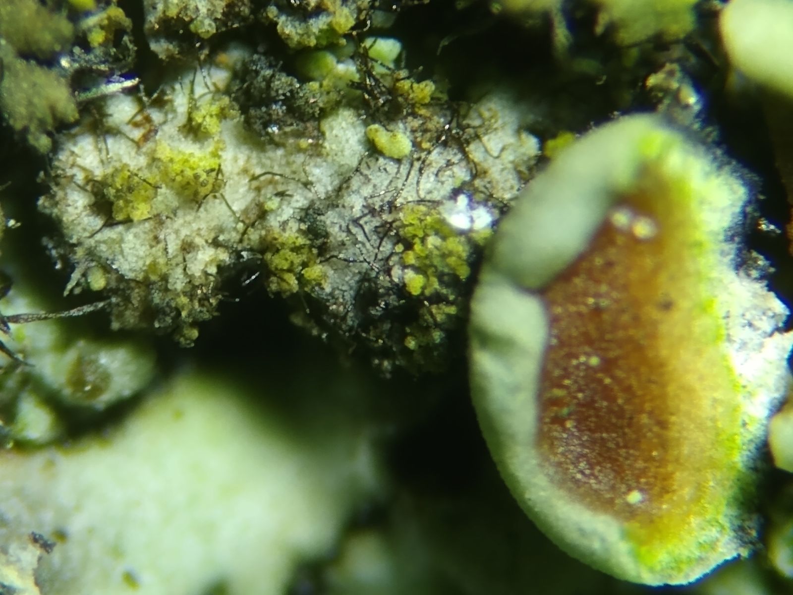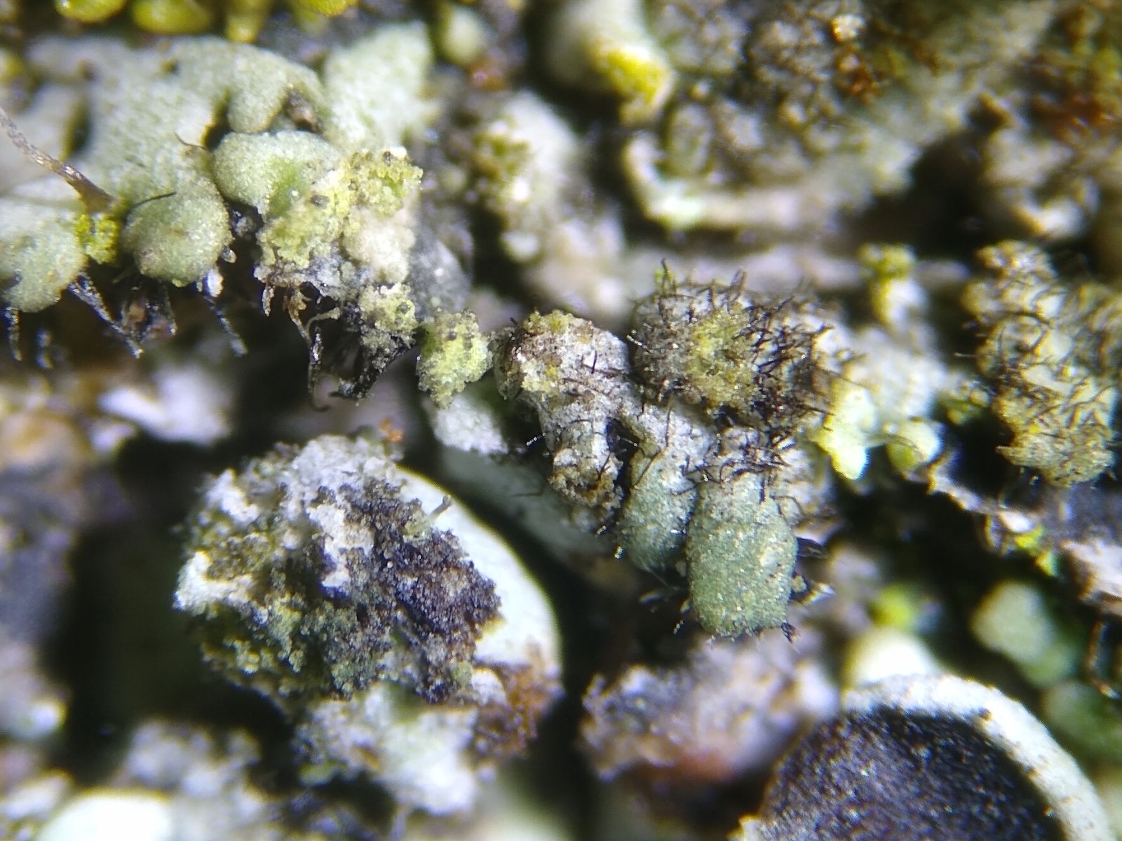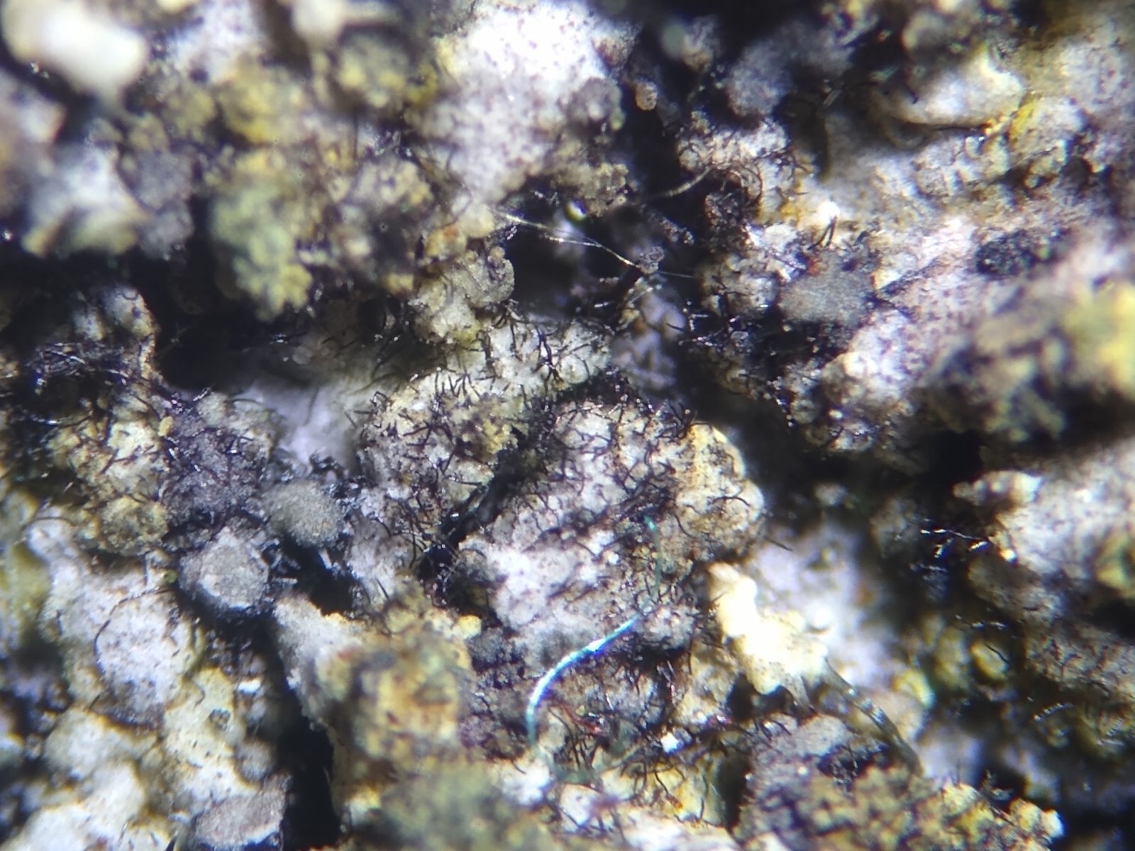Auf den Flechten finden sich kurze dunkle Härchen in großer Zahl.