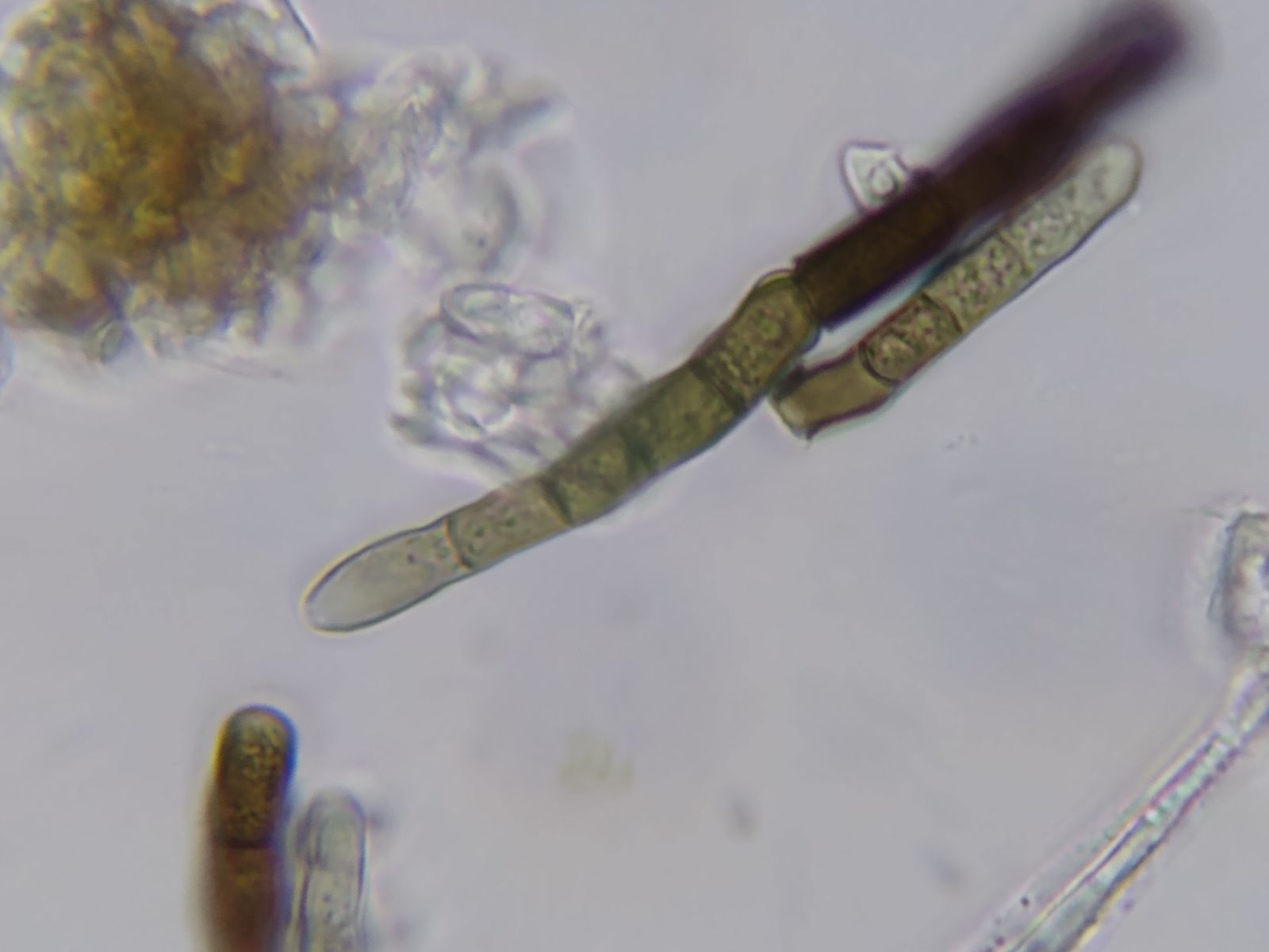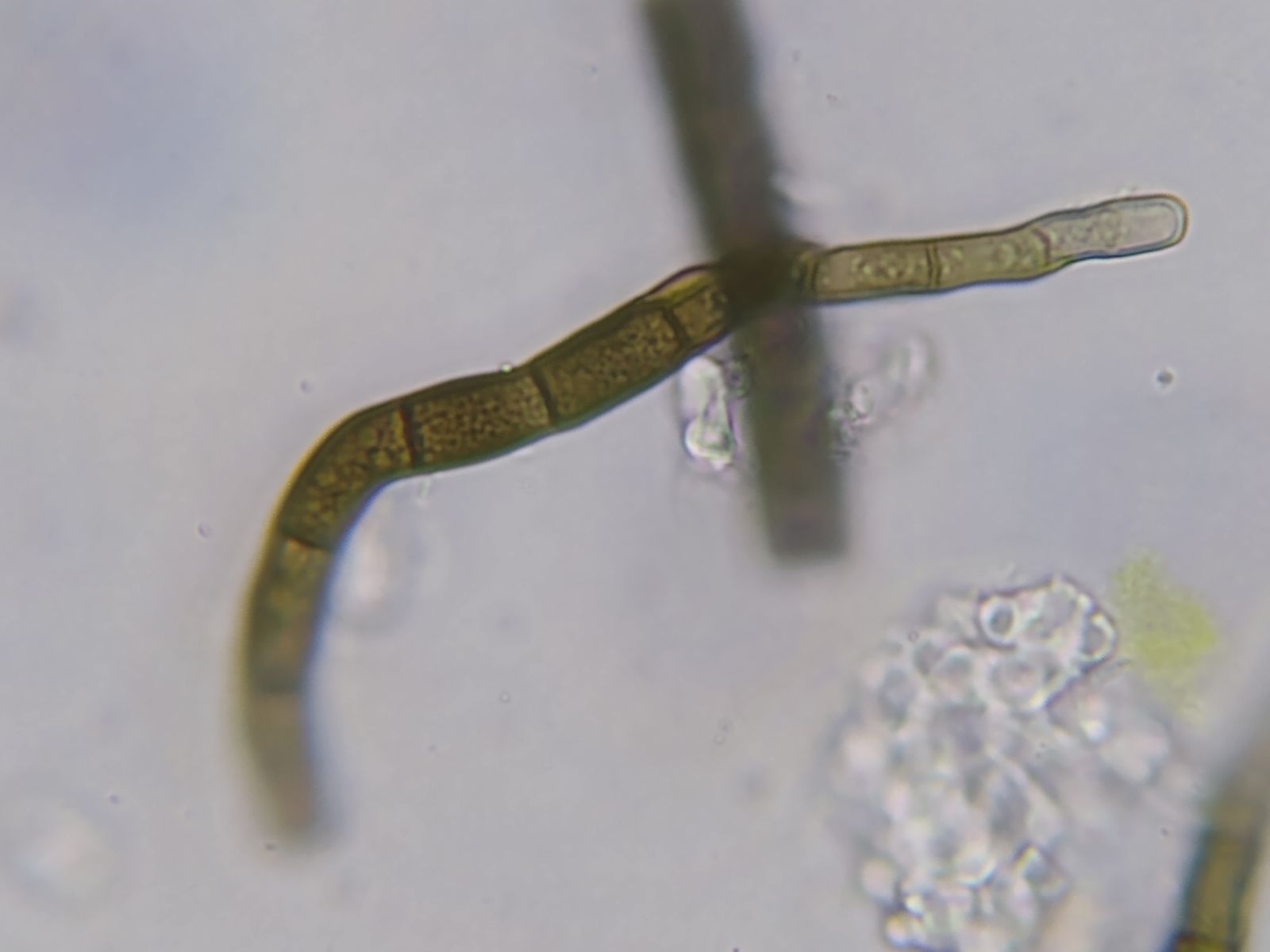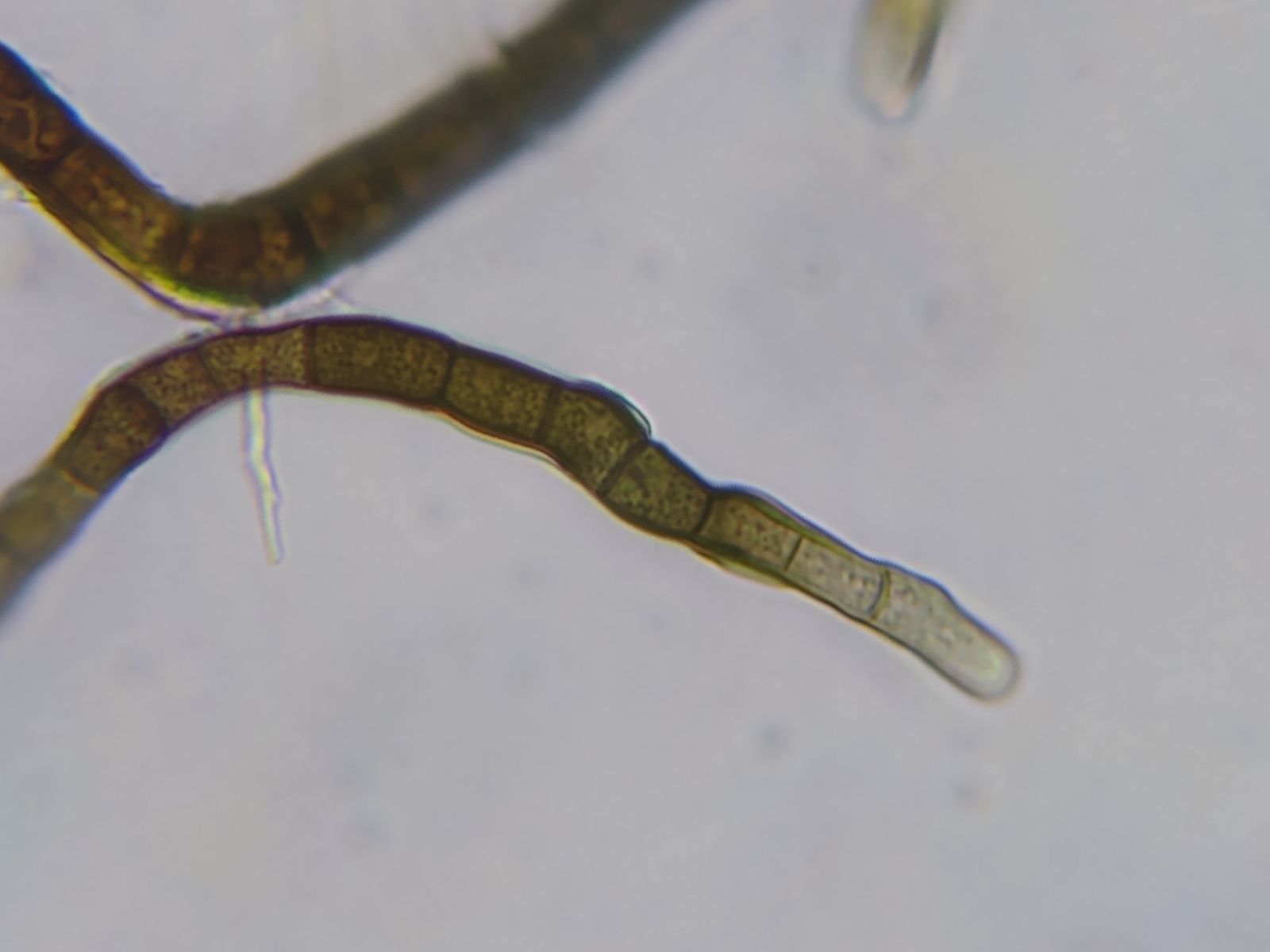 Offenbar die Konidienketten von Teaniolella phaeophysciae, einem lichenicolen Pilz, der auf Phaeophyscia orbicularis und verwanden Flechtenarten und -gattungen vorkommt.