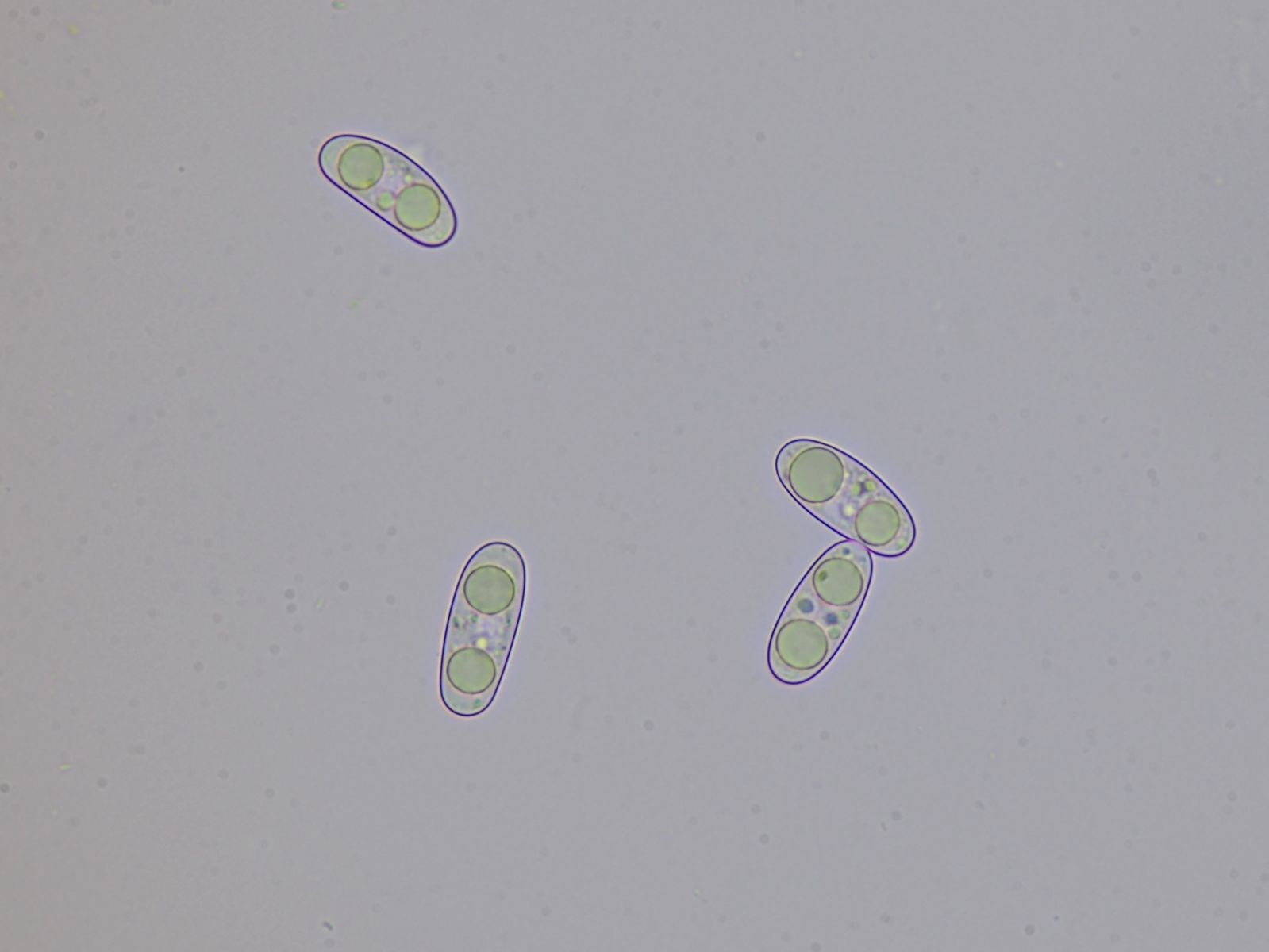 die Sporen sind bei dieser Art typischerweise in der Seitansicht "brotförmig", sprich sie haben eine gerade und eine gekrümmte Seite.