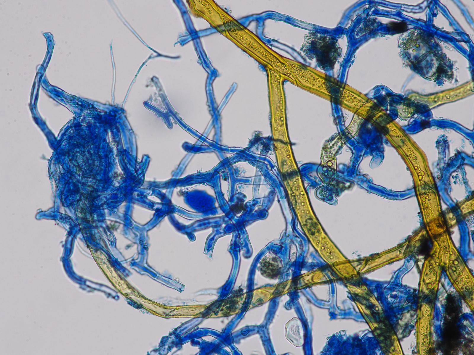 Infektion: gelbbraun die Rhizoide des Mooses; in Baumwollblau/Milchsäure gefärbt die Hyphen welche sich zu einem spezialisierten Haftorgan dem sog. Appressorium ausbilden um in den Wirt eindringen zu können.