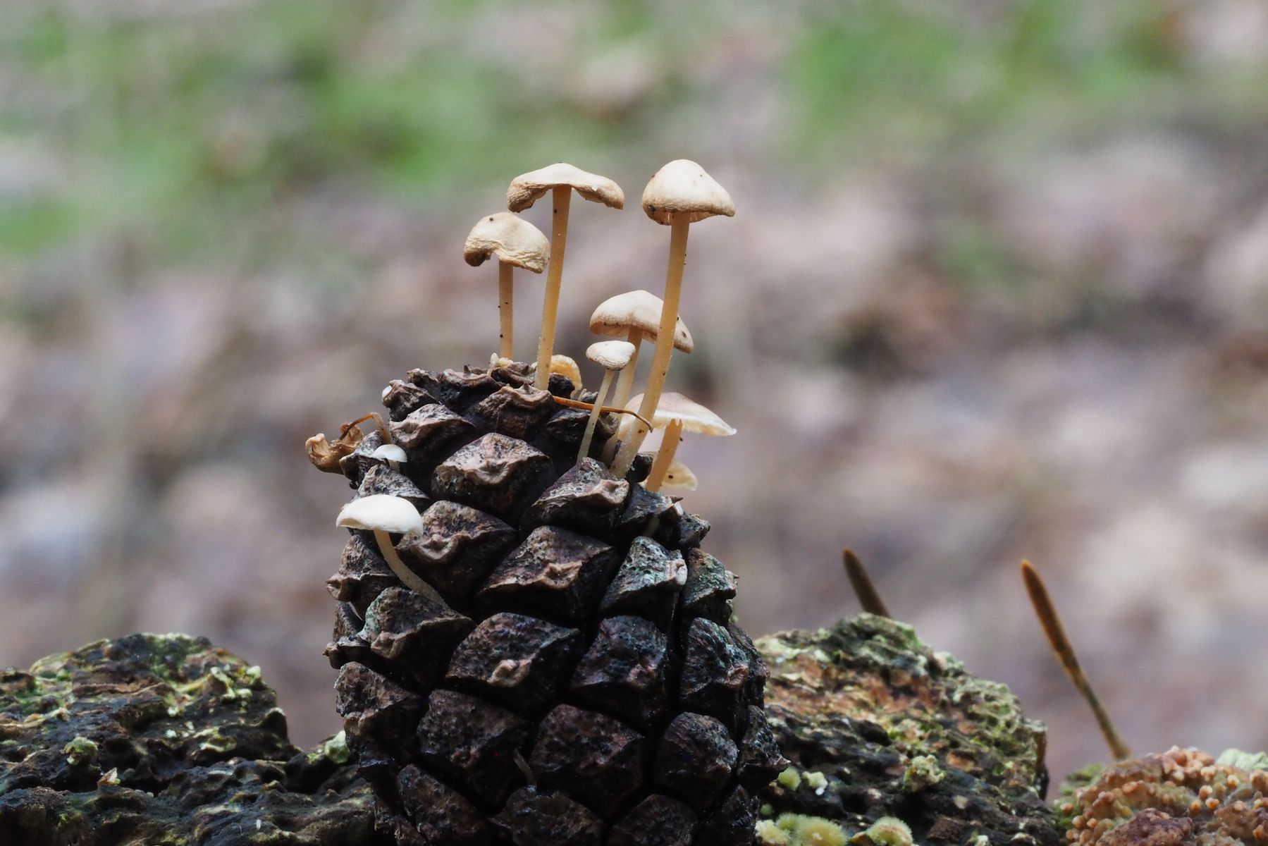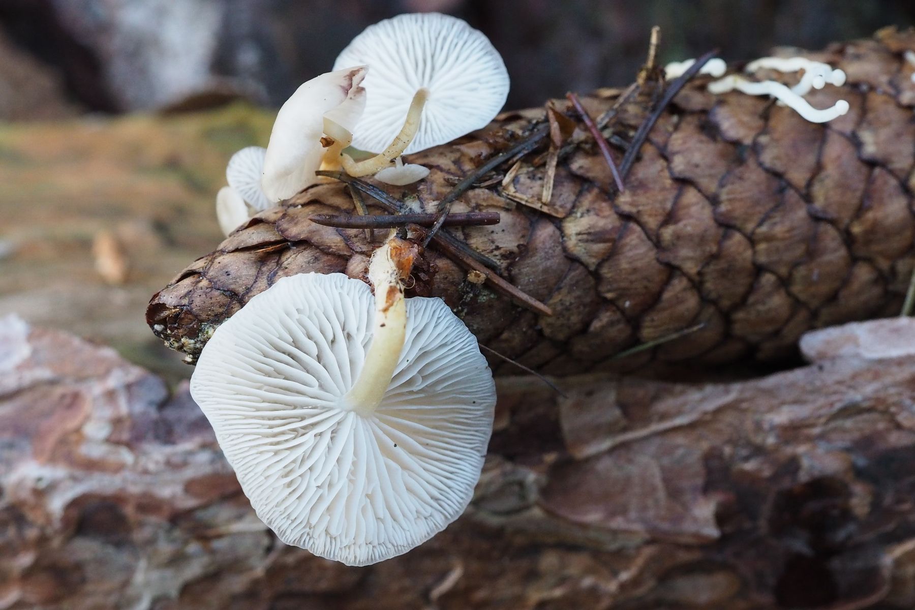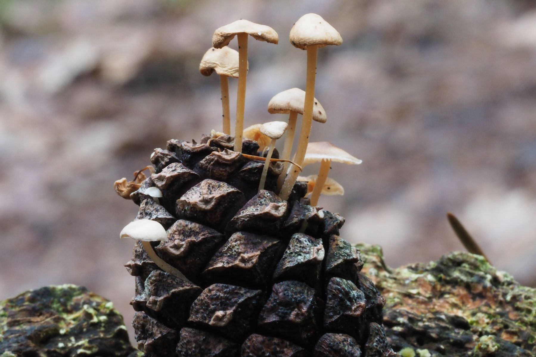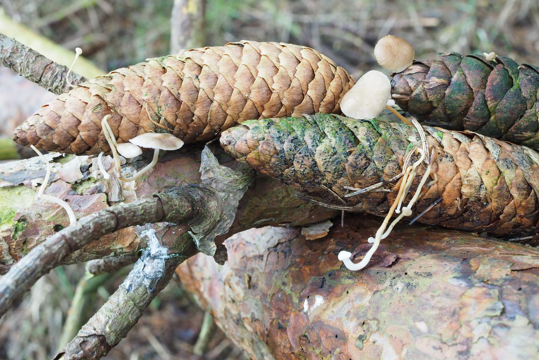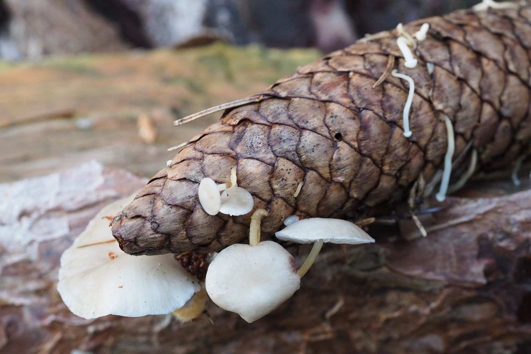 Und könnte es sich bei den auf den nächsten beiden Fotos auf Kiefernzapfen wachsenden Pilzen um die gleiche Art handeln?