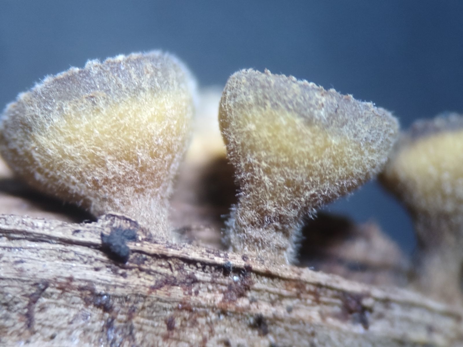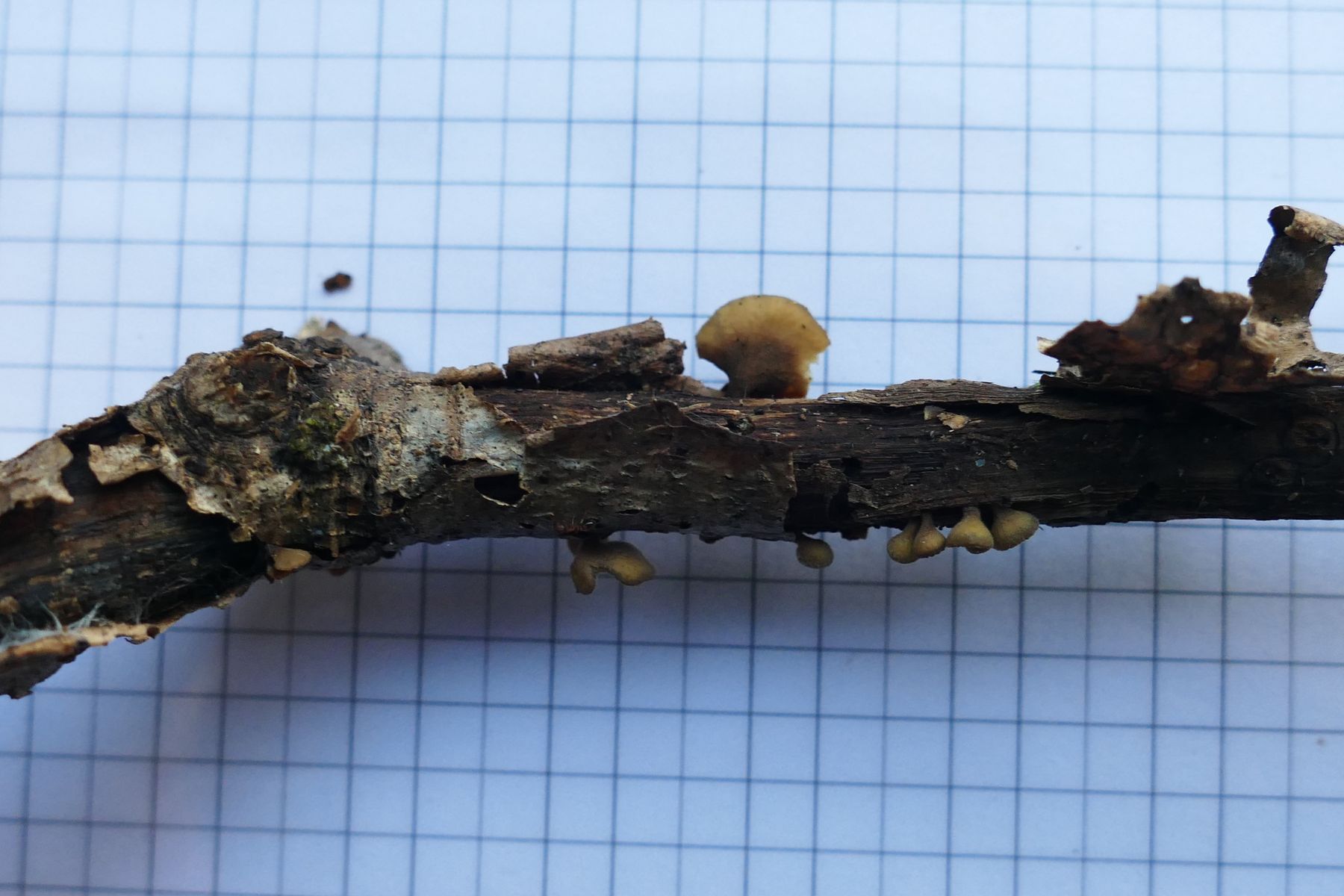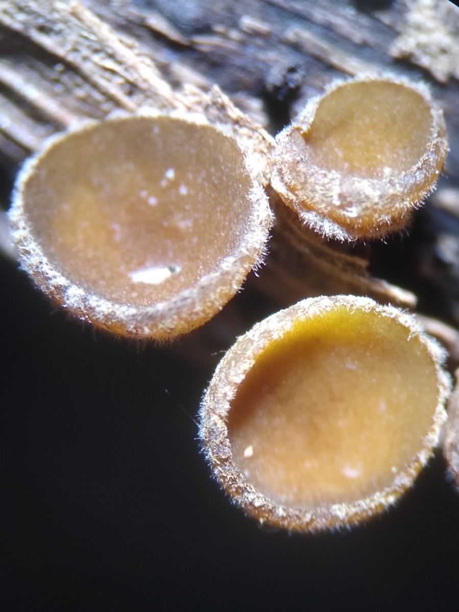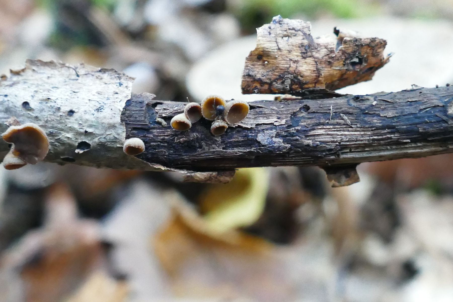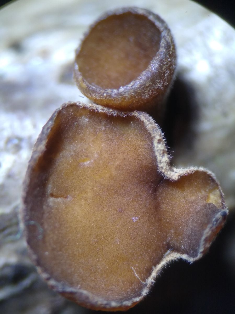 Ende Oktober fand ich im Wald unweit des Neckars an einem auf dem Boden liegenden Laubbaum-Ästchen kleine hellbraune, filzige, kurz gestielte Becherchen.
