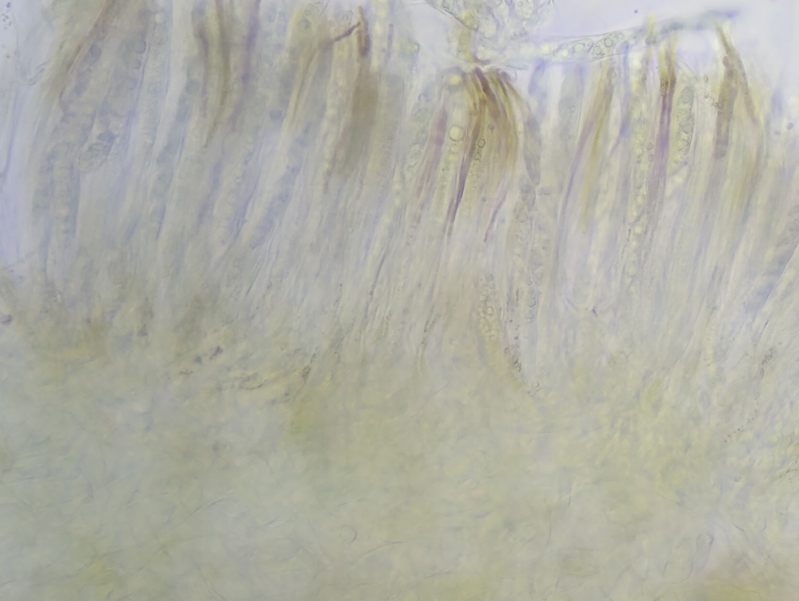 Bild 7 Hymenium in Wasser; Paraphysen braun gefüllt, Asci/Sporen farblos