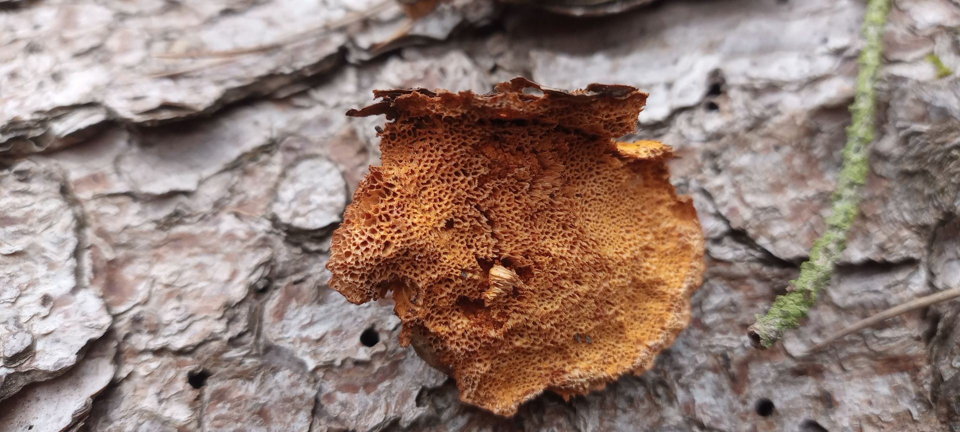 Direkt daneben dieser weiche Geselle. Die Oberfläche ist schon reichlich mitgenommen und wahrscheinlich nicht repräsentitiv. Ich meine eine Zonierung zu erkennen und schließe damit den Zimtporling aus, zumal der eh selten an Nadelholz wachsen soll. Aber was dann? Mir fällt bei dem Zustand ein: kommt ein Mann mit einem halben Hähnchen zum Tierarzt und fragt "kann man da noch was machen"?