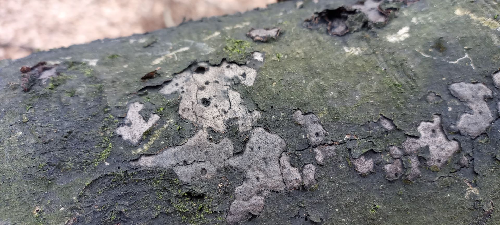 Das hier hat mich schon im APR geärgert. Der dort gezeigte Schiefe Schillerporling mit Schüppchen hat mich irritiert und mich auch zu diesem ähnlich aussehenden geführt. Könnte das ein Flächiges Eckenscheibchen (Diatrype stigma) sein? Und ist der graue Fruchtkörper auf dem Bild darunter die gleiche Art?