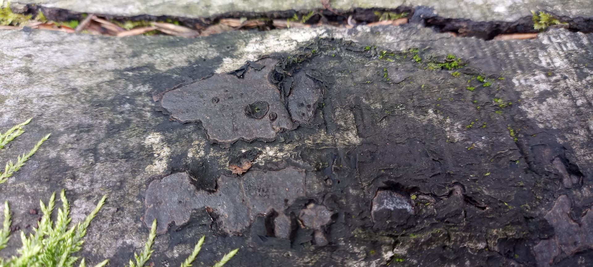 Das hier hat mich schon im APR geärgert. Der dort gezeigte Schiefe Schillerporling mit Schüppchen hat mich irritiert und mich auch zu diesem ähnlich aussehenden geführt. Könnte das ein Flächiges Eckenscheibchen (Diatrype stigma) sein? Und ist der graue Fruchtkörper auf dem Bild darunter die gleiche Art?