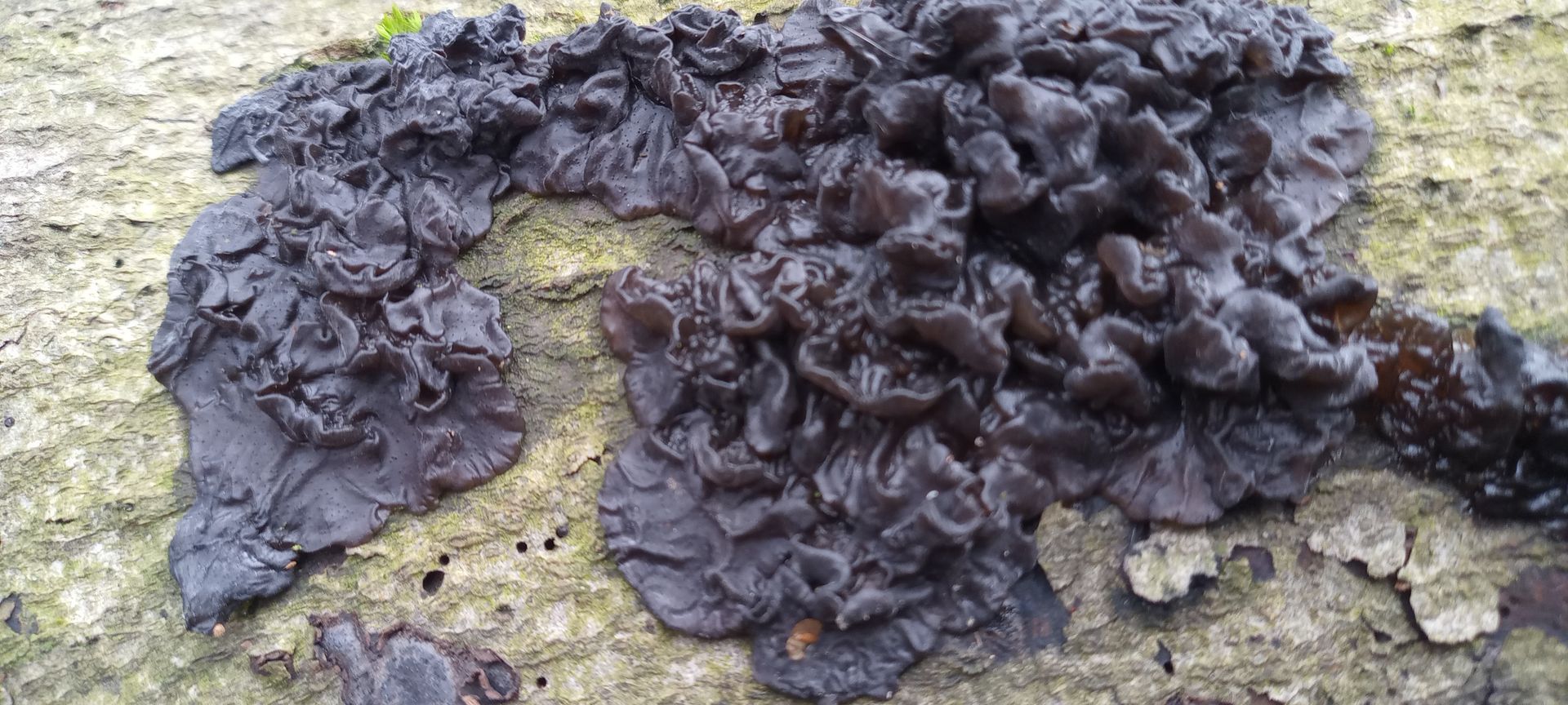 Und dieser schwarze Glibber? Für den Warzigen Drüsling (Exidia nigricans) scheint mir der zu flächig. Kann ich den anhand dieses Fotos von Becherförmiger Drüsling (E. glandulosa) unterscheiden?
