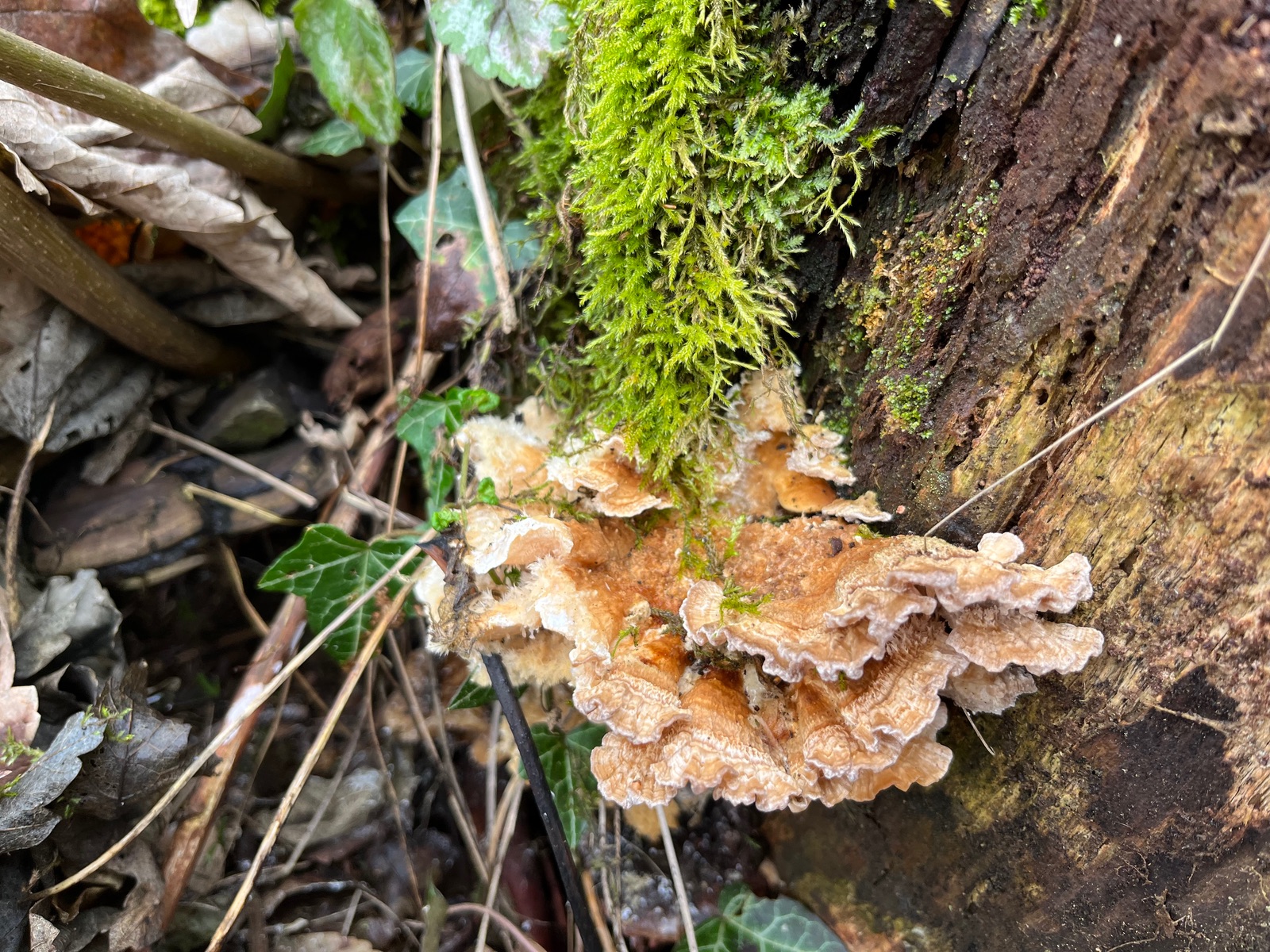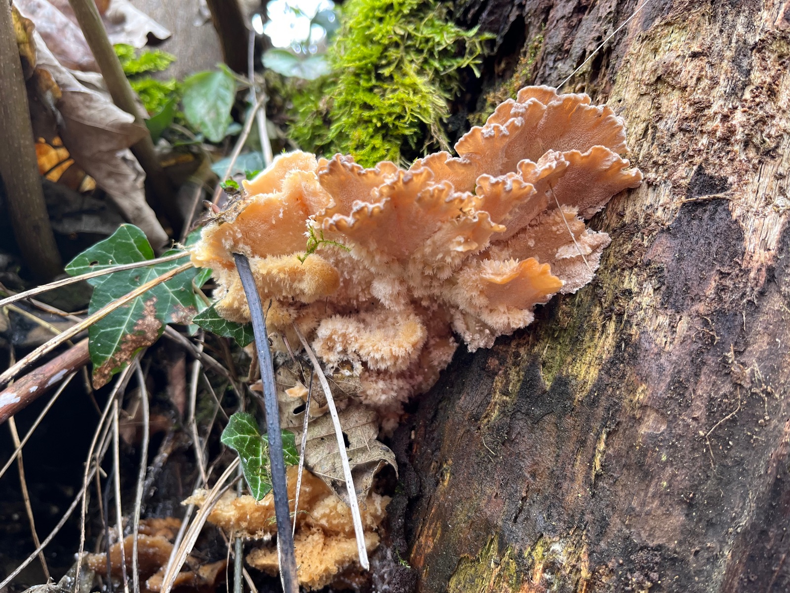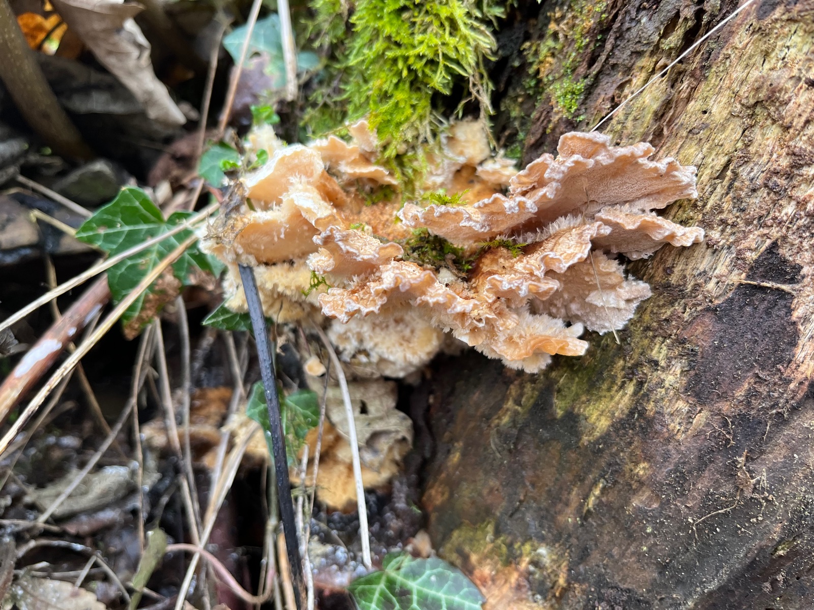 Hallo zusammen, eure Hilfe ist gefragt. Heut fand ich einen konsolenförmigen alten Pilz mit einer Anmutung zwischen Nordischem Porling und Gallertfleischigem Fältling, Stachelbart und Polsterpilz. Von allen etwas, also der ideale APR -Pilz. Flache Konsolen mit flatterigen Rändern, Poren, Stacheln und Borsten. Geruchlos nach dem Frost ist auch nicht ganz klar, ob die Farbtöne original sind. Eine Ganoderma aplanatum wuchs am selben Stamm.