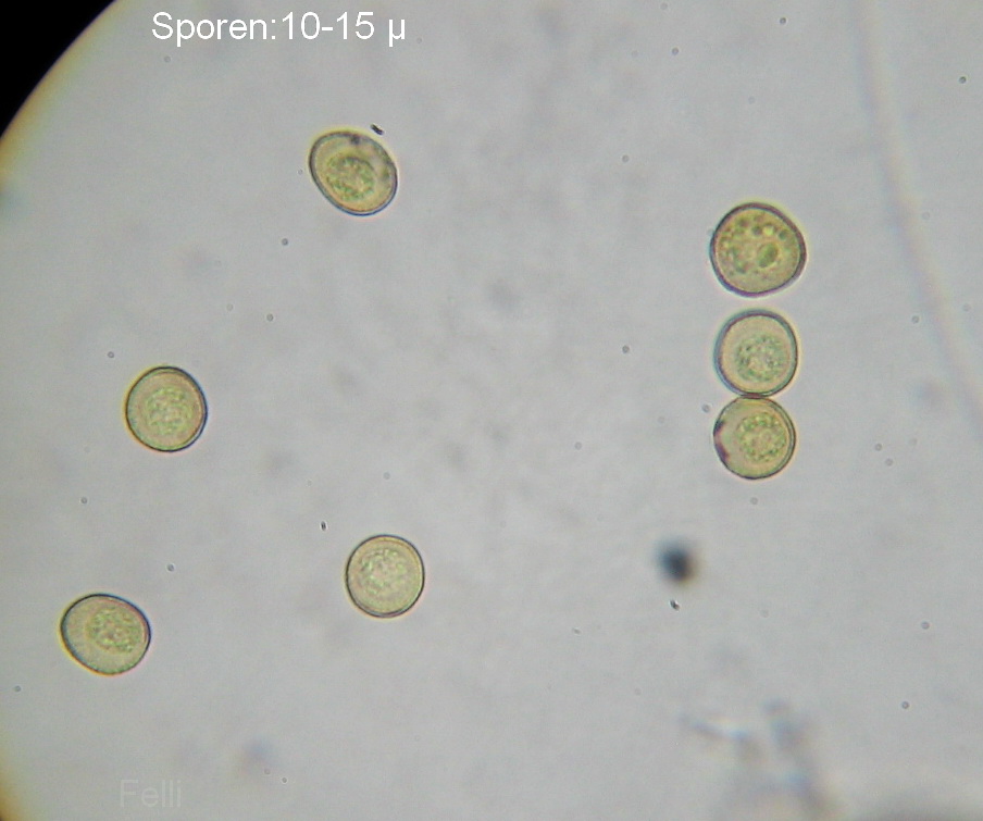 Hallo Ulla, sind die Sporen normal „unregelmäßig rundlich“, oder werden sie erst durch das Quetschen mit dem Deckglas oval? Von „fein stachelig“ sehe ich auch nichts.