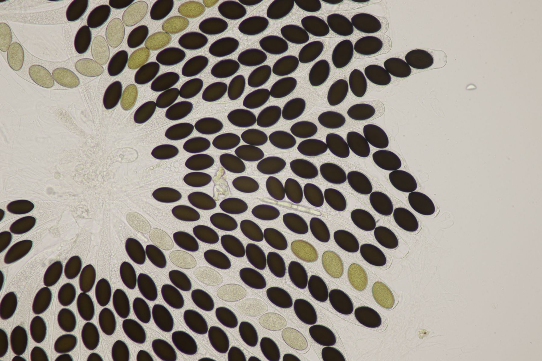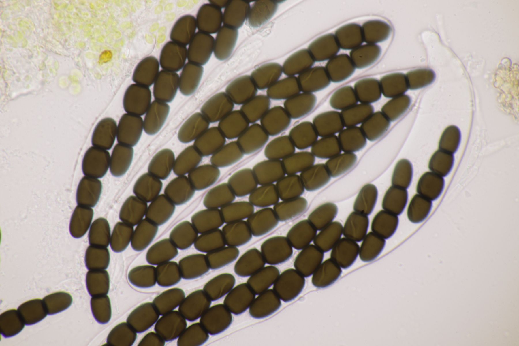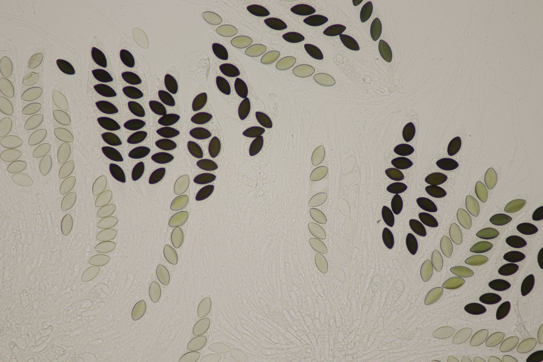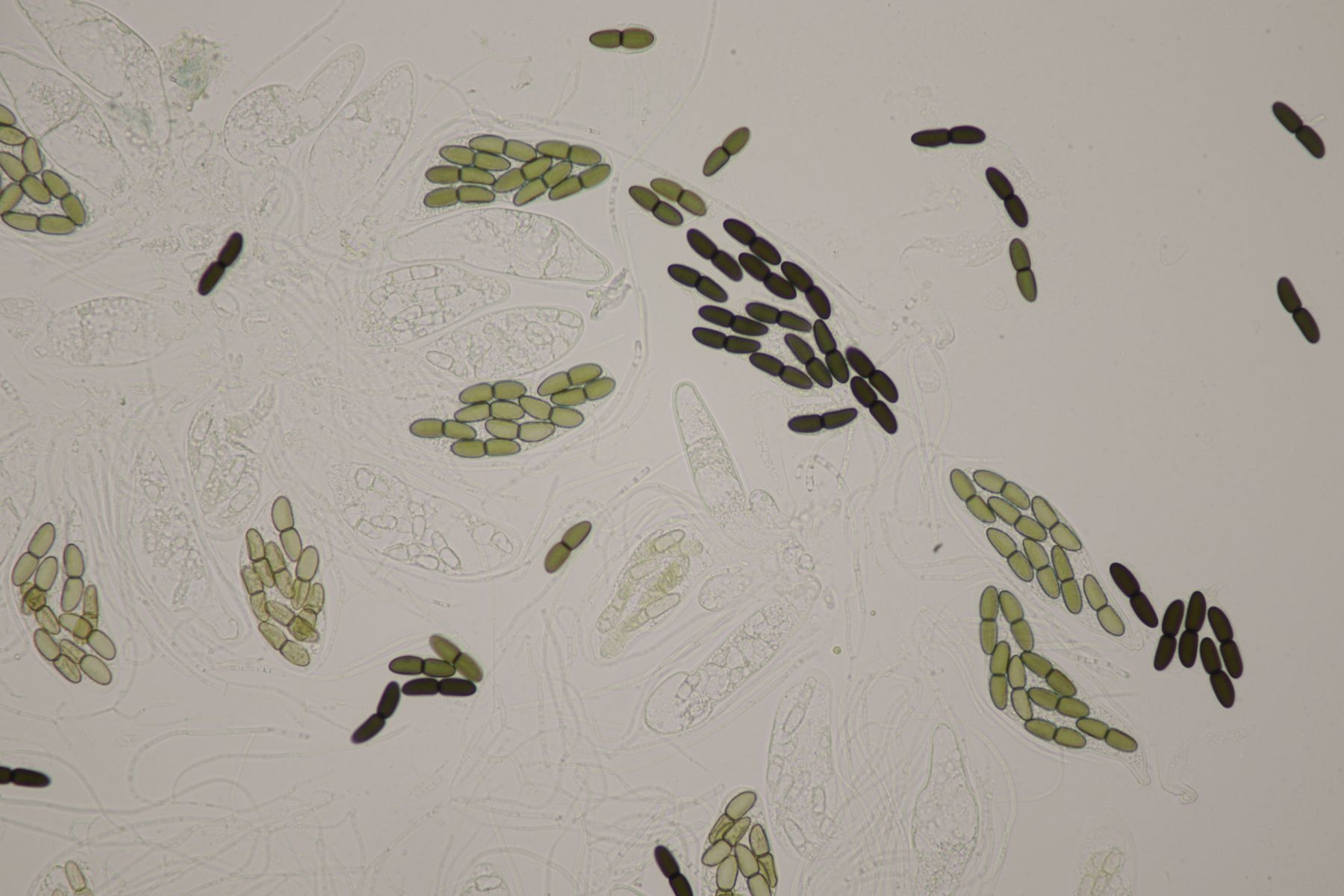 9. Eine Delitschia mit Sporen von 28-30 µm x 7-8 µm, die gerade septiert sind. Ein Tomentum ist mir nicht aufgefallen, aber das Substrat war an der Stelle, wo ich den Fruchtkörper gefunden habe, grünlich gefärbt. Die Asci scheinen biseriat zu sein... damit paßt in Nobis Delitschia-Tabelle erstmal nichts direkt. Kann D. leptospora so große Sporen haben? Oder kann D. trichodelitschioides so tief septierte Sporen haben?
