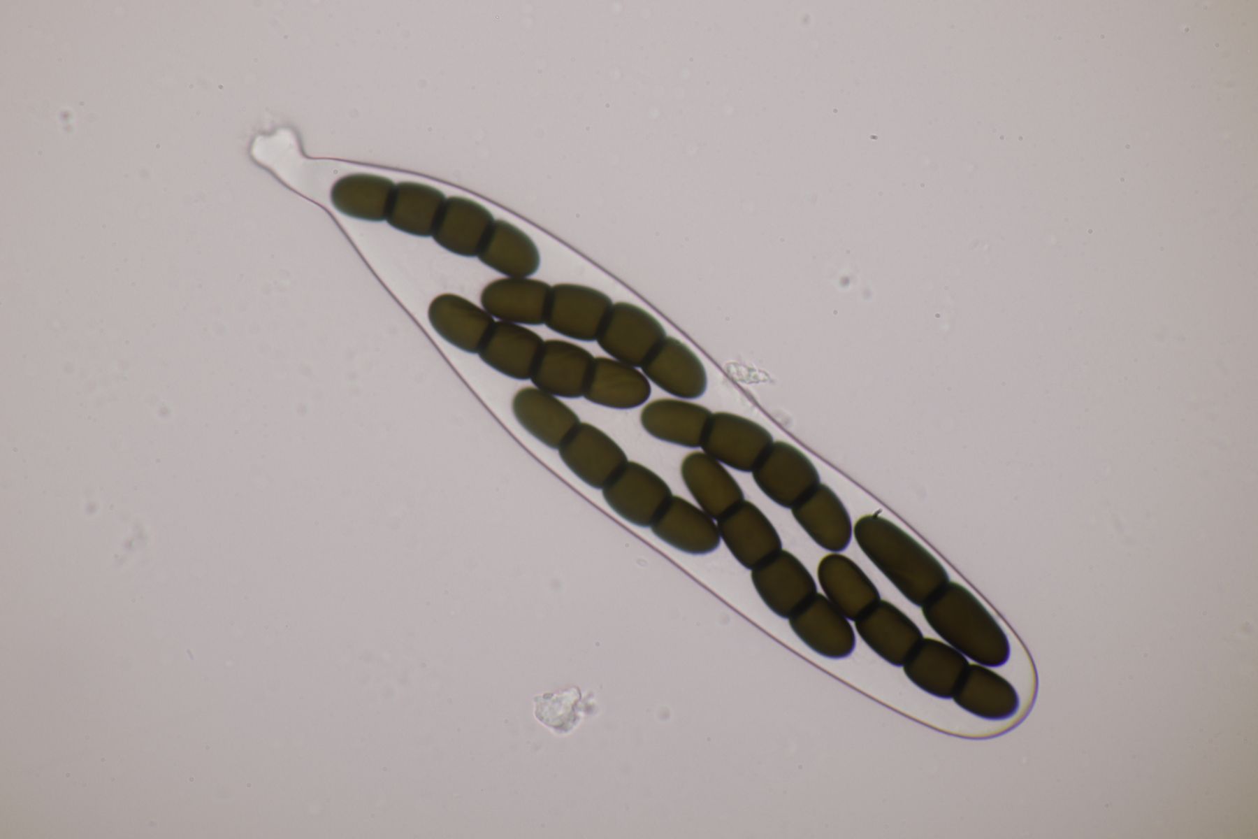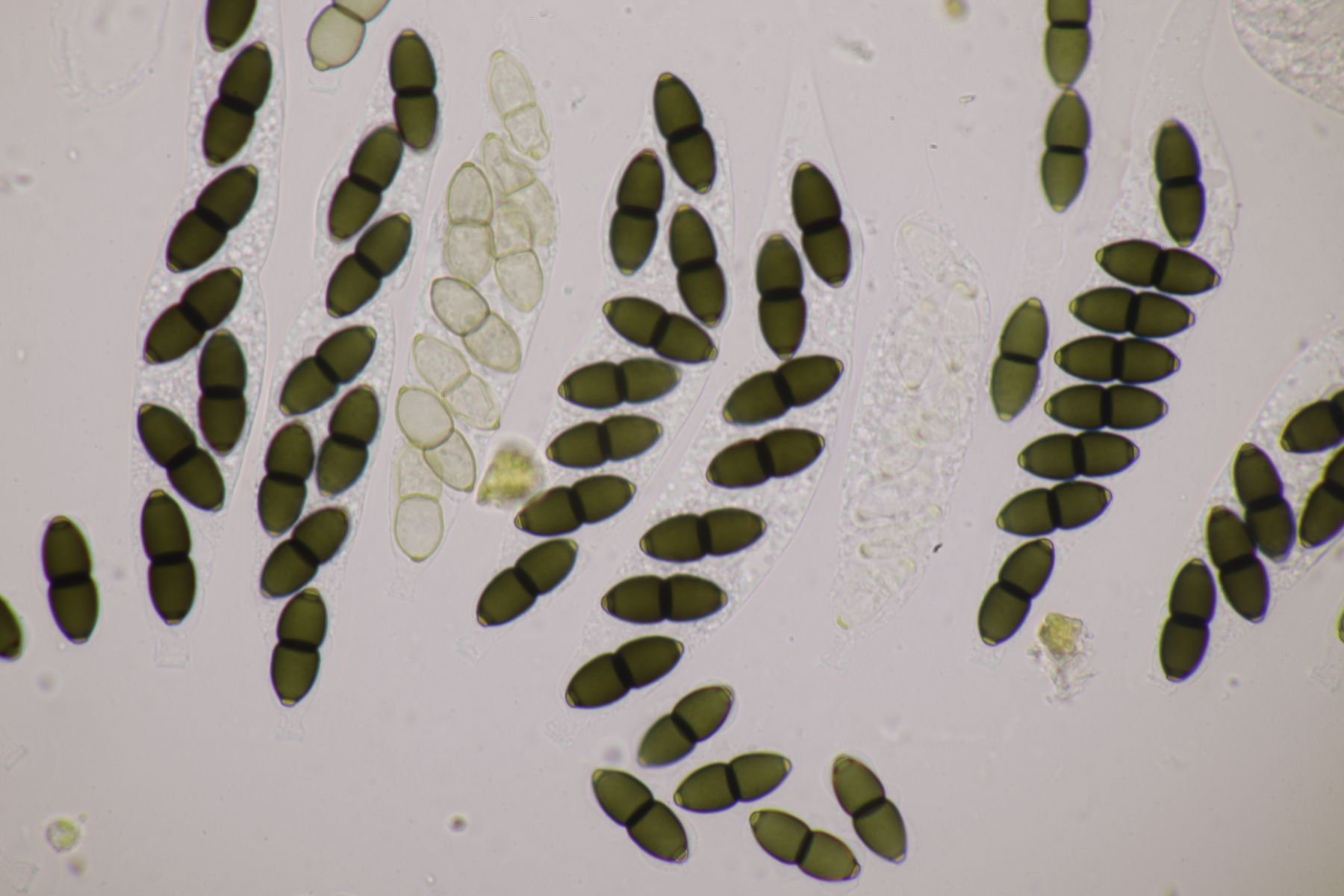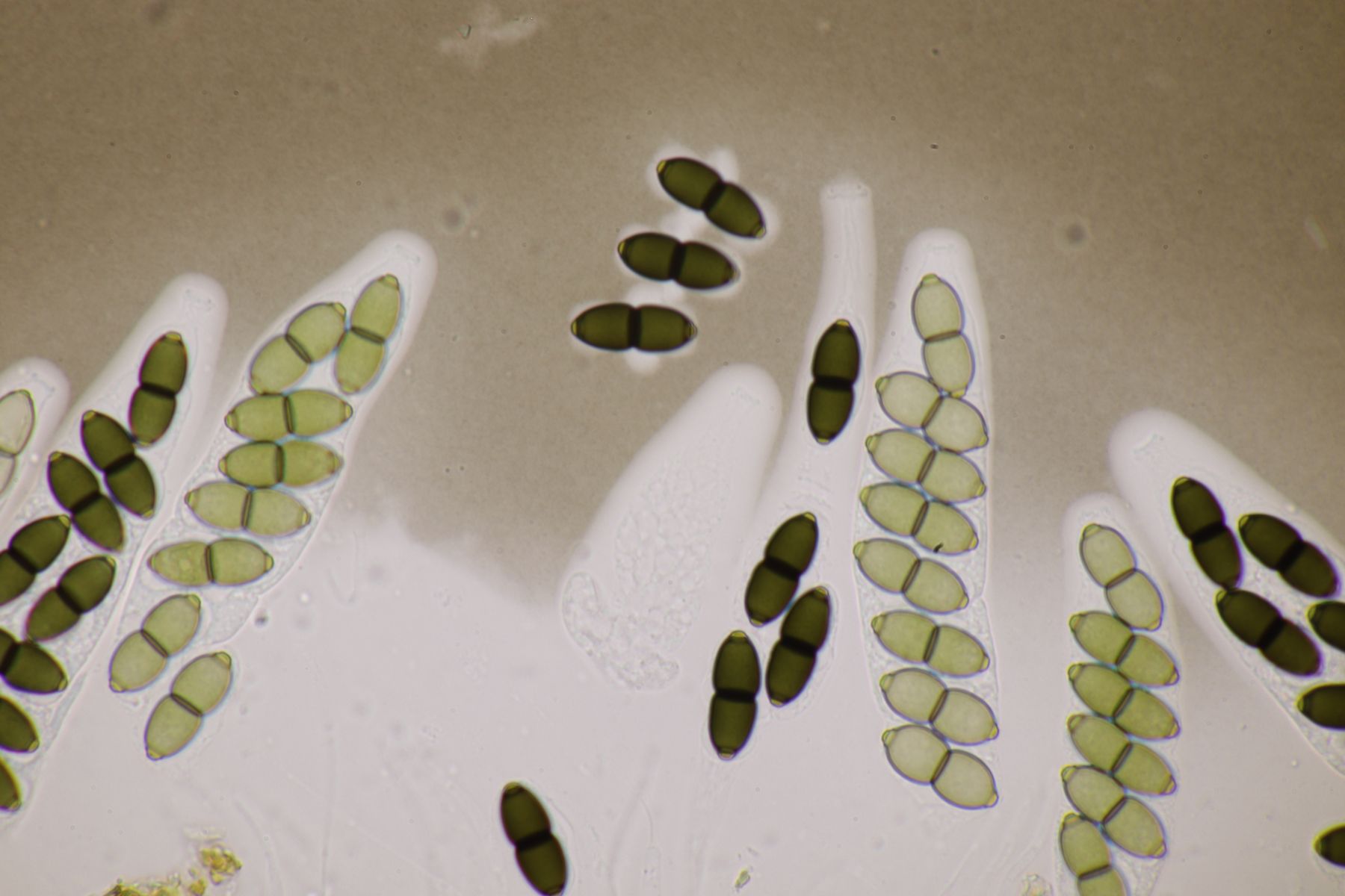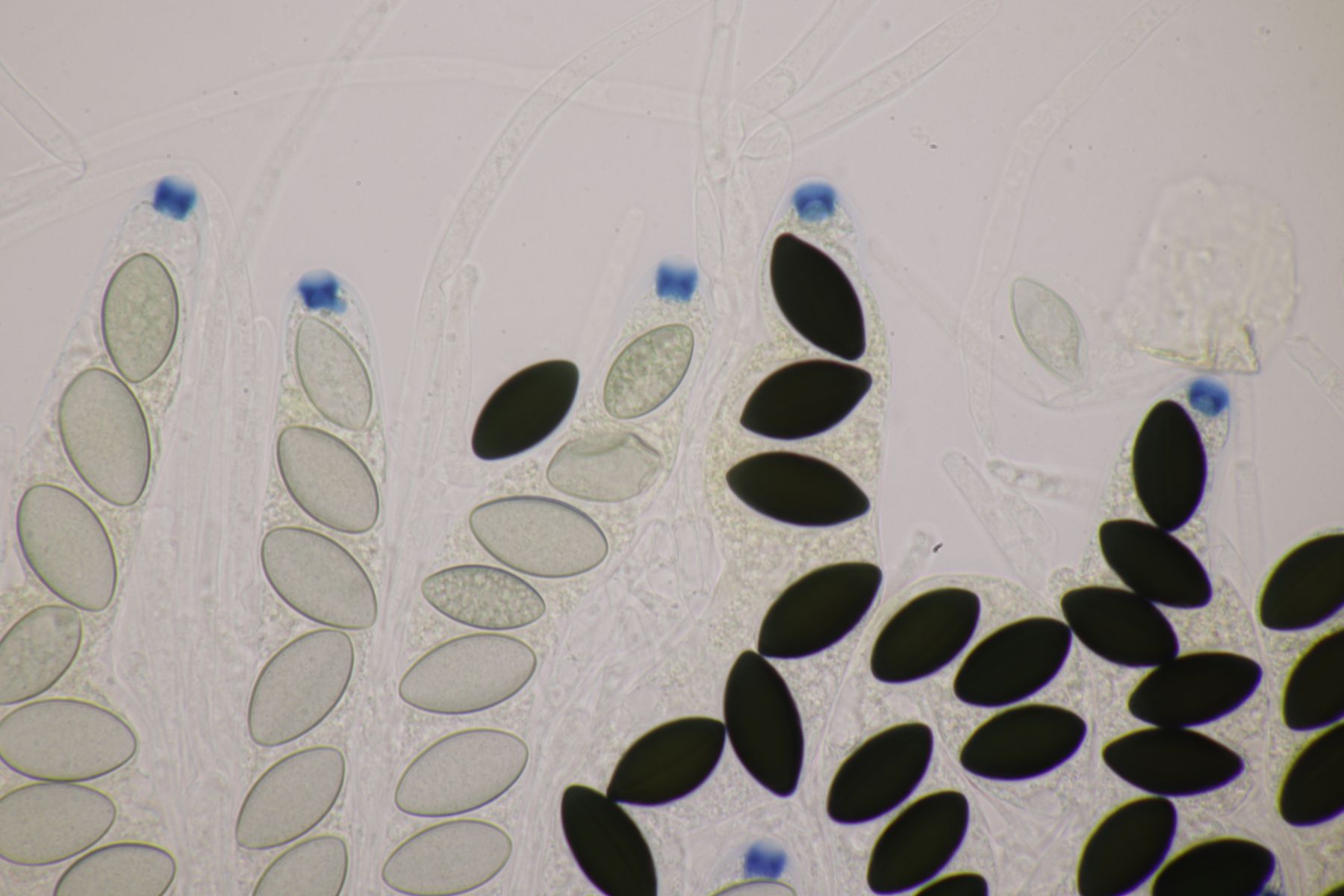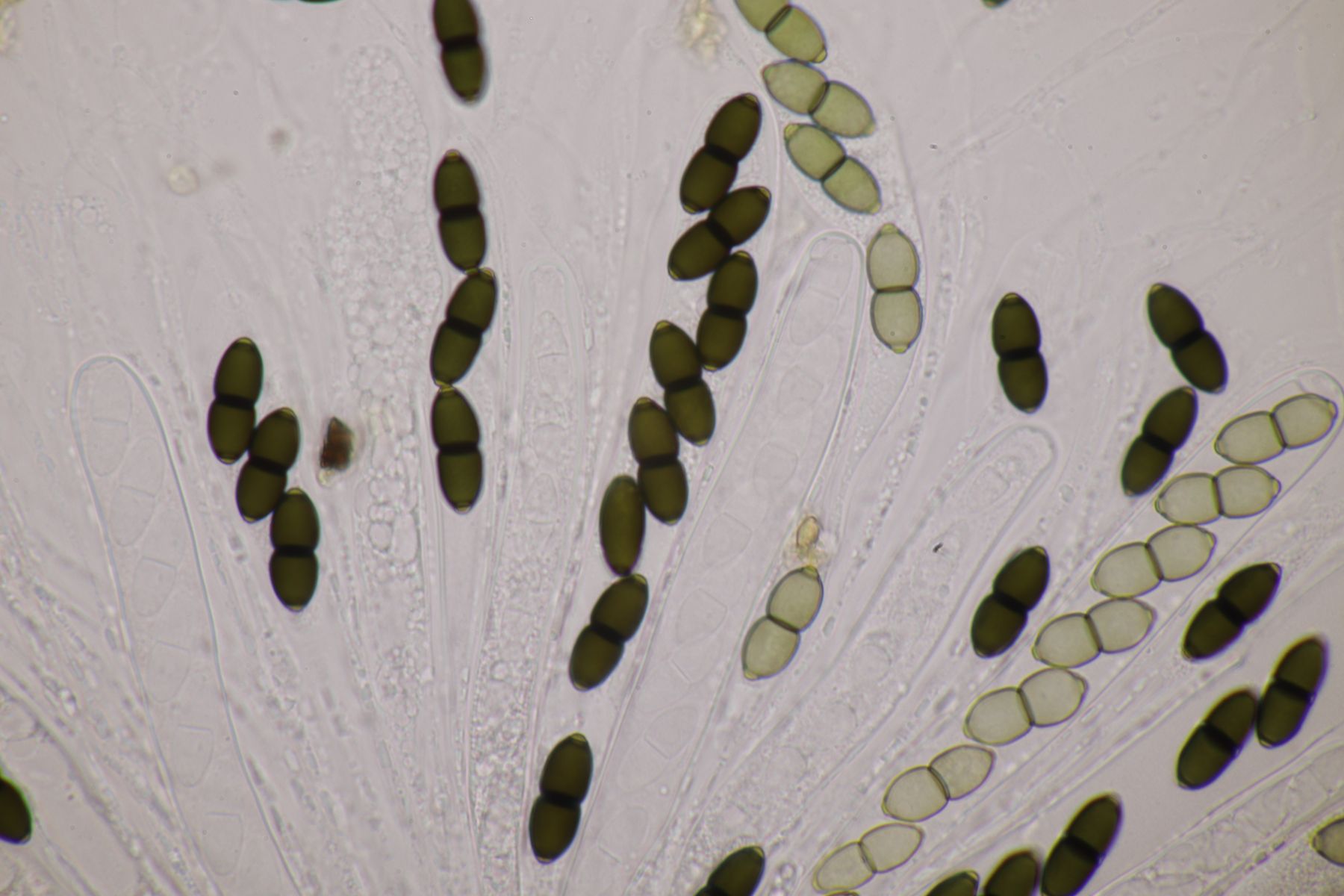 9. Eine Delitschia mit Sporen von 28-30 µm x 7-8 µm, die gerade septiert sind. Ein Tomentum ist mir nicht aufgefallen, aber das Substrat war an der Stelle, wo ich den Fruchtkörper gefunden habe, grünlich gefärbt. Die Asci scheinen biseriat zu sein... damit paßt in Nobis Delitschia-Tabelle erstmal nichts direkt. Kann D. leptospora so große Sporen haben? Oder kann D. trichodelitschioides so tief septierte Sporen haben?