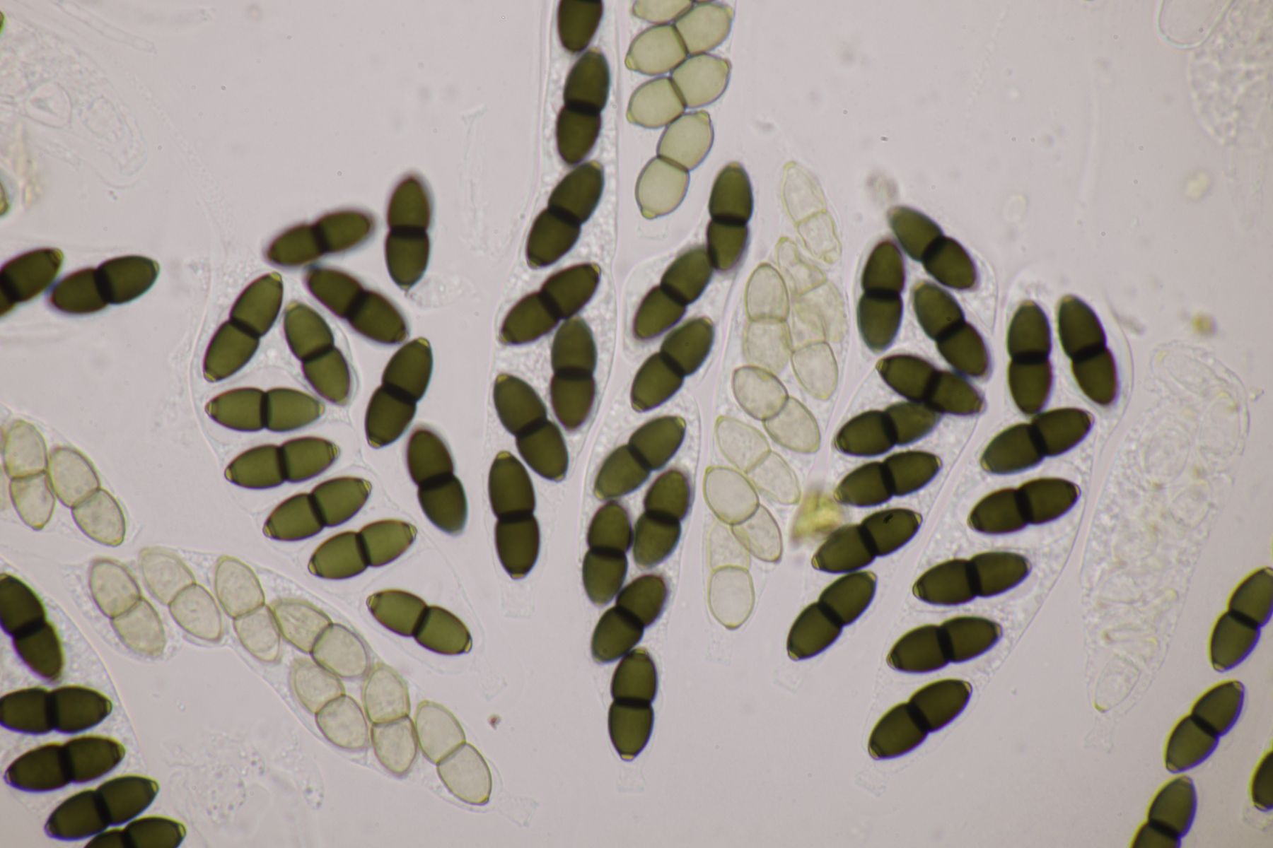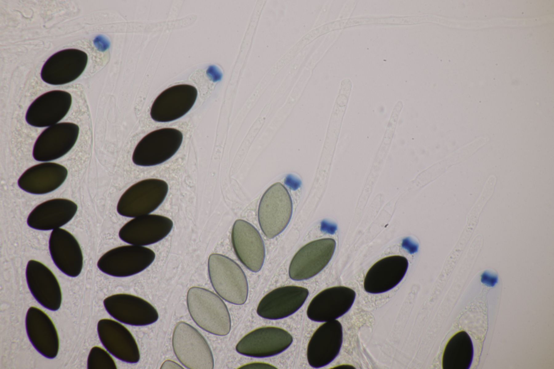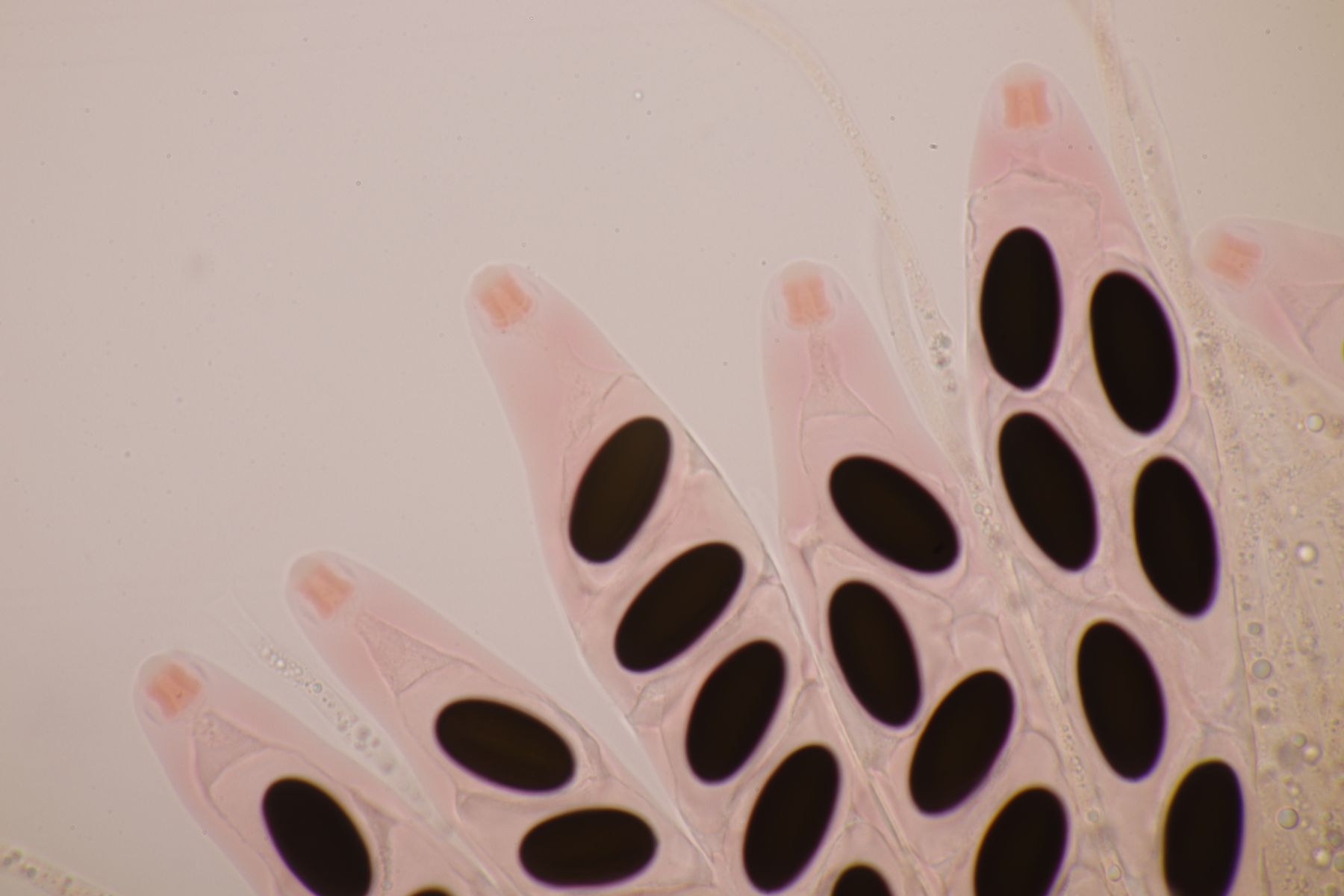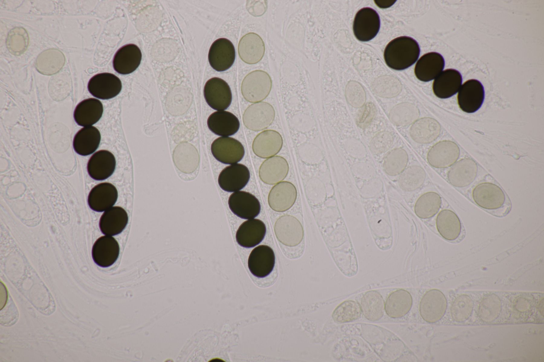 9. Eine Delitschia mit Sporen von 28-30 µm x 7-8 µm, die gerade septiert sind. Ein Tomentum ist mir nicht aufgefallen, aber das Substrat war an der Stelle, wo ich den Fruchtkörper gefunden habe, grünlich gefärbt. Die Asci scheinen biseriat zu sein... damit paßt in Nobis Delitschia-Tabelle erstmal nichts direkt. Kann D. leptospora so große Sporen haben? Oder kann D. trichodelitschioides so tief septierte Sporen haben?