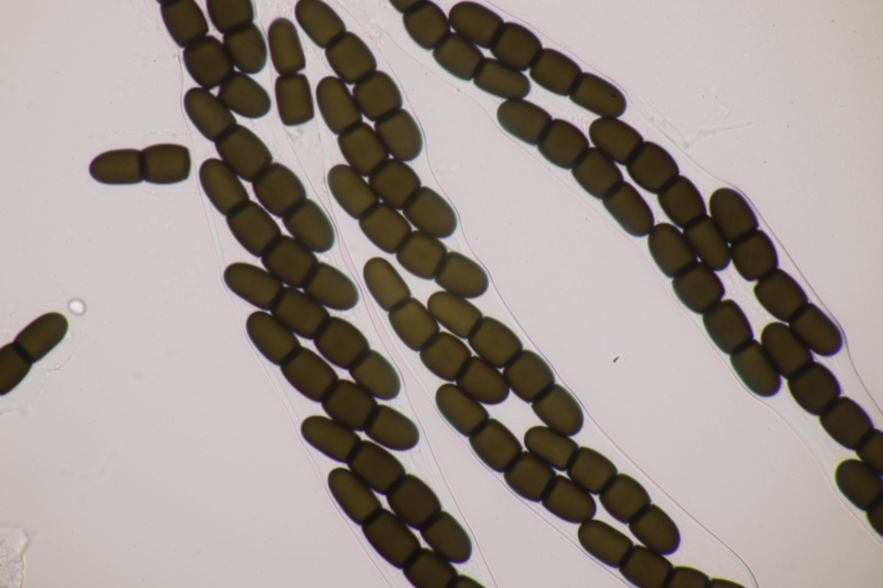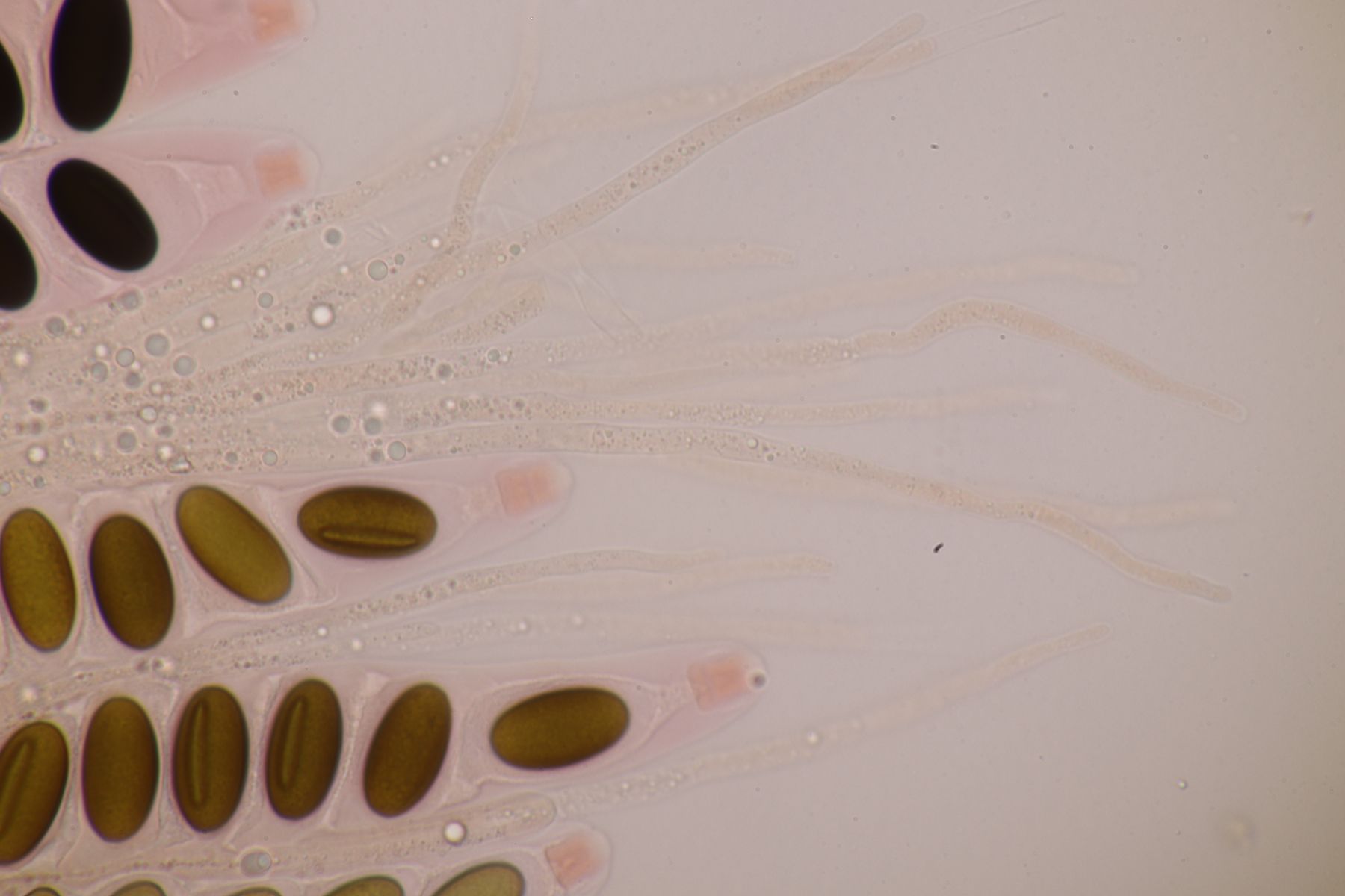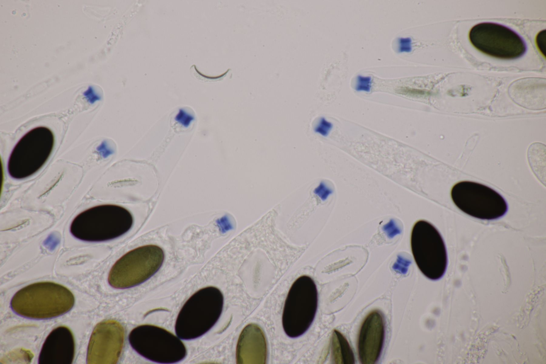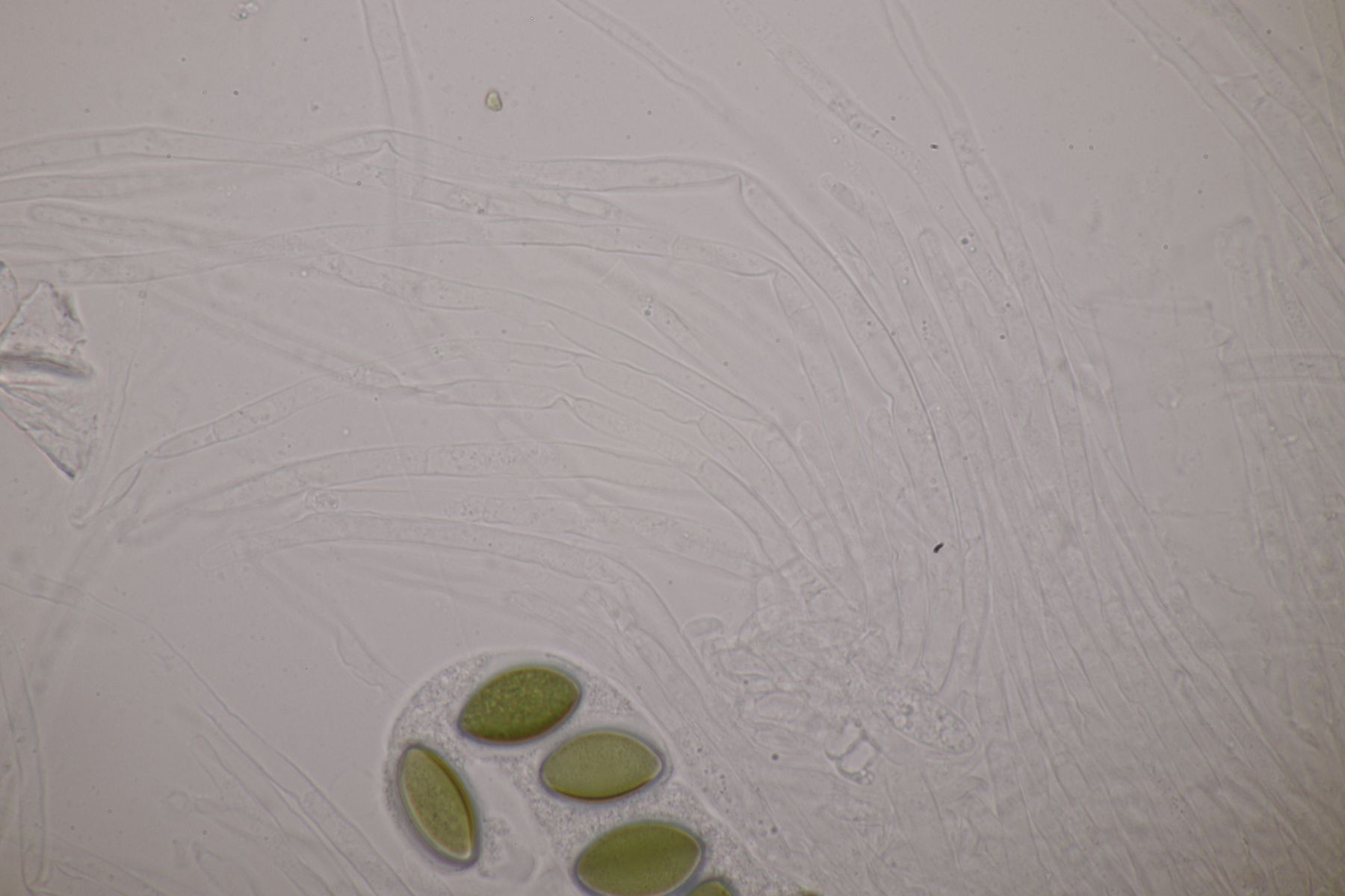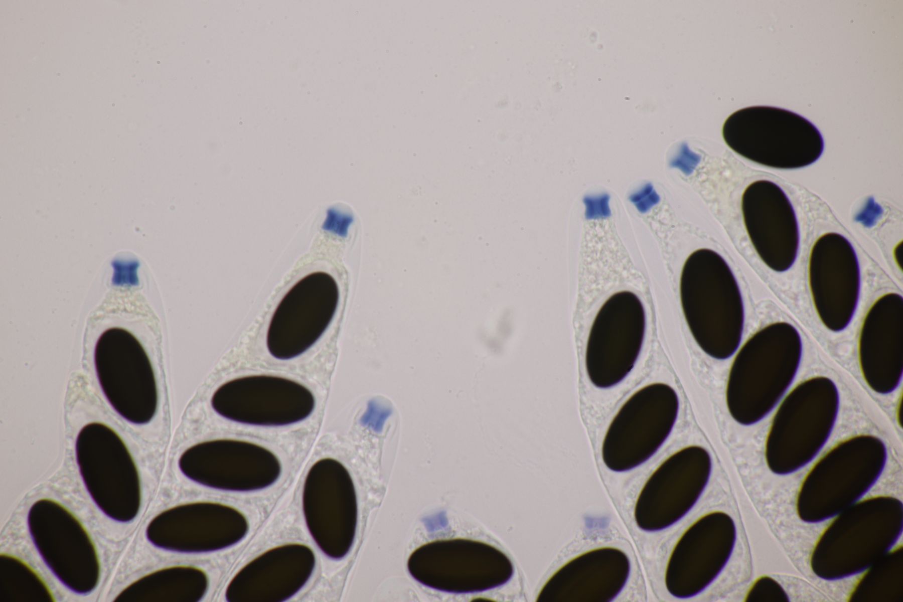 9. Eine Delitschia mit Sporen von 28-30 µm x 7-8 µm, die gerade septiert sind. Ein Tomentum ist mir nicht aufgefallen, aber das Substrat war an der Stelle, wo ich den Fruchtkörper gefunden habe, grünlich gefärbt. Die Asci scheinen biseriat zu sein... damit paßt in Nobis Delitschia-Tabelle erstmal nichts direkt. Kann D. leptospora so große Sporen haben? Oder kann D. trichodelitschioides so tief septierte Sporen haben?