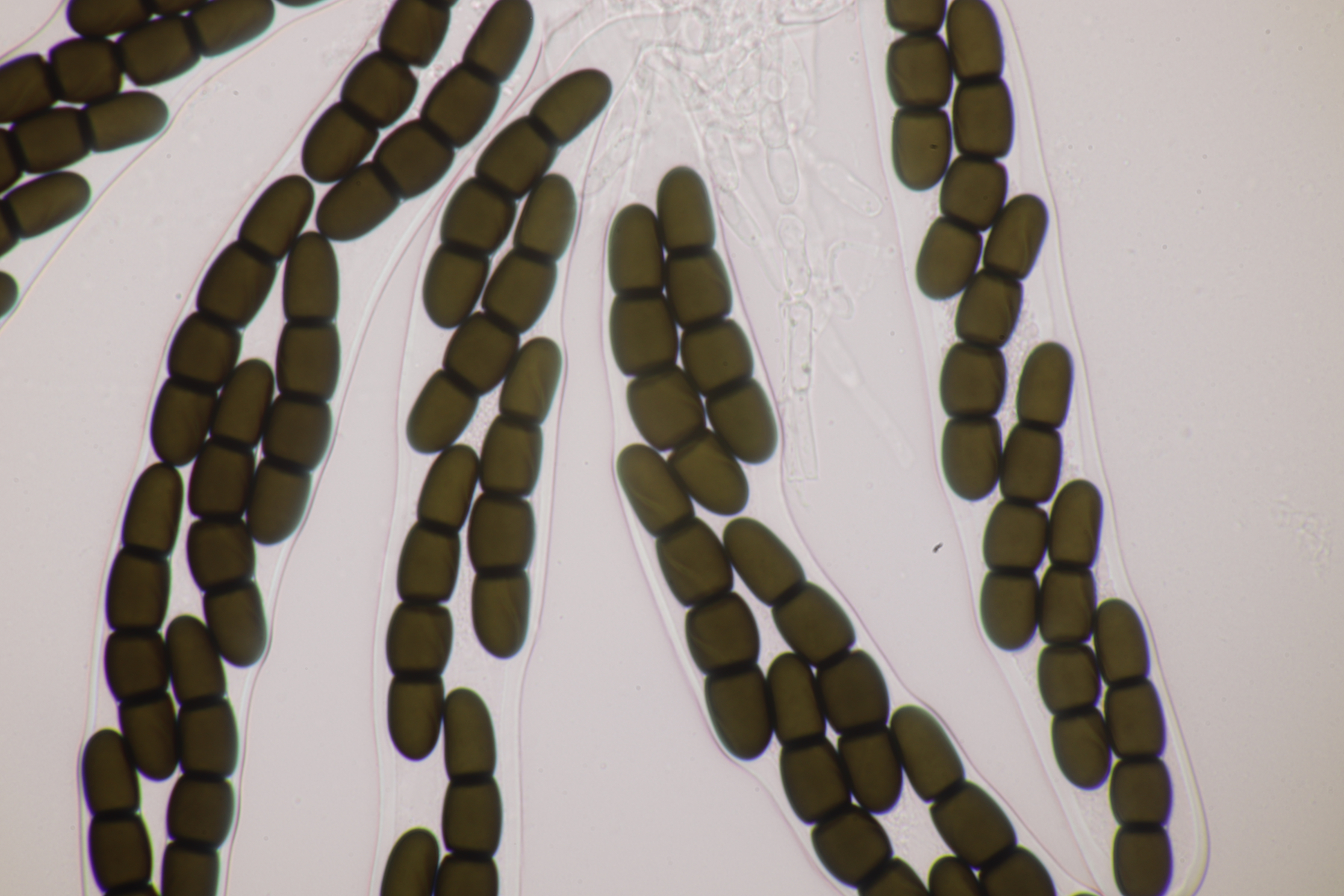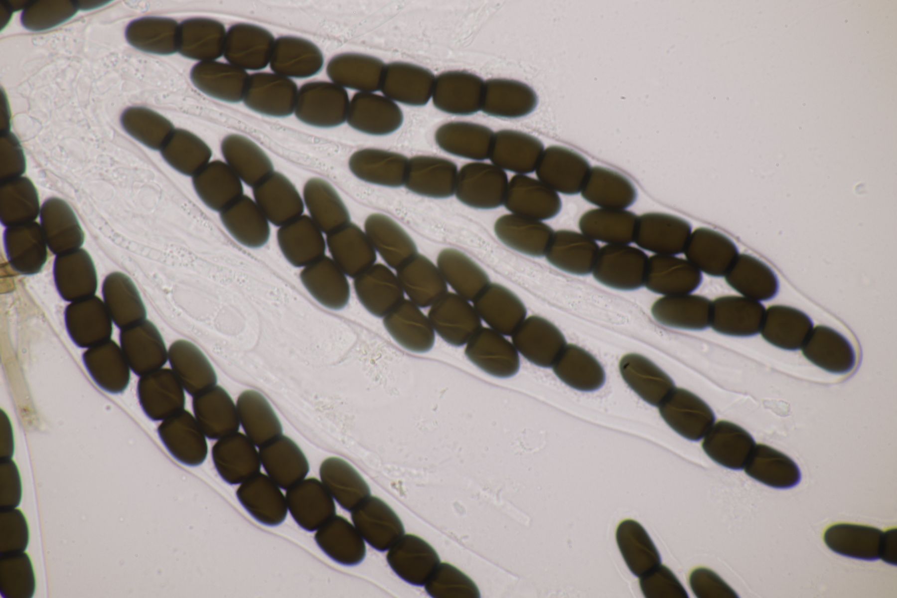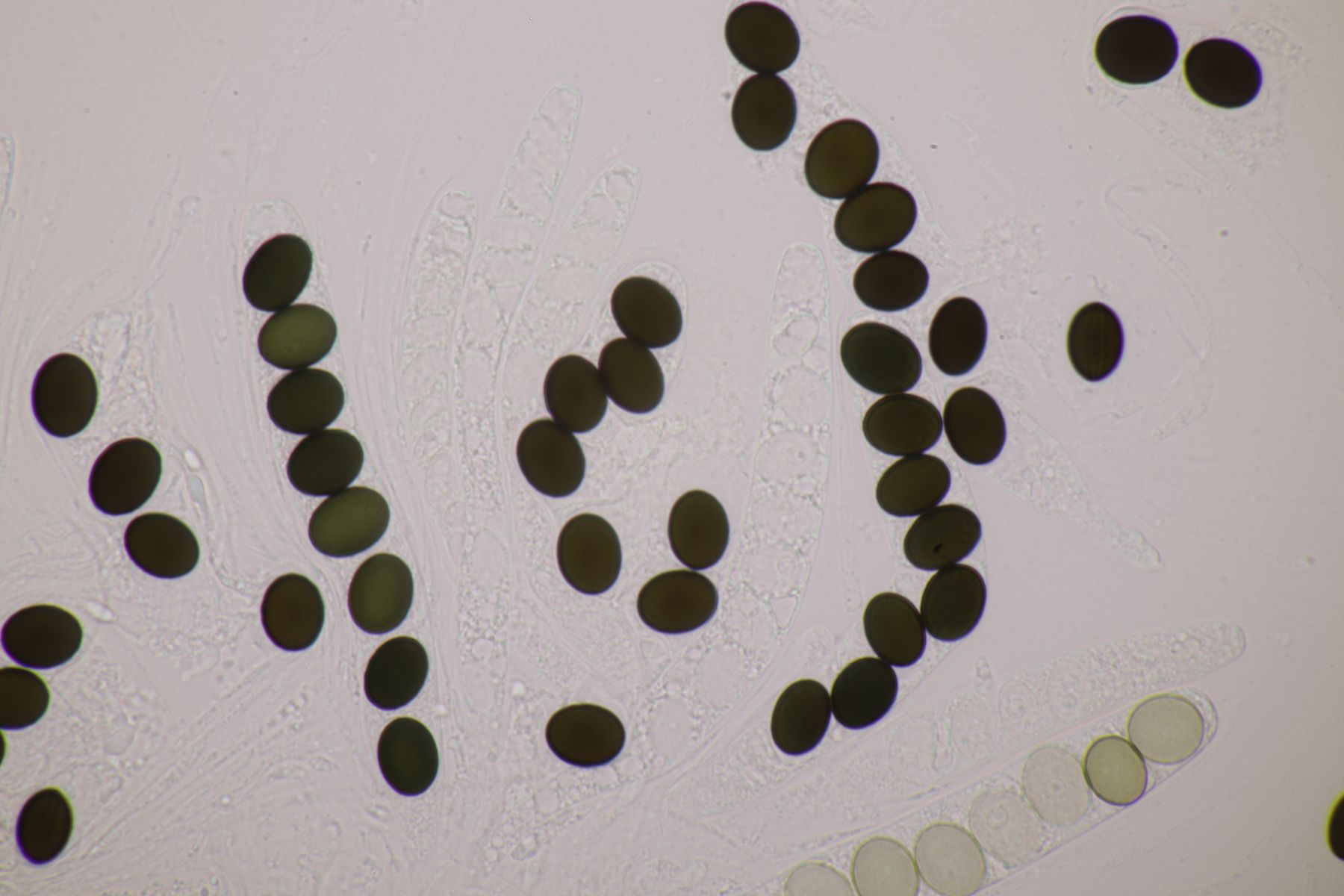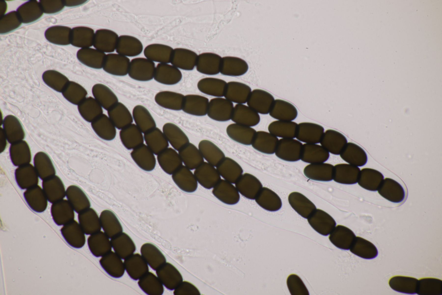 7. Coniochaeta scatigena mit Sporen von 18-19 µm x 15-16 µm