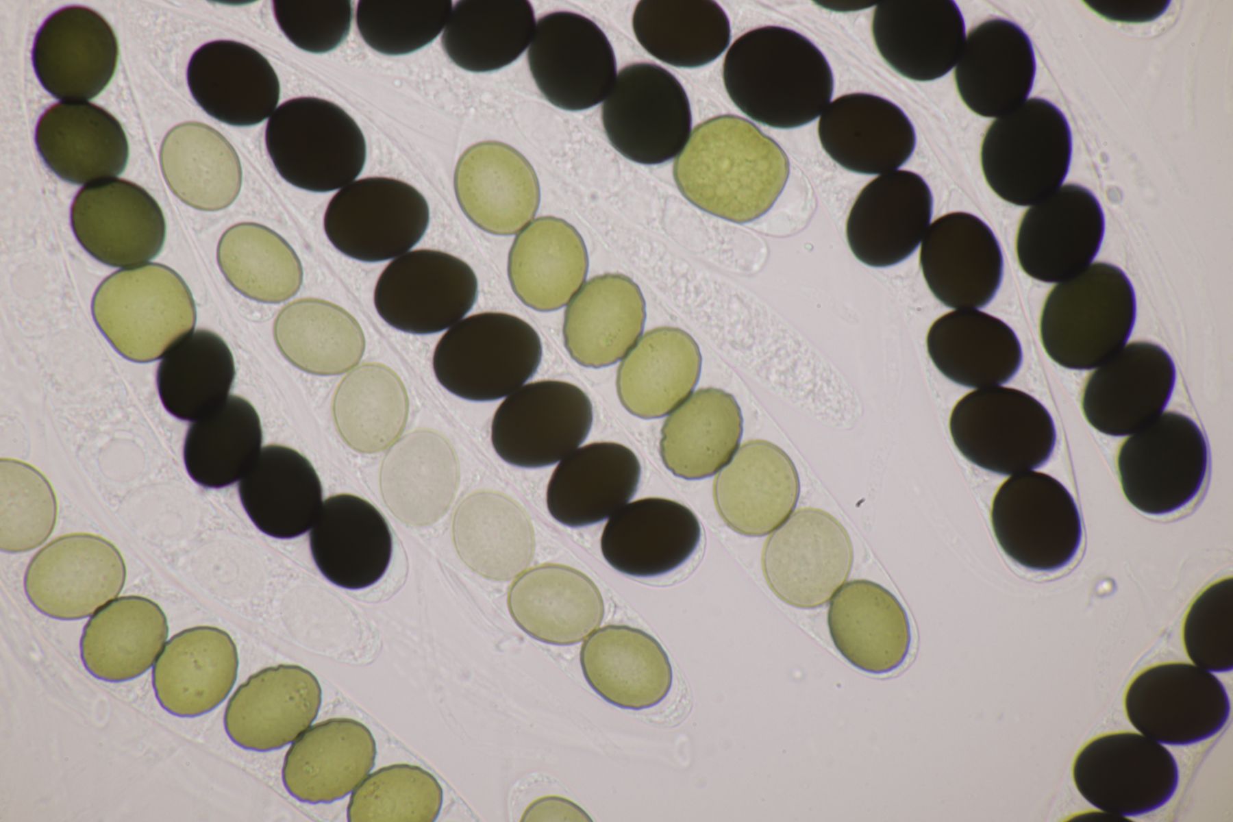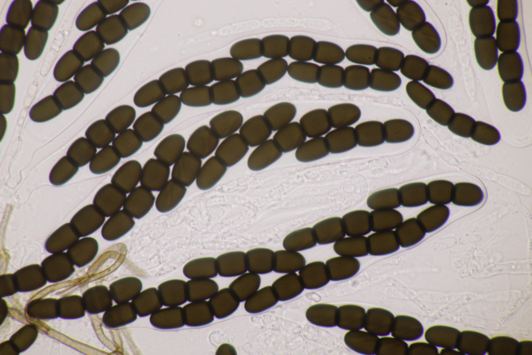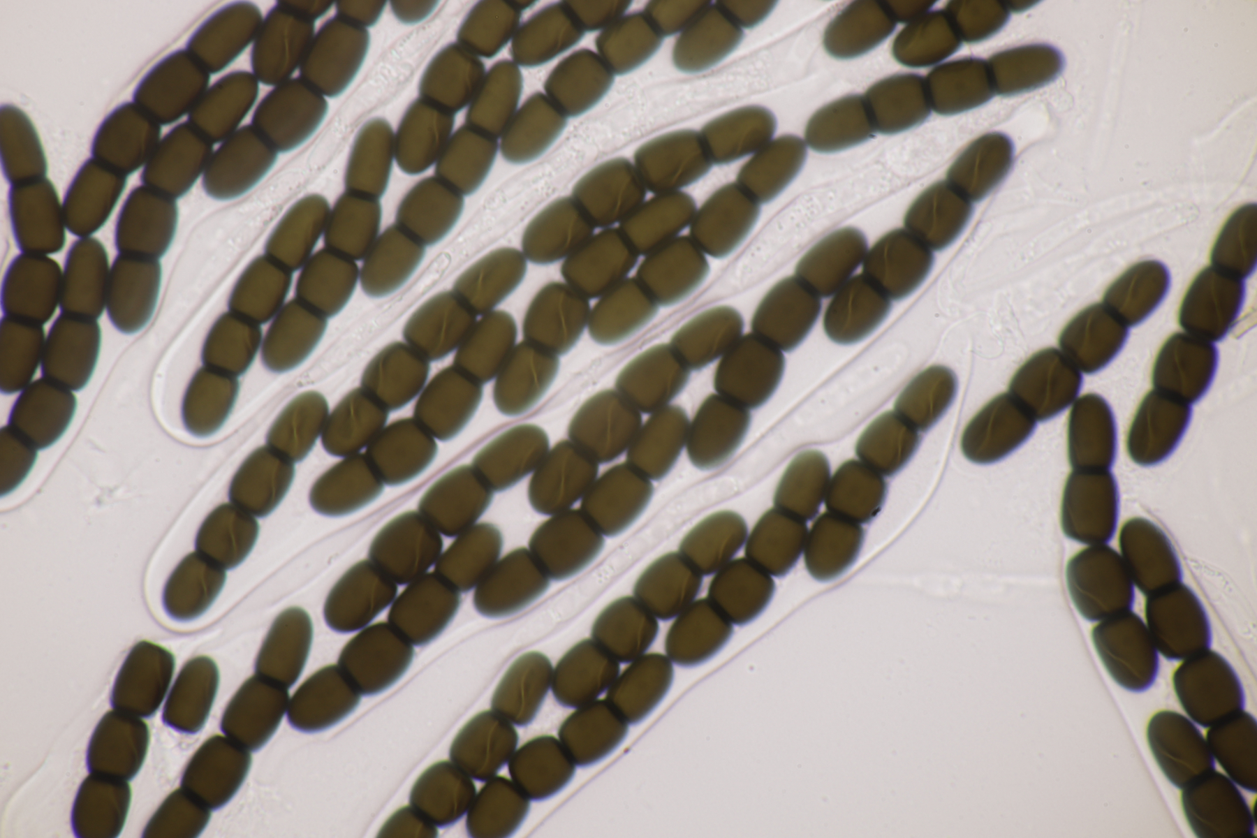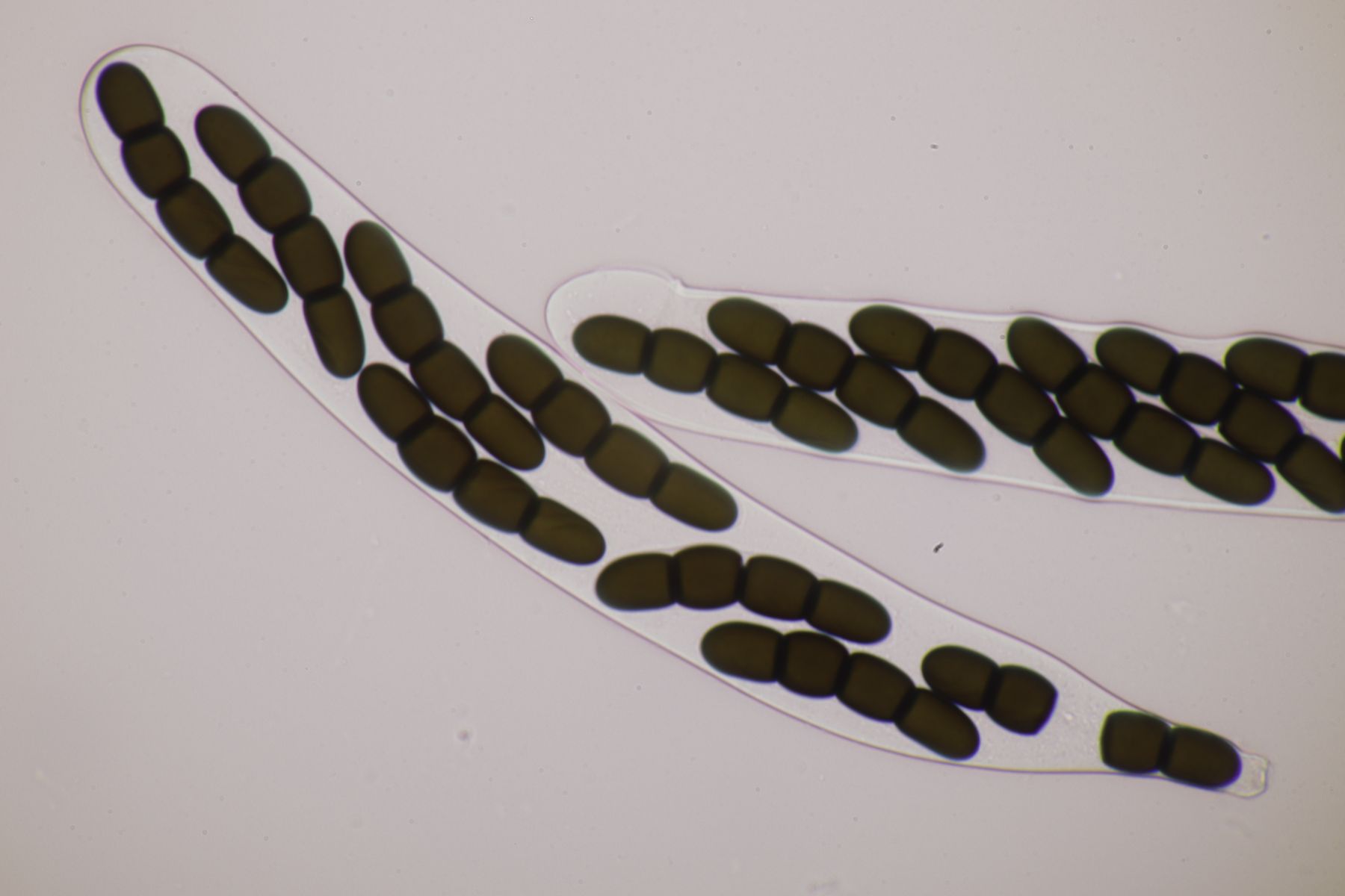 7. Coniochaeta scatigena mit Sporen von 18-19 µm x 15-16 µm