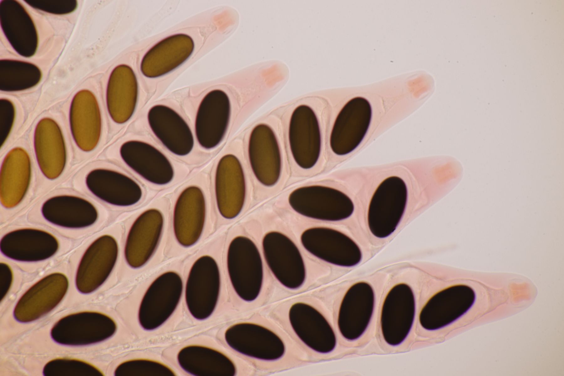 3. Sordaria macrospora, Sporen messen 29.9-35.6 x 17.1-18.8, Q=1.7-2.0, im Mittel 1.7