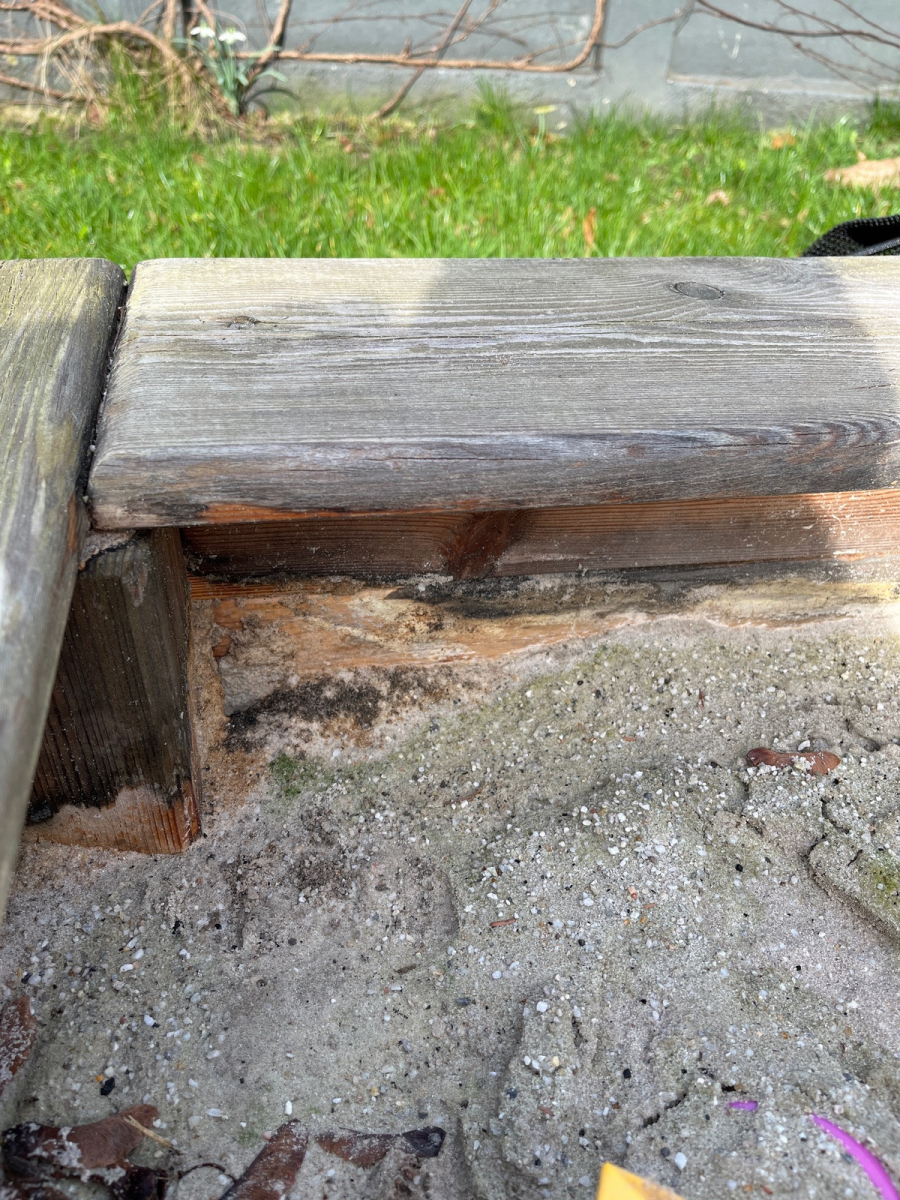 Der rand unseres sandkasten siejt merkwürdig aus. Im Spätsommer hatte ich vereinzelt schon so eine Art weißen Flaum / Schaum gesehen. Nun sieht das Holz so aus wie auf dem Foto. Hat jemand eine Idee, ob das ein Pilz sein könnte?