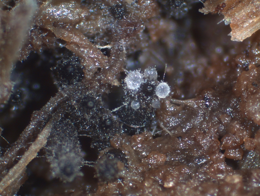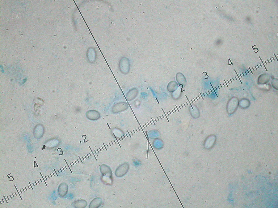 Weil in der Nähe sehr viele Fruchtkörper von Coprotus granuliformis waren, habe ich die Sporen mit Baumwollblau eingefärbt, aber es zeigten sich keine de Bary bubbles.