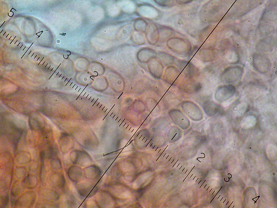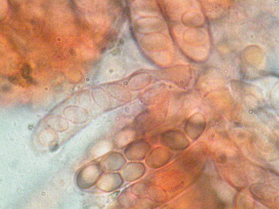 Asci ca. 60-70 µm lang, 8-sporig, Basis mit Haken. Die hyalinen Sporen breitelliptisch 6-7 x 3-4 µm groß, ohne Öltropfen. Haare oder Paraphysen an der Spitze gekrümmt.