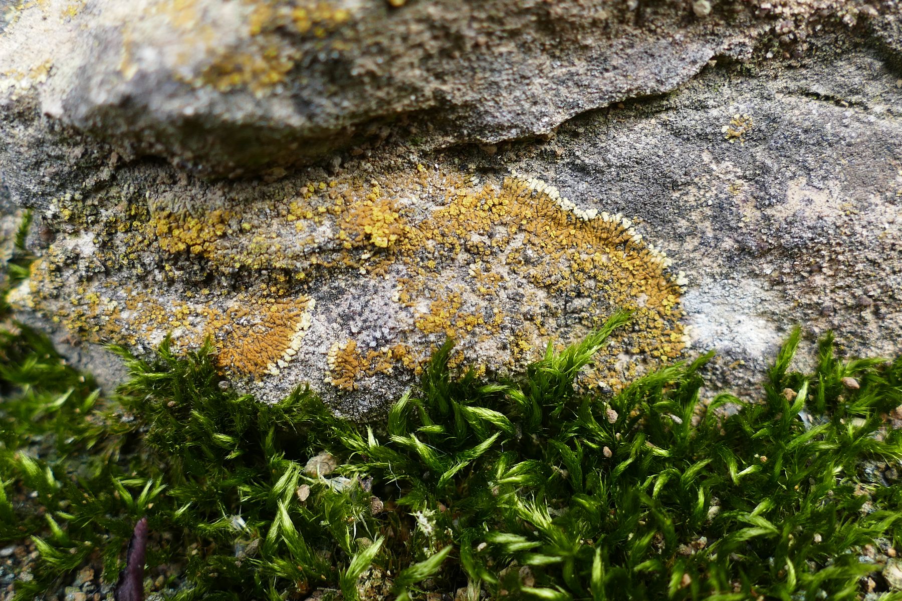 Bild 2 Inspektion von Flechten - oft in Moosnähe (hier: Caloplaca cirrochroa)
