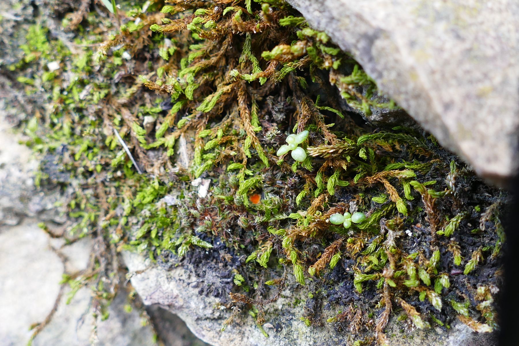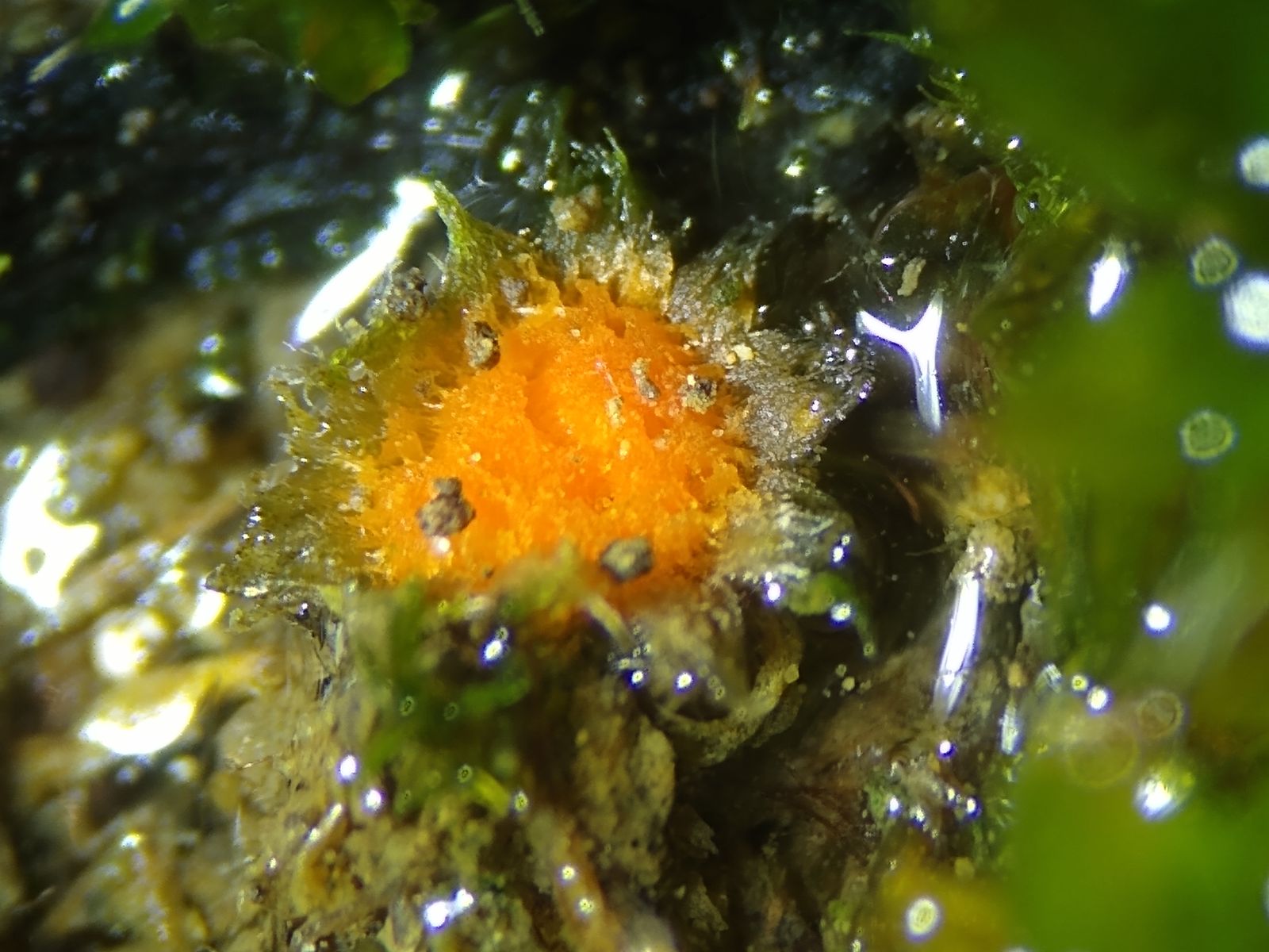 unterwegs im Felsengärten-Labyrinth, mit der Nase dicht an den Felswänden, sah ich im grünen Moos eine orangenen Farbtupfer: Ein Moosbecherchen!