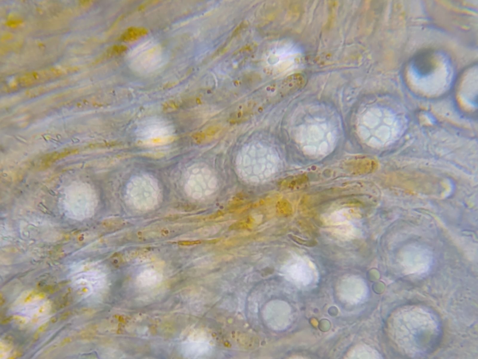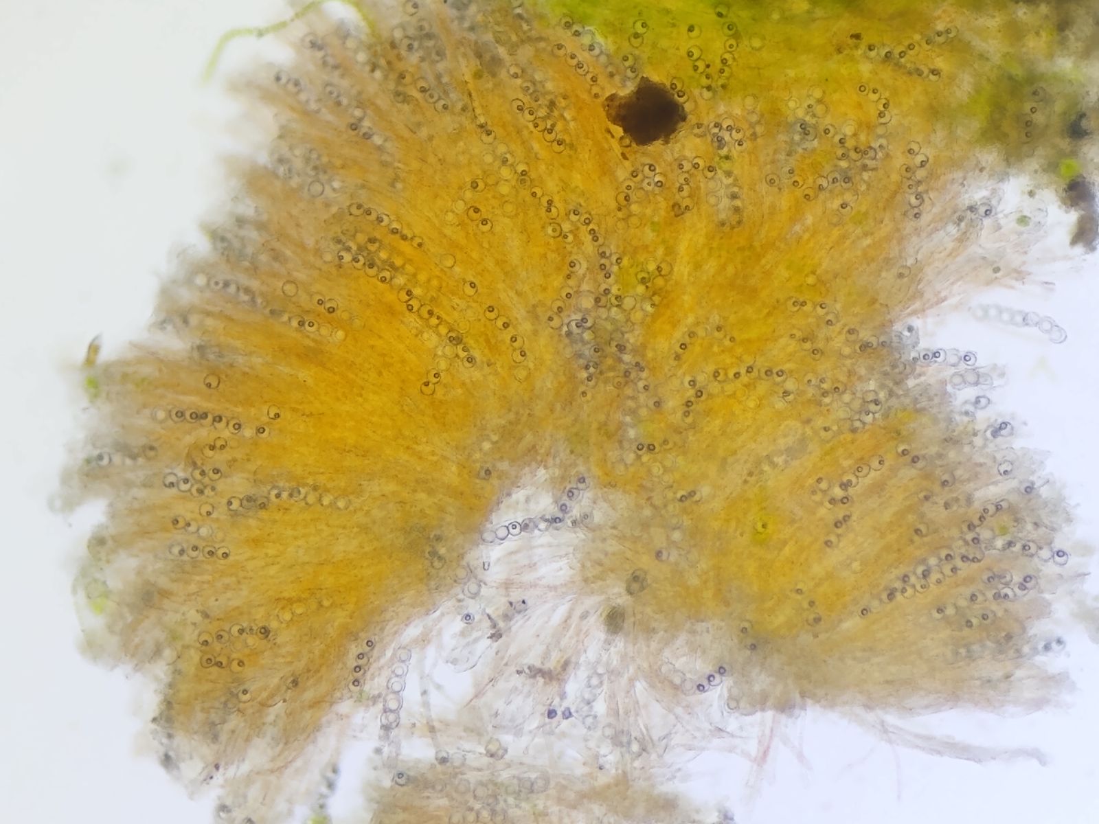 Bild 9 Quetschgpräparat in Wasser mit zahlreichen sporen-gefüllten Schläuchen und orangenen Paraphysen