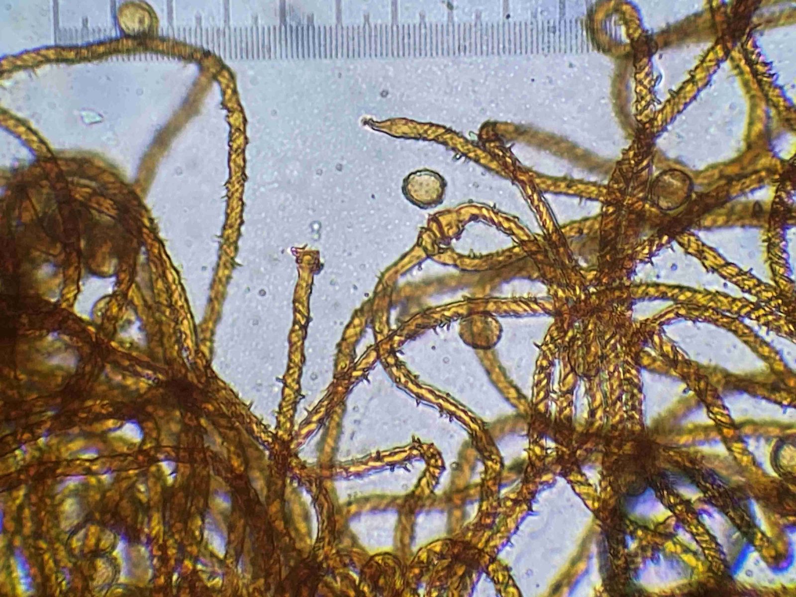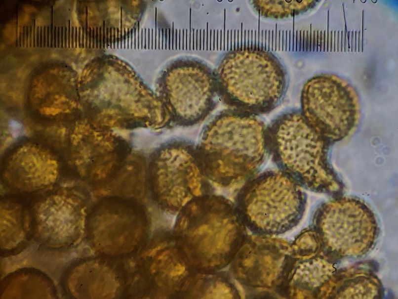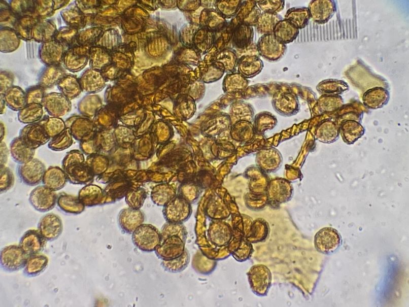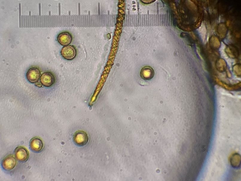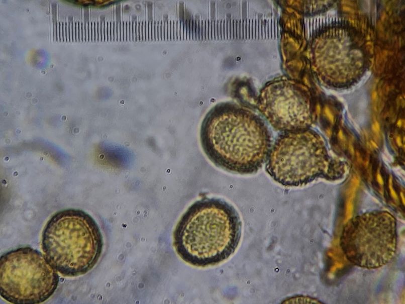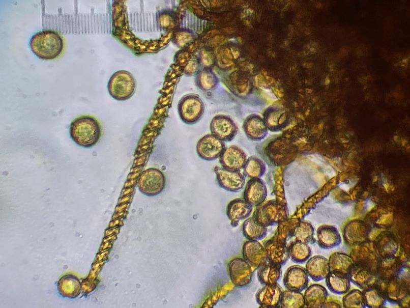Eine Verständnisfrage am Rande. Wenn in den Büchern steht „Sporen in Masse gelb“, ist dann die Farbe des Capillitiums zusammen mit den Sporen gemeint oder soll man die Sporen irgendwie ohne die Elateren aufsammeln? Und bei „im durchfallenden Licht“ meint man wohl im Lichtmikroskop in Wasser.