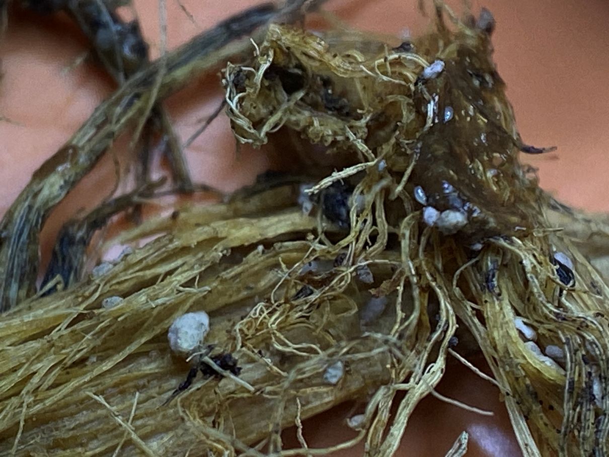 kann jemand diese Wurzelknöllchen-Pilze benennen? Es war eine sehr dickstängelige Pflanze (3 -4 cm Durchmesser an der Basis). Da es keine Stützwurzeln gab, schließe ich das Indische Springkraut aus. Es könnte eine Herkulesstaude gewesen sein. Für einen Wiesen-Bärenklau und Ähnliche war der Stängel eher zu massiv.