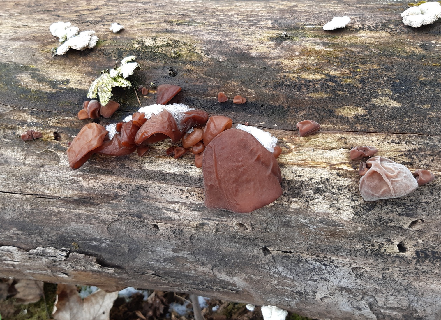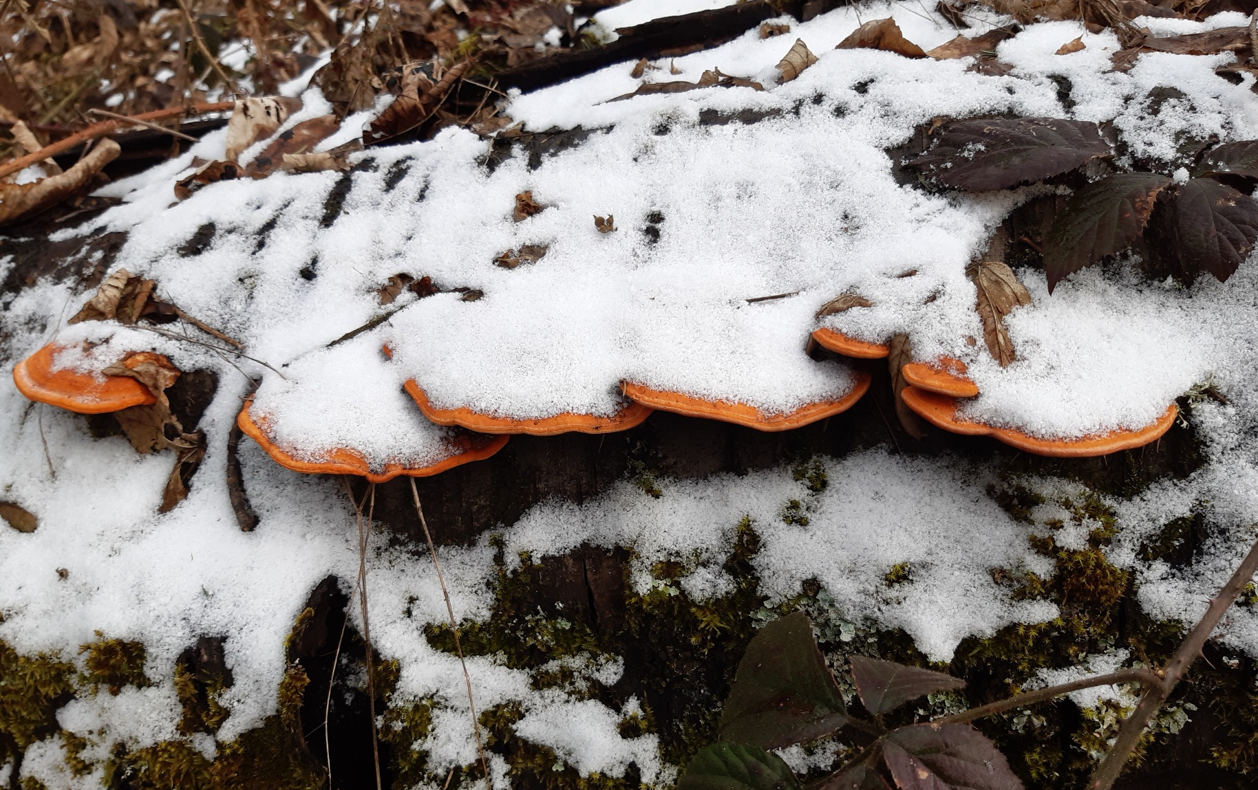 Porlinge, orangefarben, die größten Exemplare ca.15-18cm Durchmesser und 1,5cm dick. Feste Konsistenz, ähnlich der Konsistenz junger Birkenporlinge. Porenschicht rot.
