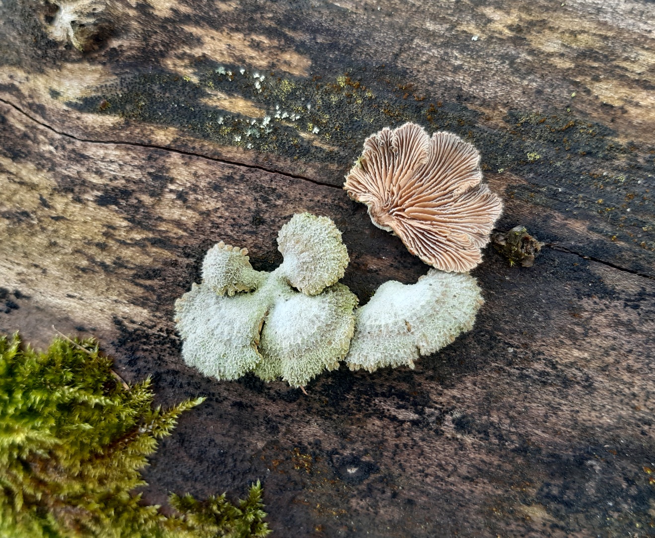 Durchmesser ca.bis 4cm, ca.2-3mm dick, Oberseite weißgrau, samtig bis rau, mit striegeligem/stachelartigem Rand. Unterseite beigefarbene, gegabelte Lamellen.