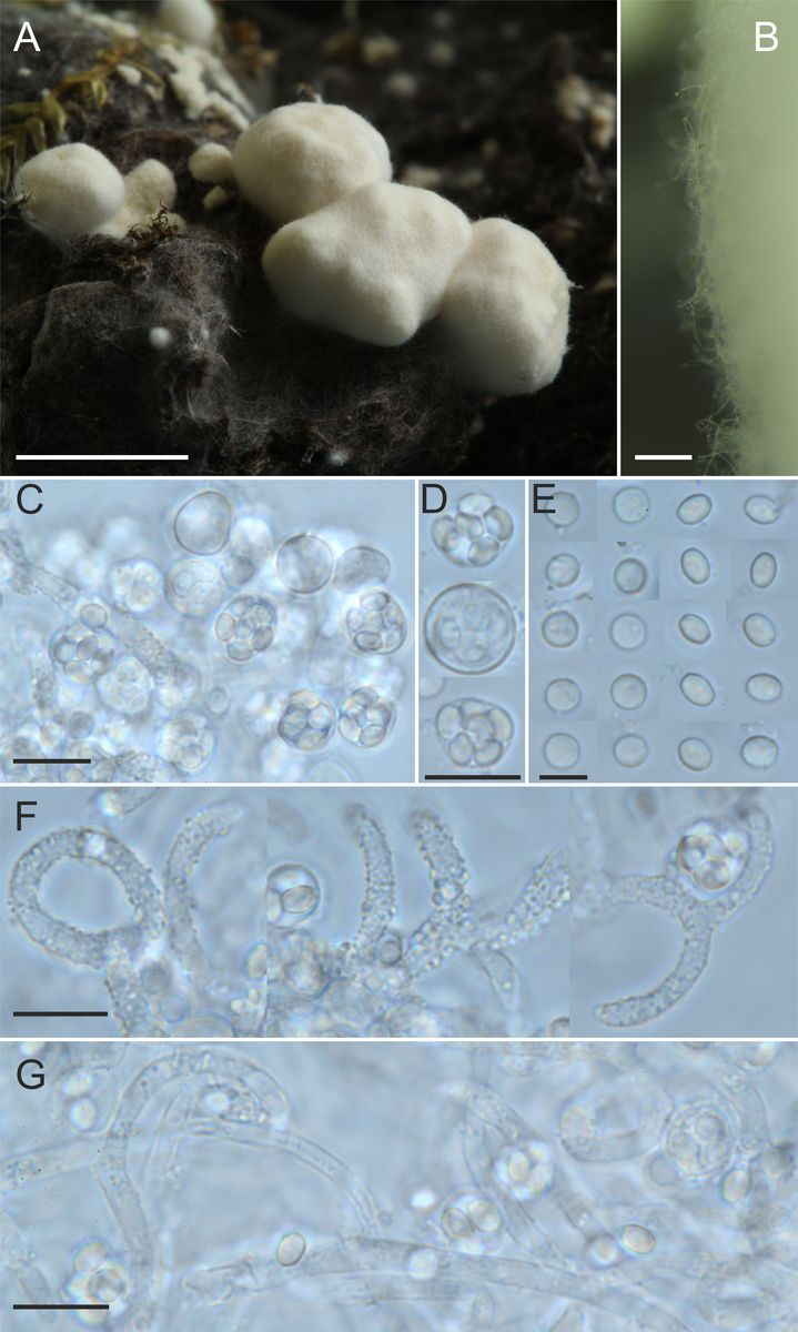 Abb. 1: Gymnothecien (A), Gymnothecienrand (B), Asci im Verband und separat (C, D), Ascosporen (E), Hyphen (F,G), Skala A - 0,5 cm, B 100 µm, C, D, F, G - 10 µm, E - 5 µm