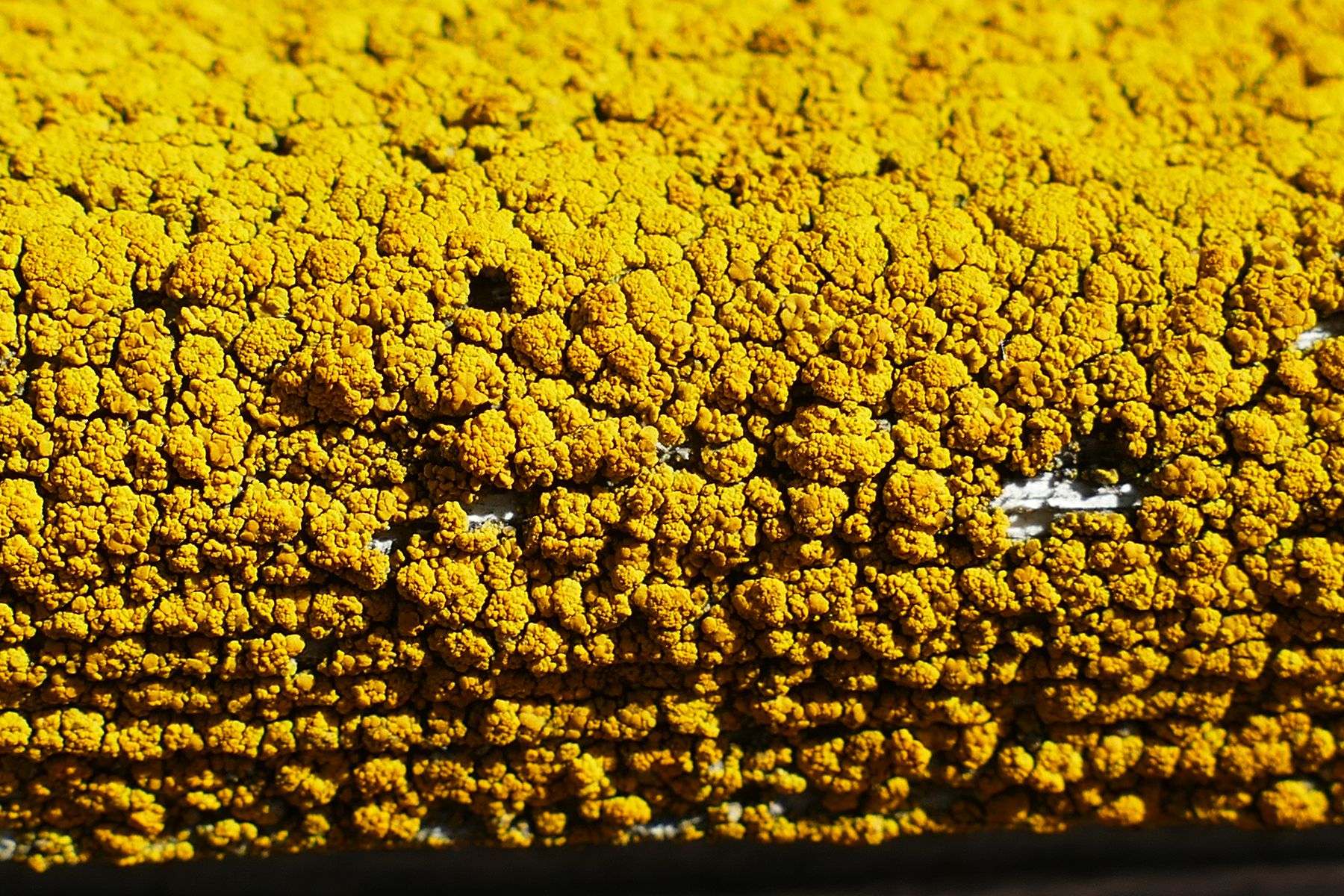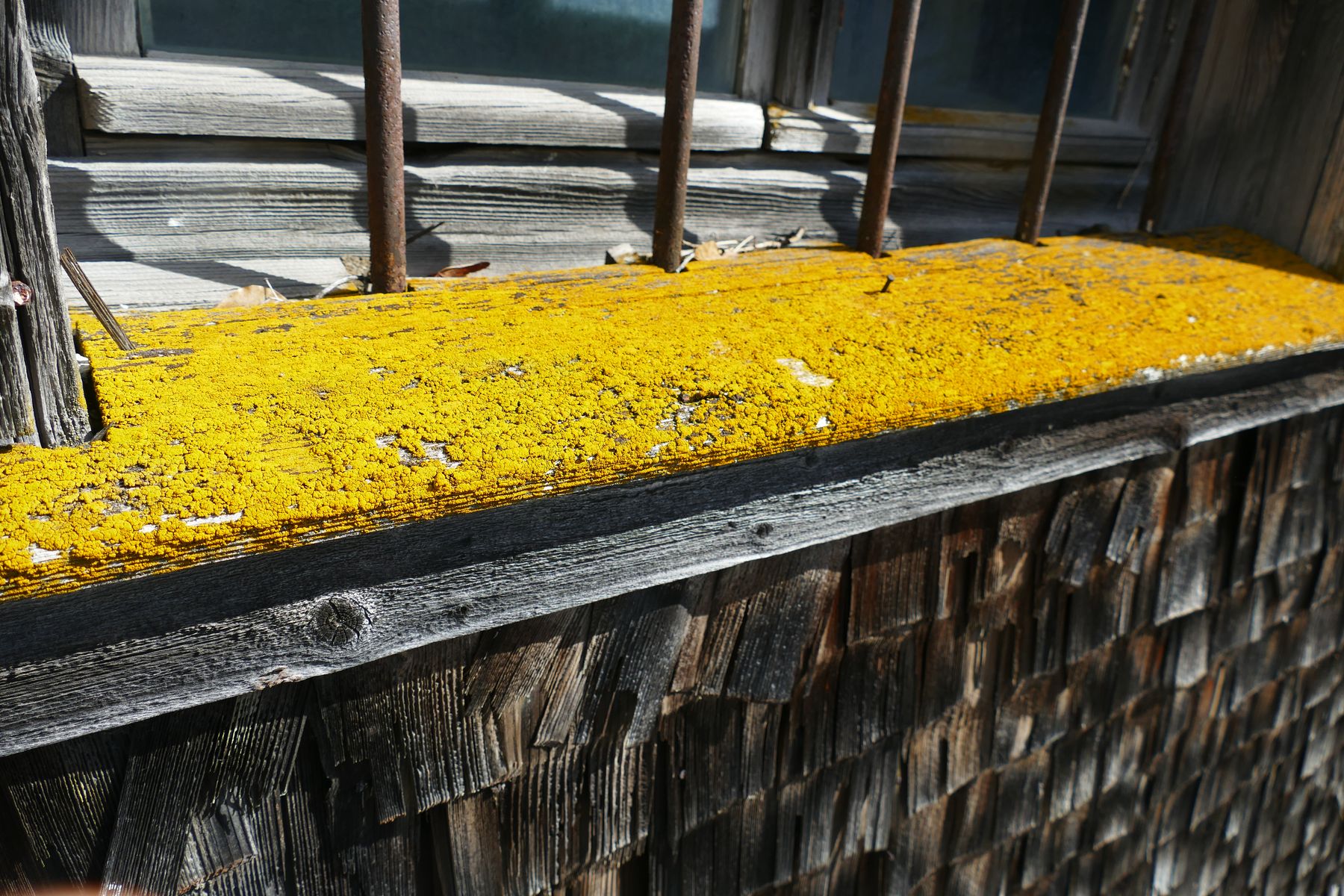 Von Weitem schon kann man einen knallgelben Bewuchs auf den Holzschindeln, besondes stark aber auf den Fensterbänken erkennen.