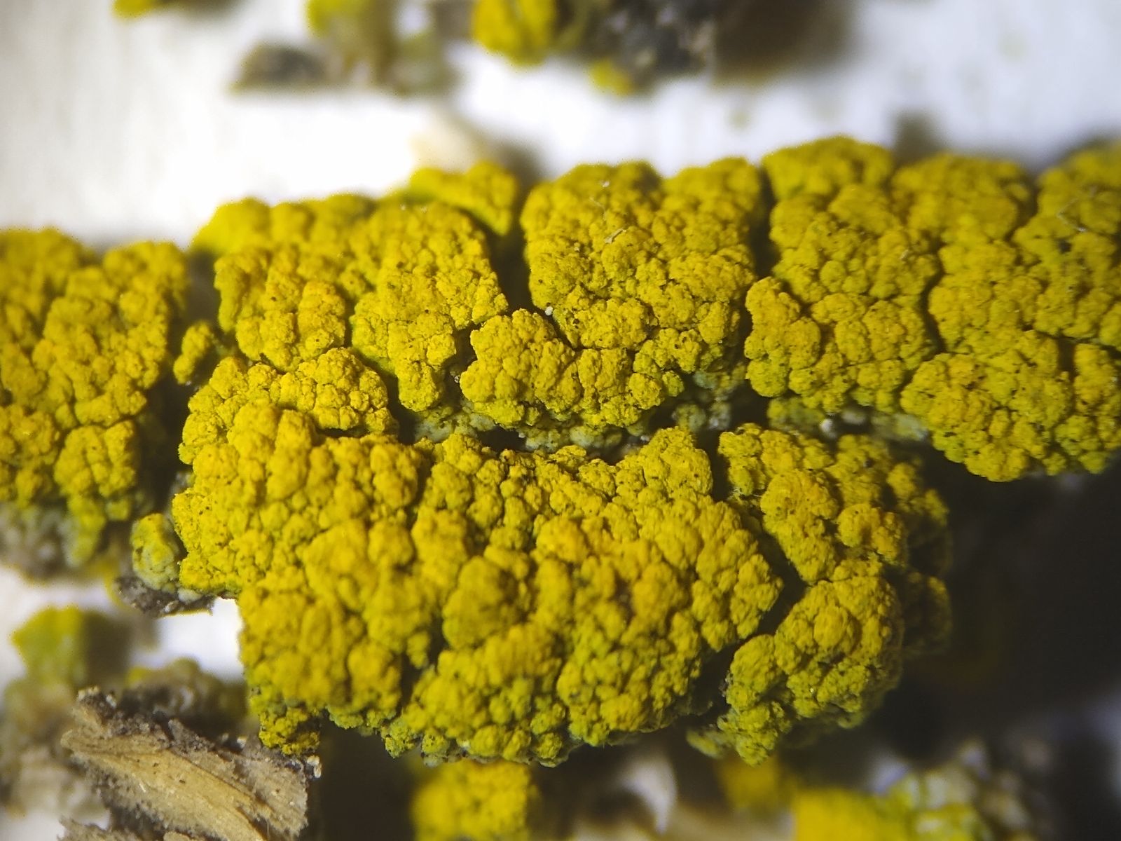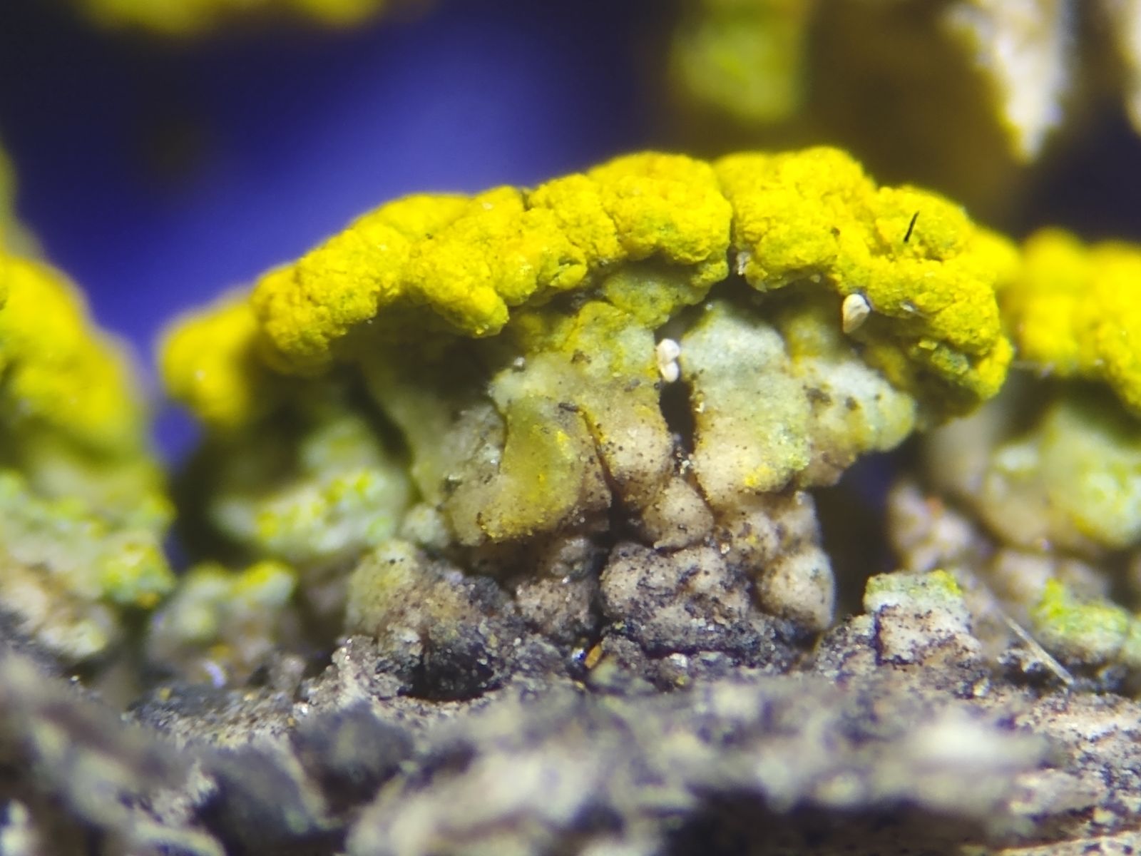 Die gelben Thallusareolen sind um 0,3mm groß, die Apothecien bis 1 mm.