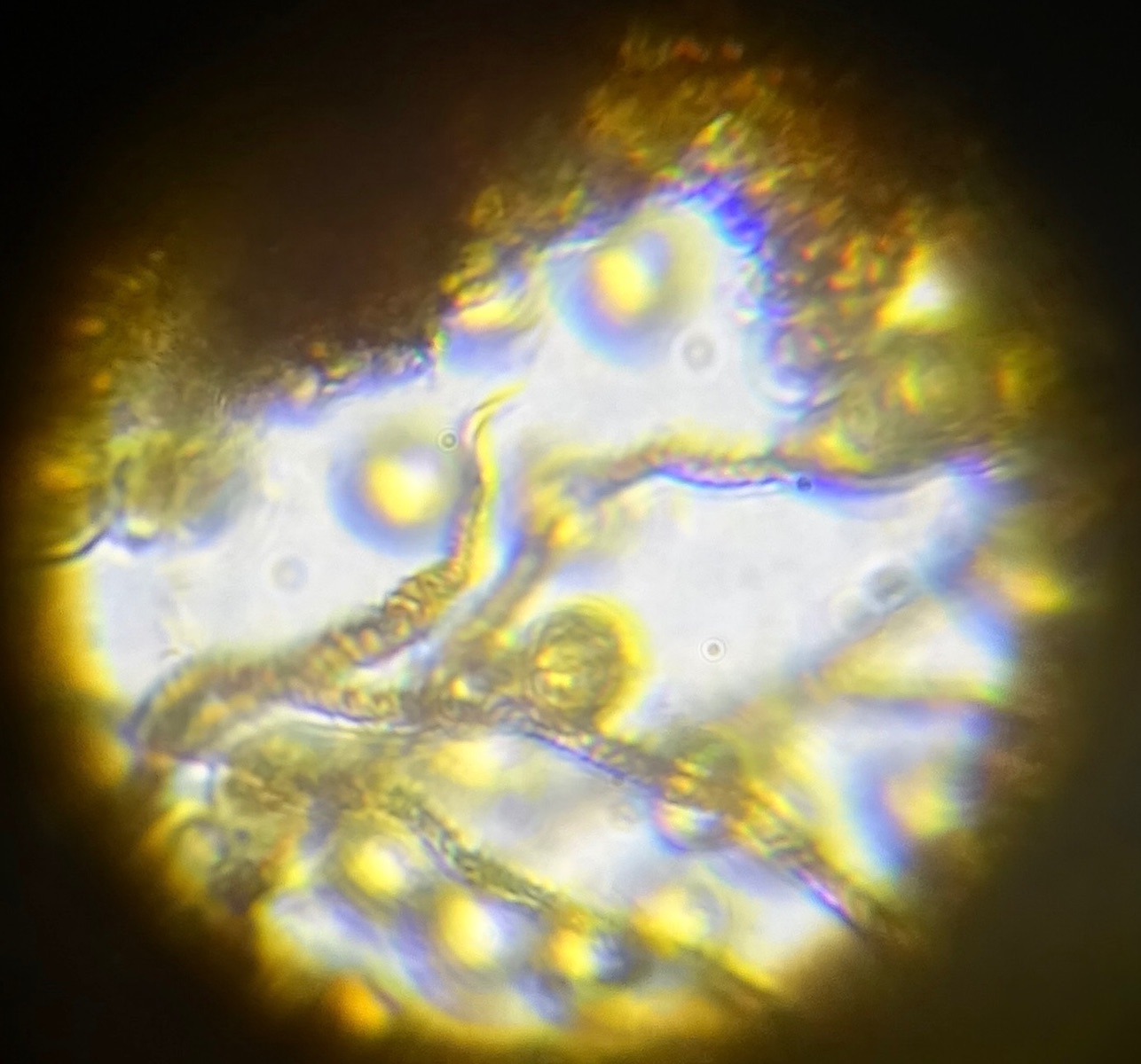 Bei Fotografieren durchs Mikroskop sollte man die Ebene scharf stellen auf die es ankommt. Das ist bei der Erkennung der Sporenornamentation wichtig. Ohne Stacken bekommt man nie komplett scharfe Bilder.