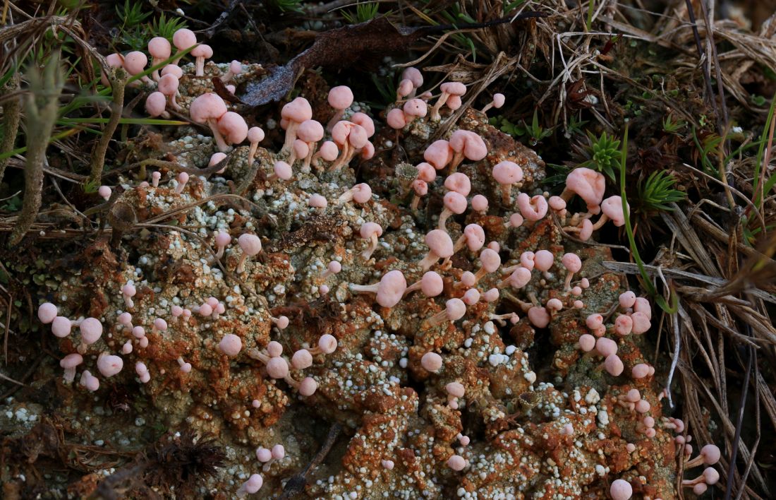 also ich sehe hier Baeomyces rufus. Im Fichtelgebirge eine der recht häufig zu begegnenden Flechten an erdigen Wegböschungen, etc. Ist aber immer wieder ein Hingucker.