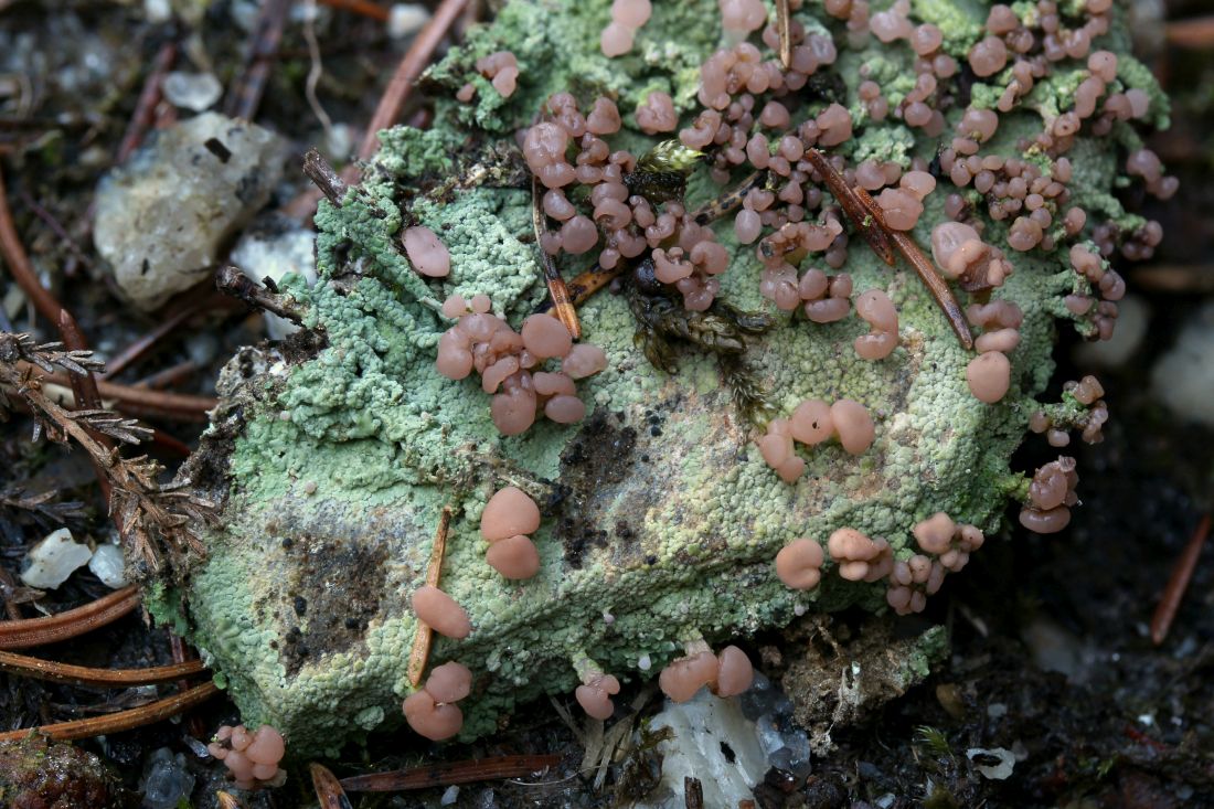 also ich sehe hier Baeomyces rufus. Im Fichtelgebirge eine der recht häufig zu begegnenden Flechten an erdigen Wegböschungen, etc. Ist aber immer wieder ein Hingucker.