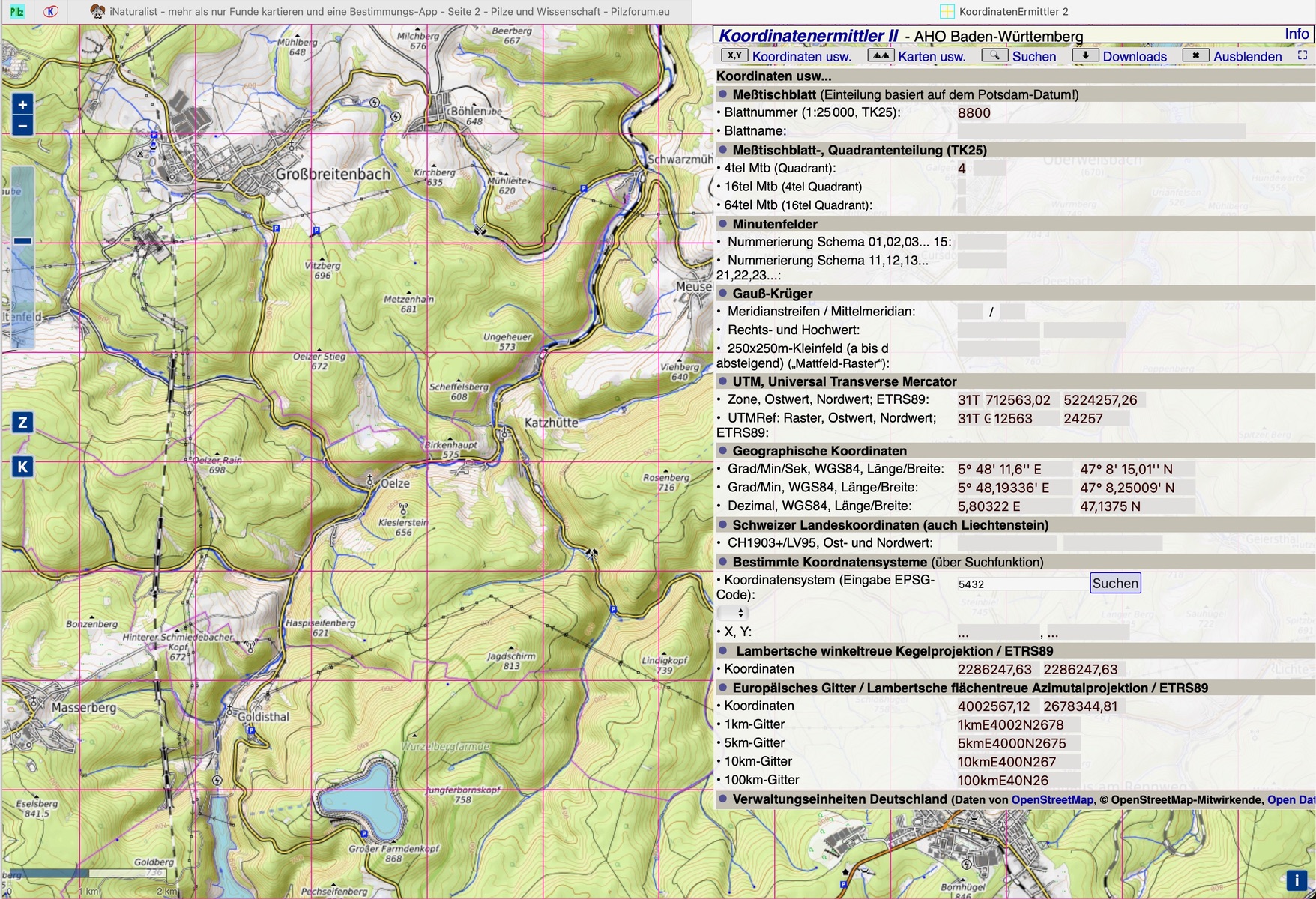 (1) Erst im Schriftfeld ganz oben mit "Koordinaten" beginnen – den gewünschten Punkt auf der Karte anklicken = Nadel setzen und ablesen, hier im Beispiel Blattnummer 7625, darunter kommen die Quadranteneinteilungen 1 - 13 - 133. Wenn Du hier im Schriftfeld nach unten scrollst, kommt auch noch die Meereshöhe, Entfernungen zu den umliegenden Orten und so manches mehr.