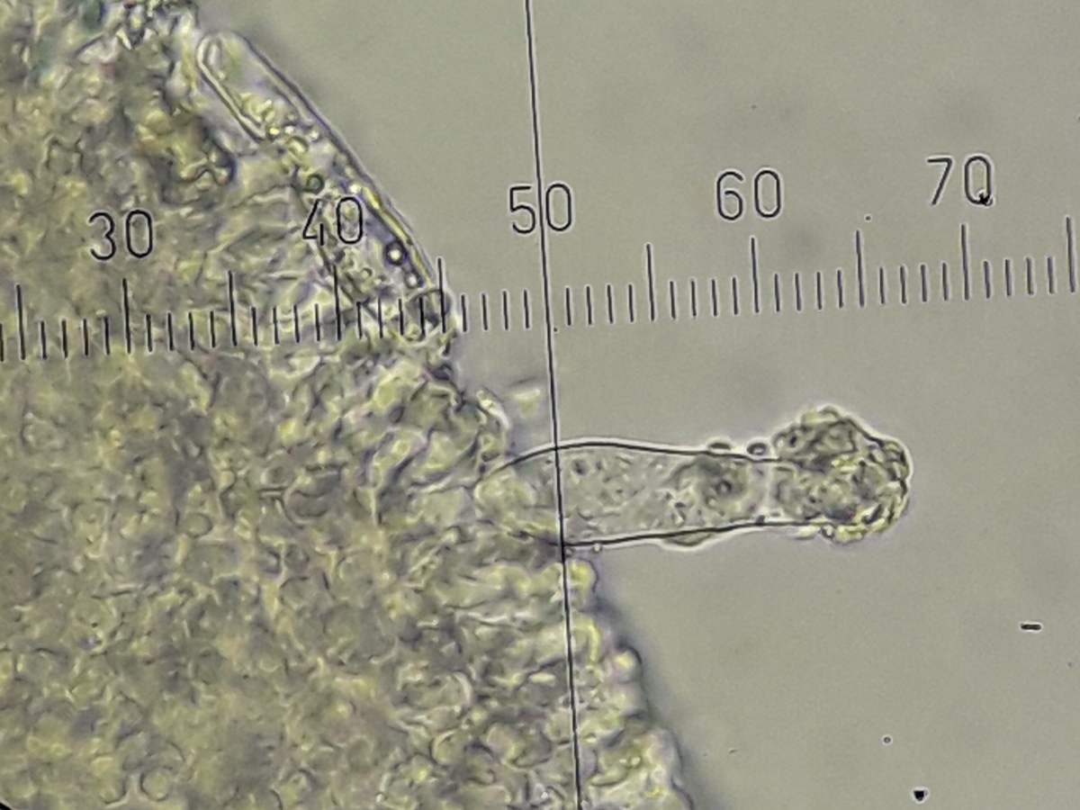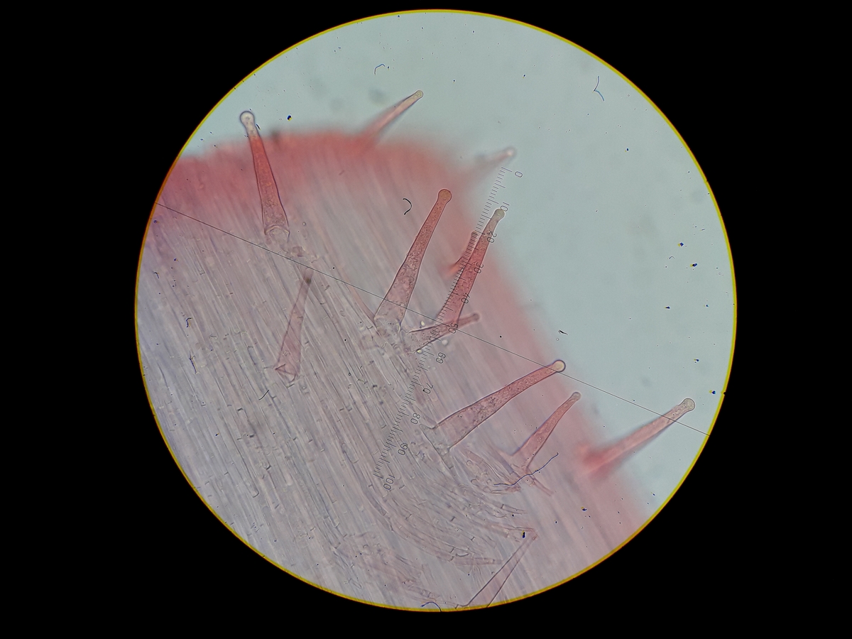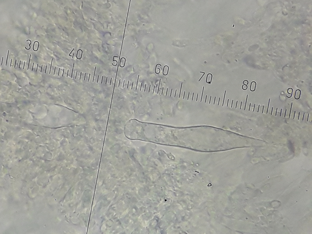 Ich mikroskopierte und fand sehr lange Caulozystiden (>100 Mikrometer).