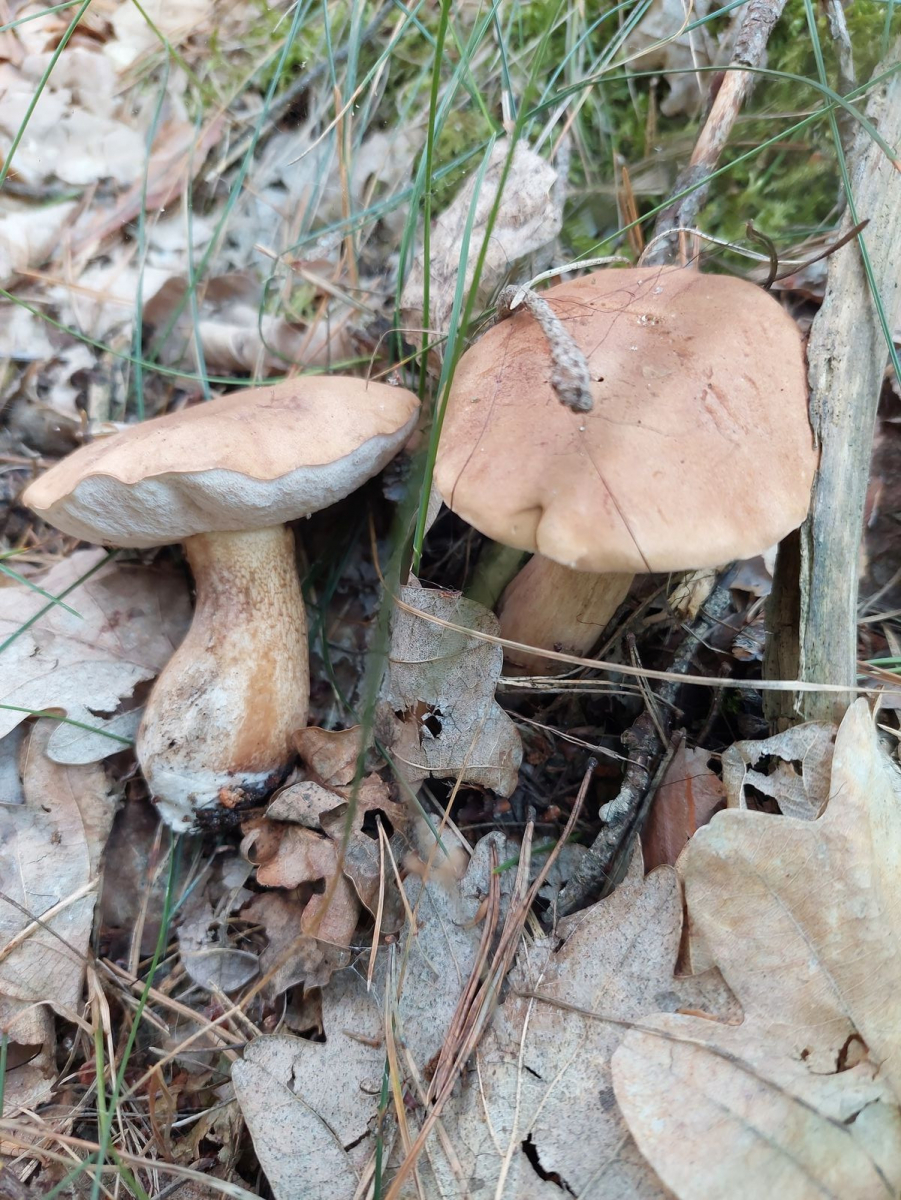 Diese haben sehr große Hüte im Vergleich zum Fuß, und weiche olivgrüne Schwämme, deutet für mich eher in Richtung Marone (Farbe passt nicht) oder eher Kiefernsteinpilz hin,