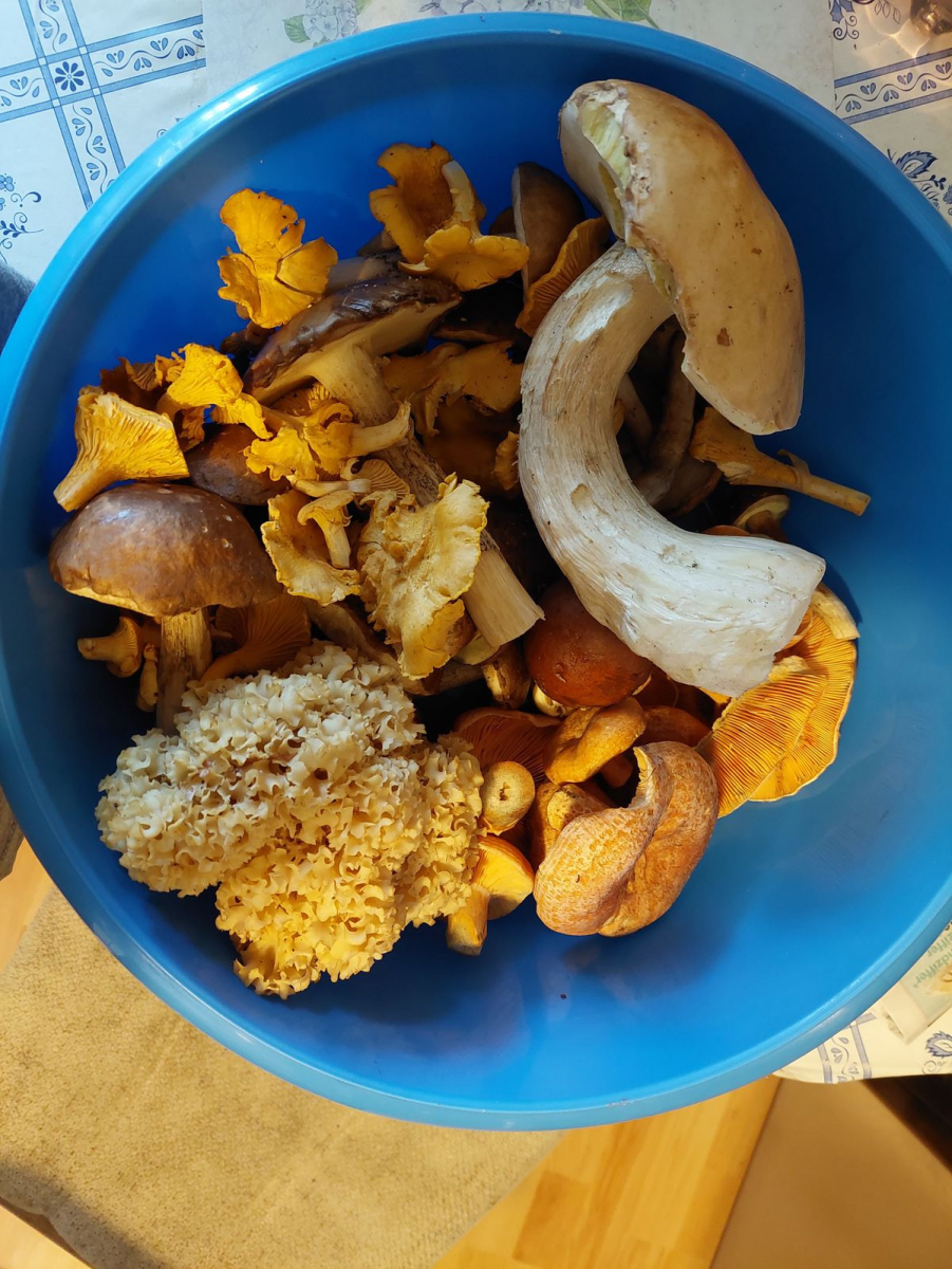 Bei mir im Barnim gab es verschiedene Reizker Arten, die Pfifferlinge bekommen ihren zweiten Frühling, ganz viele, frisch gewachsen und ohne jegliche Trockenschäden. Fliegenpilze ( meine Lieblingspilze) in Massen, daneben schöne Steinpilze. Butterpilze, haufenweise Birkenpilze noch eine tadellose Krause Glucke. Im Wald laufen die Folgezersetzer zur Hochform auf. Sehr viele Rose Rettichhelmlinge und viele Cortinarien, wo eine Bestimmung der Art für mich schwierig ist. Die wachsen unter Kiefern genauso wie unter Eichen oder im Mischwald.
