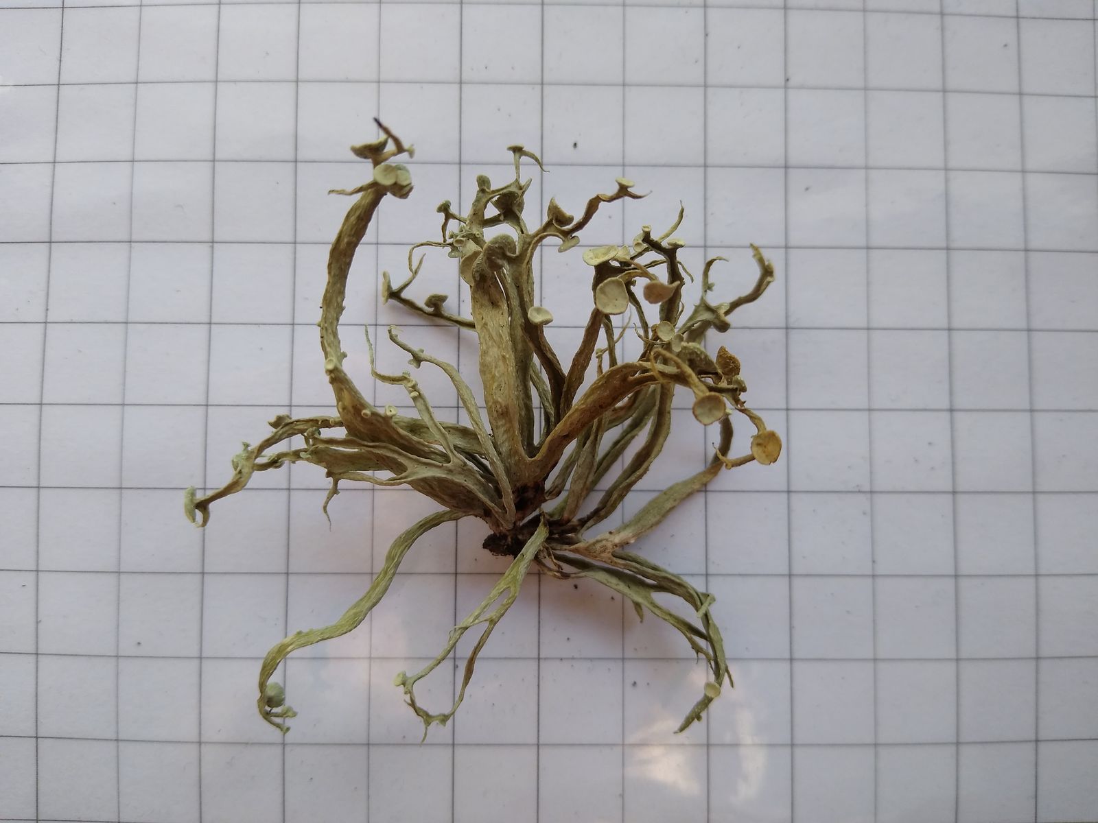 Der Flechtenthallus besteht aus vielen, etwa gleich langen Bändern, an deren Enden und Seiten Apothecien stehen.