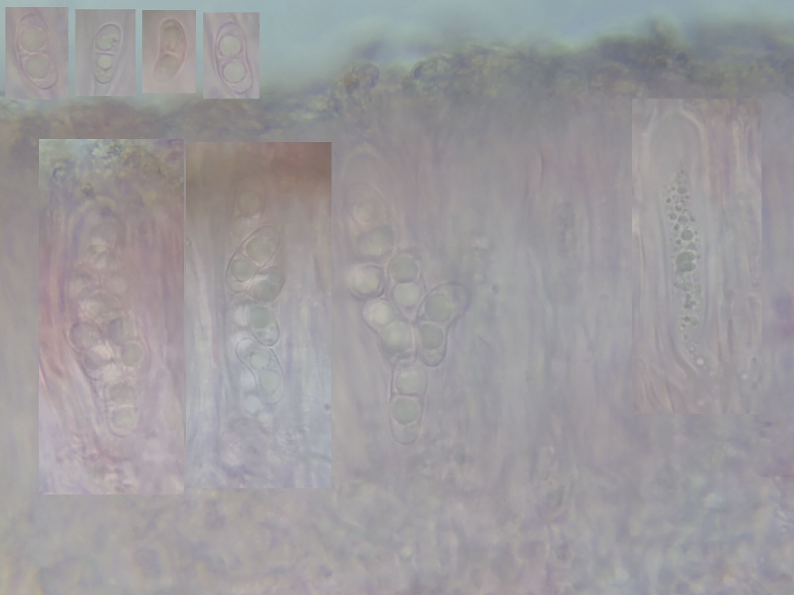 Die Asci beherbergen 8 hyaline, 2-zellige Sporen, mit je einem großen Tröpchen pro Zelle
