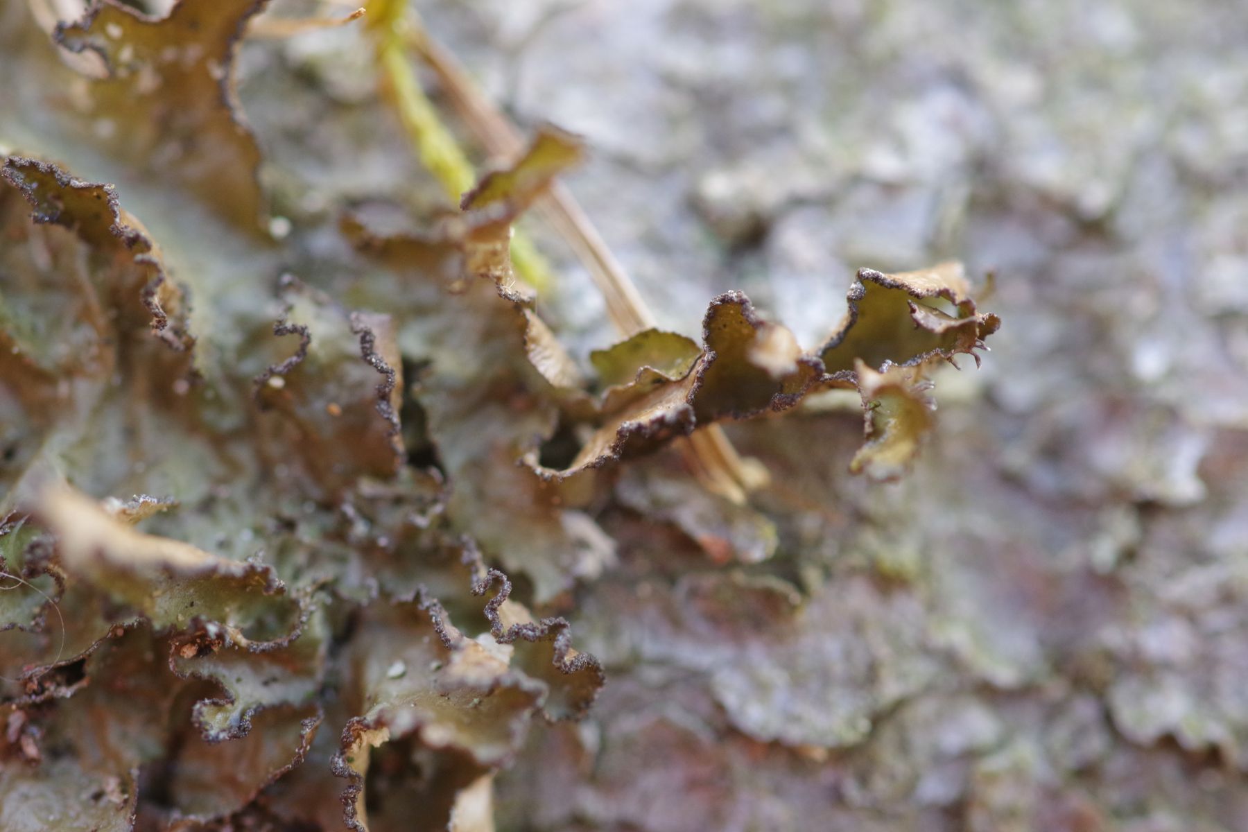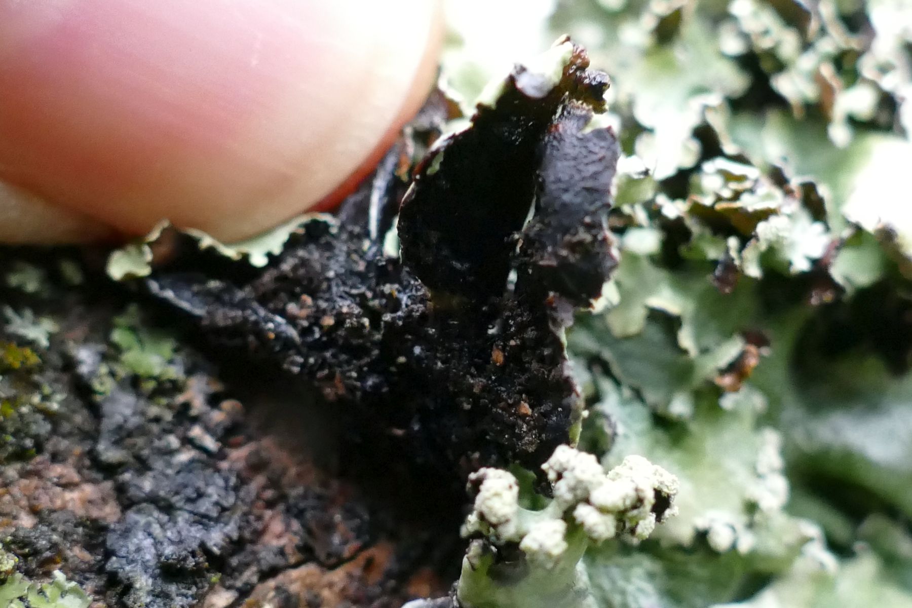 bie 3) war ich bei Pleurosticta wegen der grellgrünen Farbe, die bei Feuchtigkeit typisch ist - die Bilder stammten vom verregneten Do. Diese Flechte finde ich jetzt nicht mehr, trocken und damit vermutlich unauffällig gefärbt. Pl. acetabulum ist bei mir recht häufig, allerdings eher an Laubbäumen. Allerdings sehen bei genauerer Betrachtung die Ränder doch anders aus. Noch mal in Vergrößerung im feuchten Zustand vom 23. Sogar mit Rhizinen rechts. Der Dicke des Stämmchens nach stammt die aus mindestens 15 m Höhe.