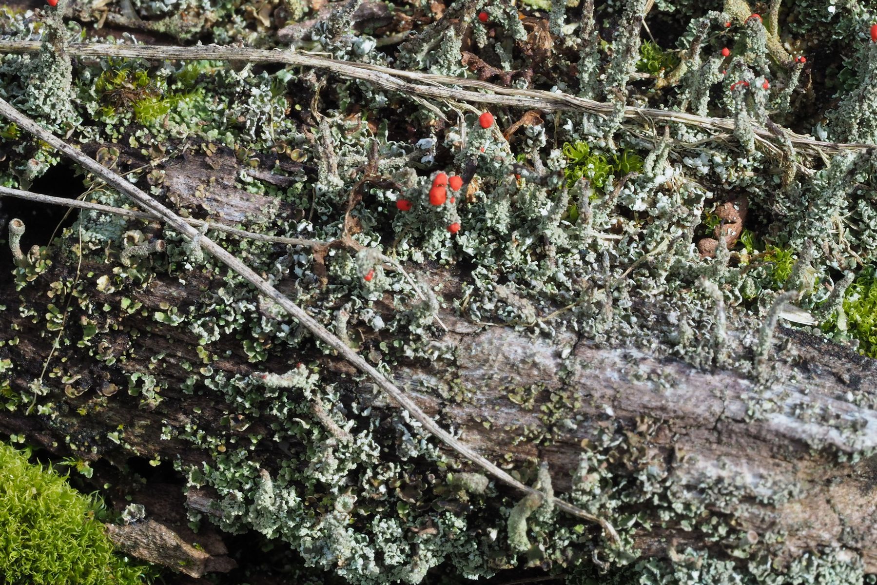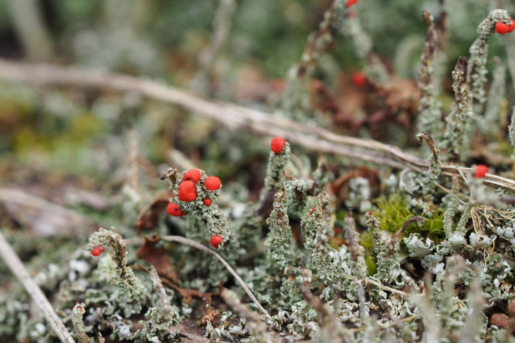 Bei 123pilze habe ich mal unter Flechten nachgeschaut und vermute, dass es sich um die Rotfrüchtige Säulenflechte Cladonia Macilenta handelt.